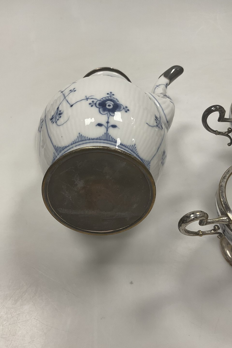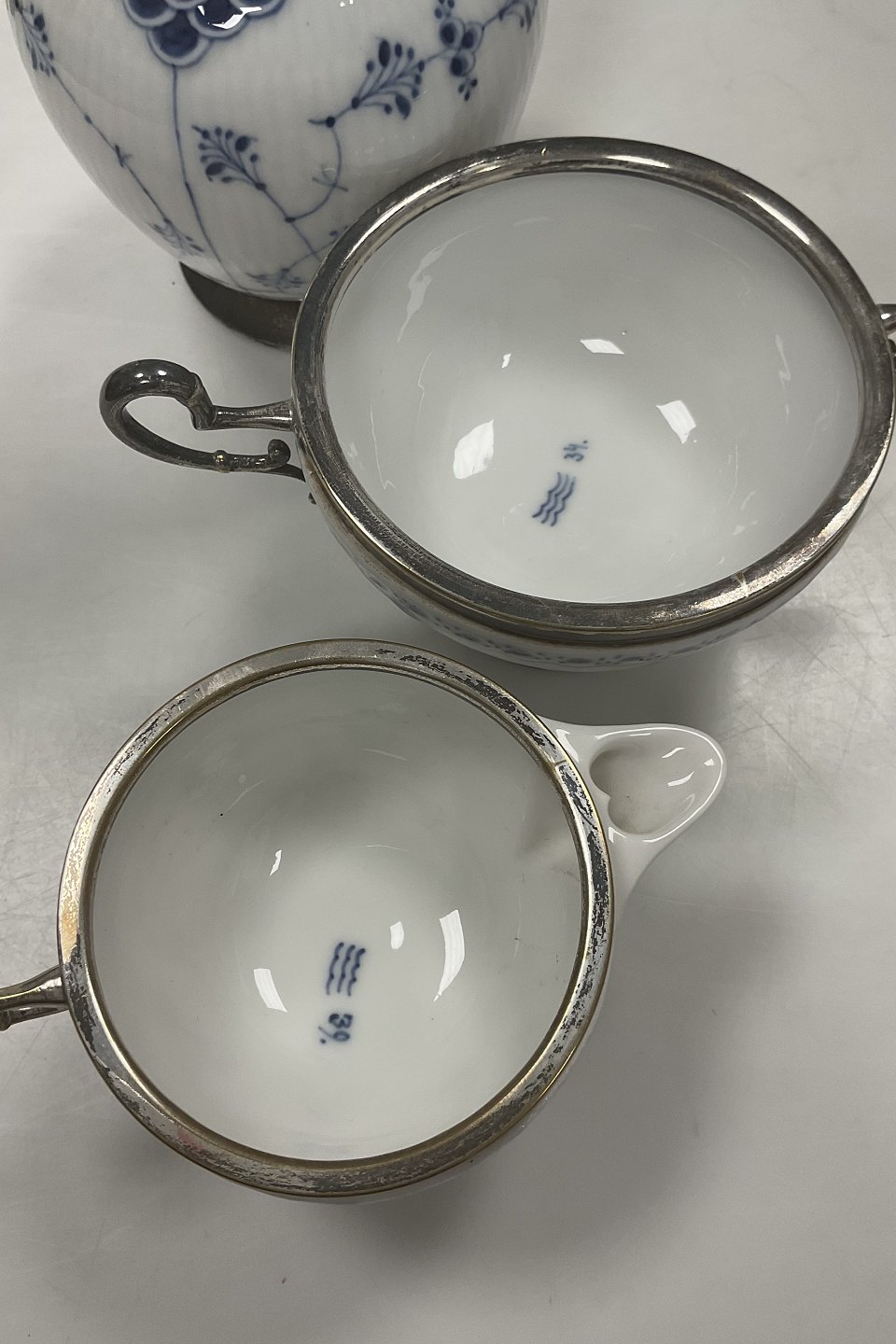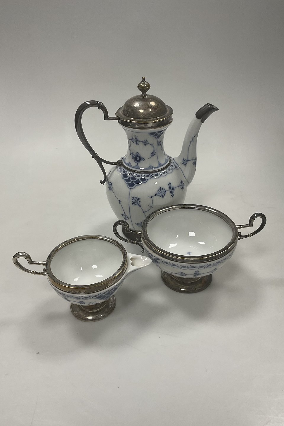 Beskrivelse: Royal Copenhagen Halvblonde Kaffekande, flødekande og sukkerskål med metal montering