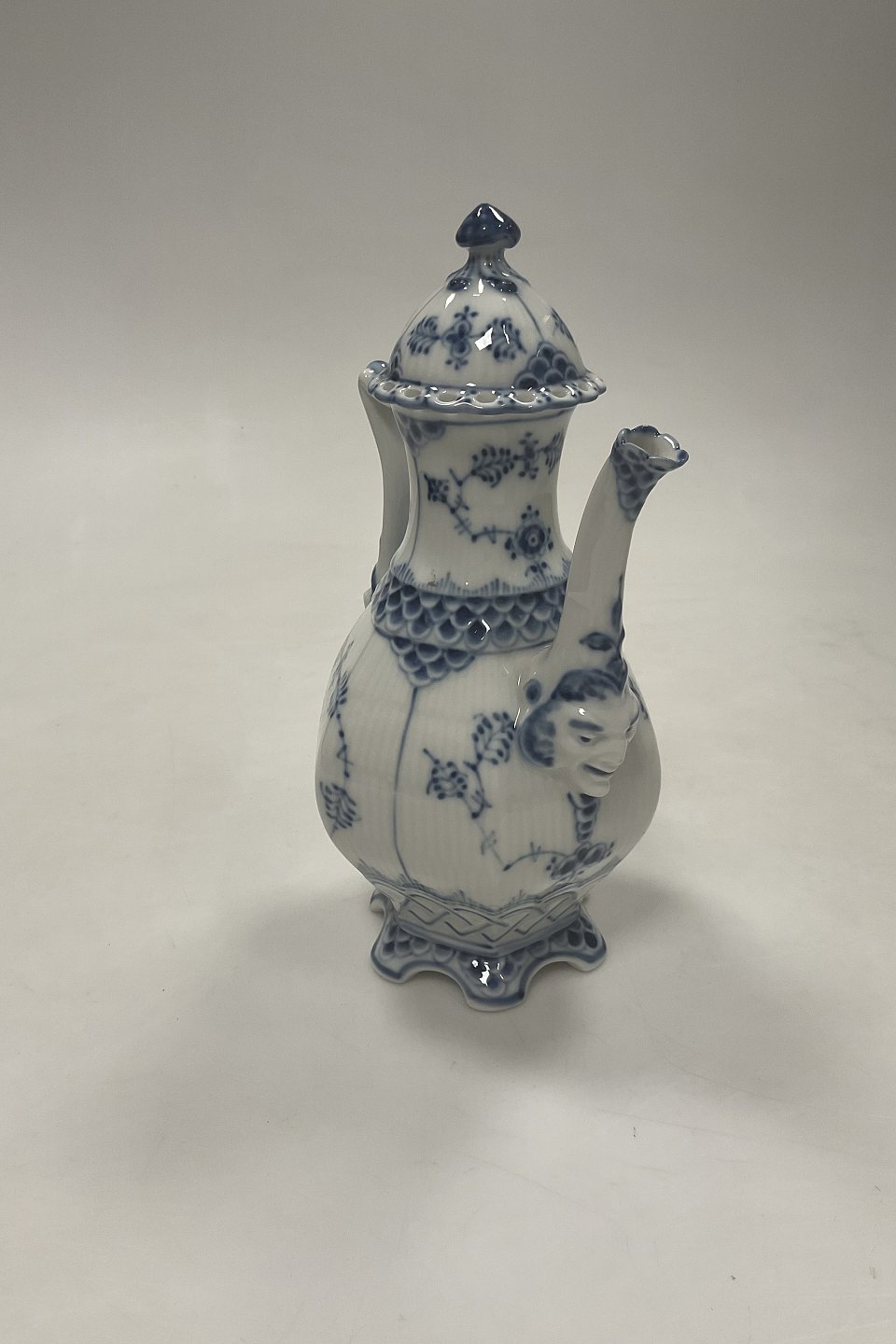 Beskrivelse: Royal Copenhagen Musselmalet Helblonde Lille sekskantet kaffekande No. 1030. 1. sortering. Måler 21 cm (8 17/64 in.)