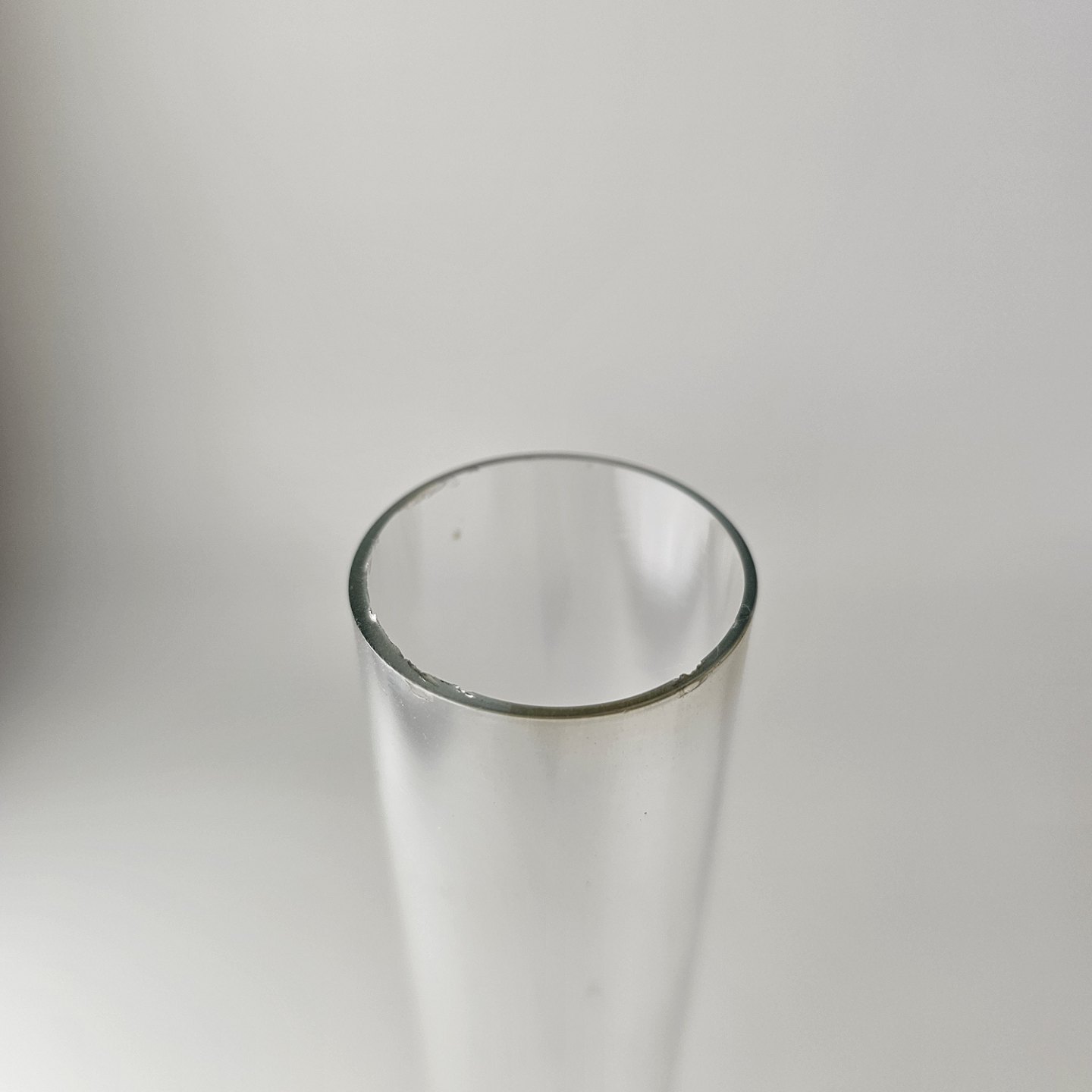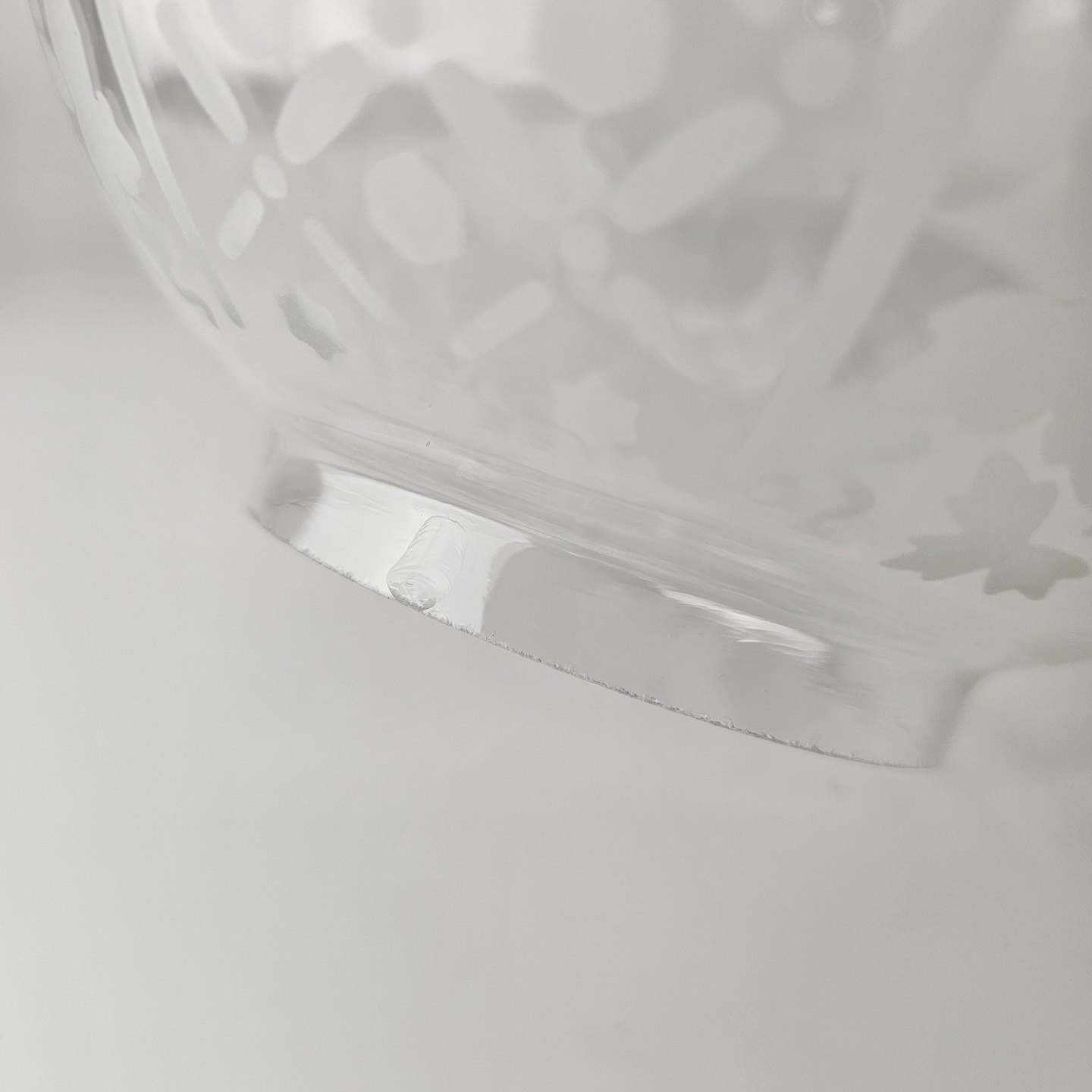 Beskrivelse: Glas ravfarvet petroliumslampe til bord model Dagmar Maxi med glasrør og rund kuppel i klar glas. Lille afslag på kuppelskærm i fod, som ikke ses.