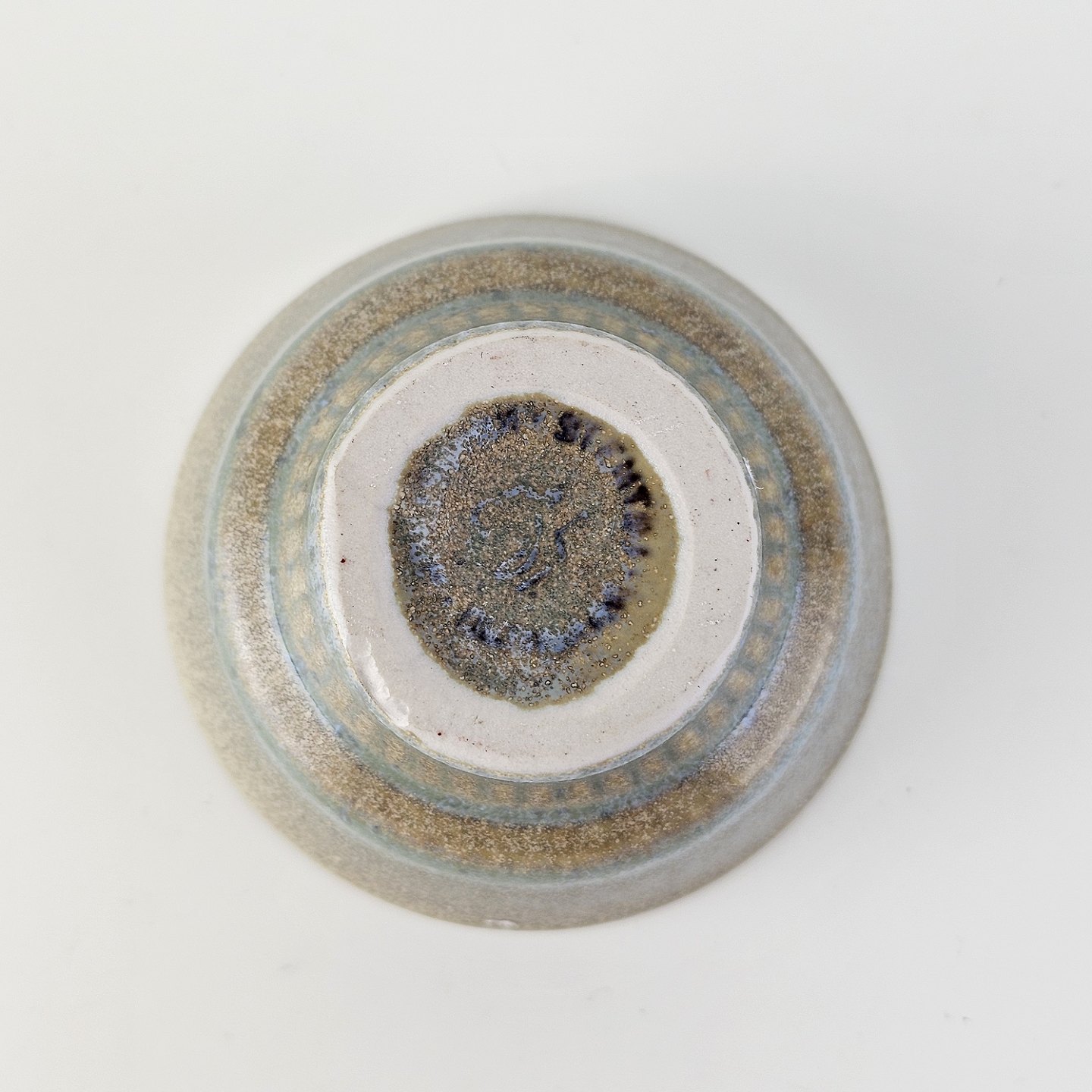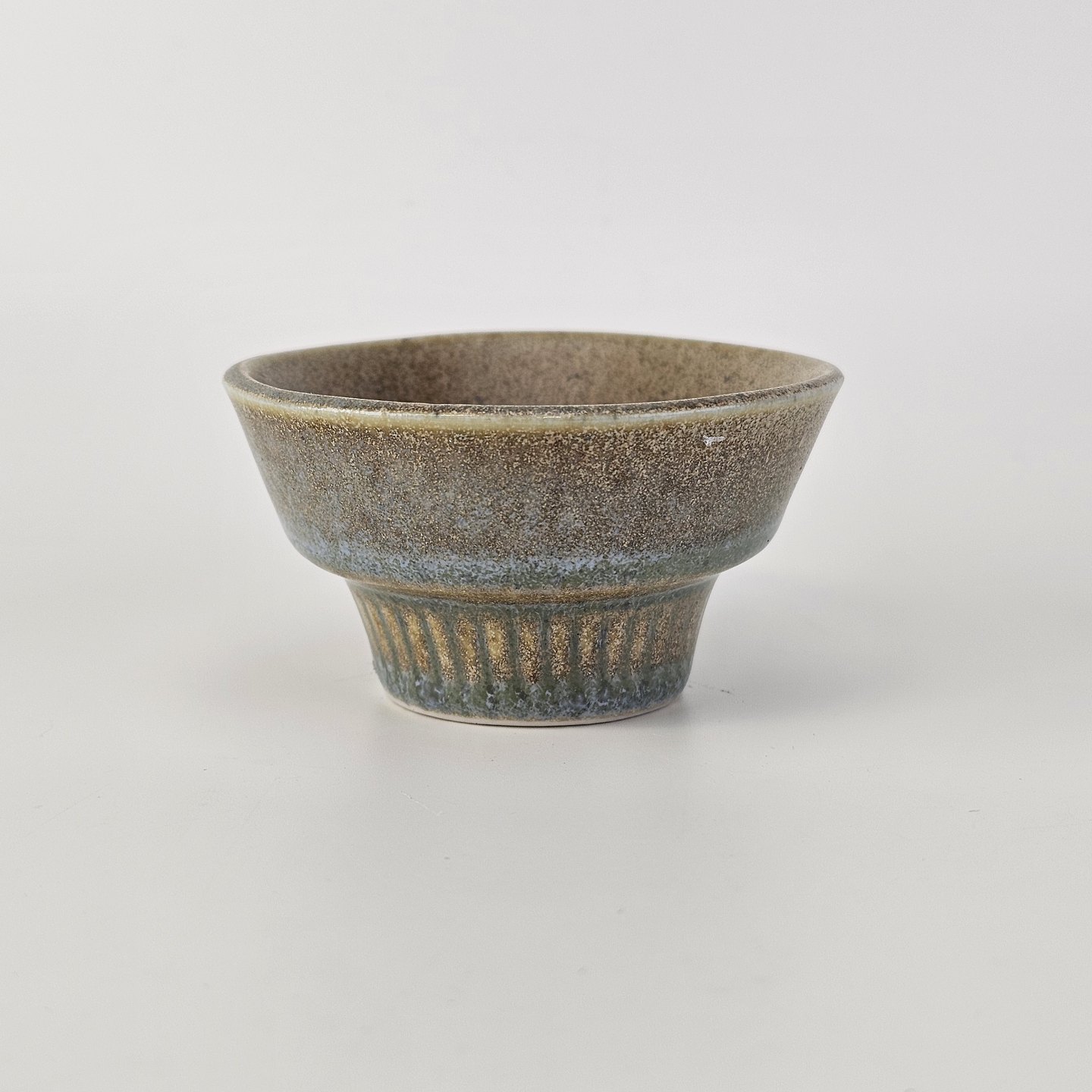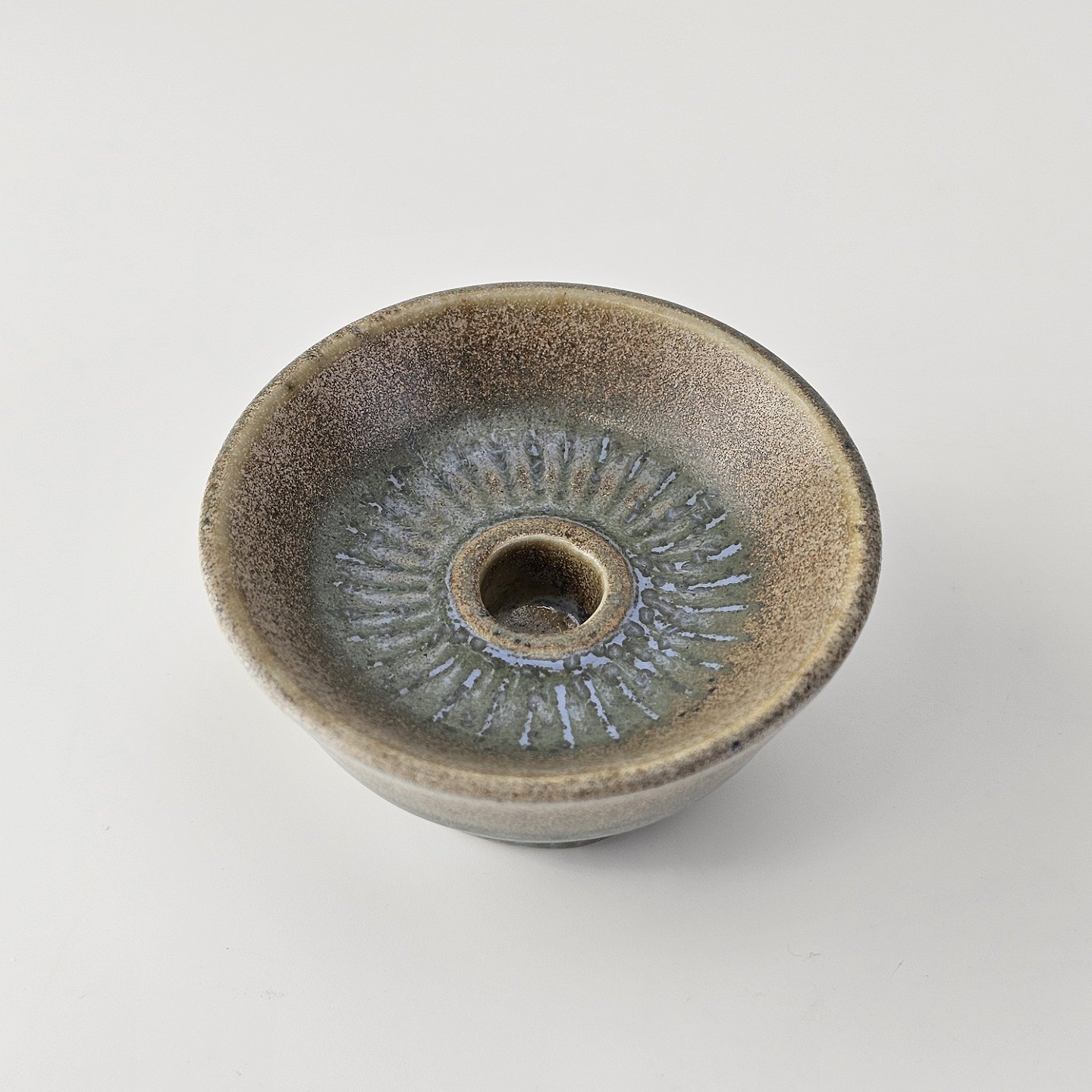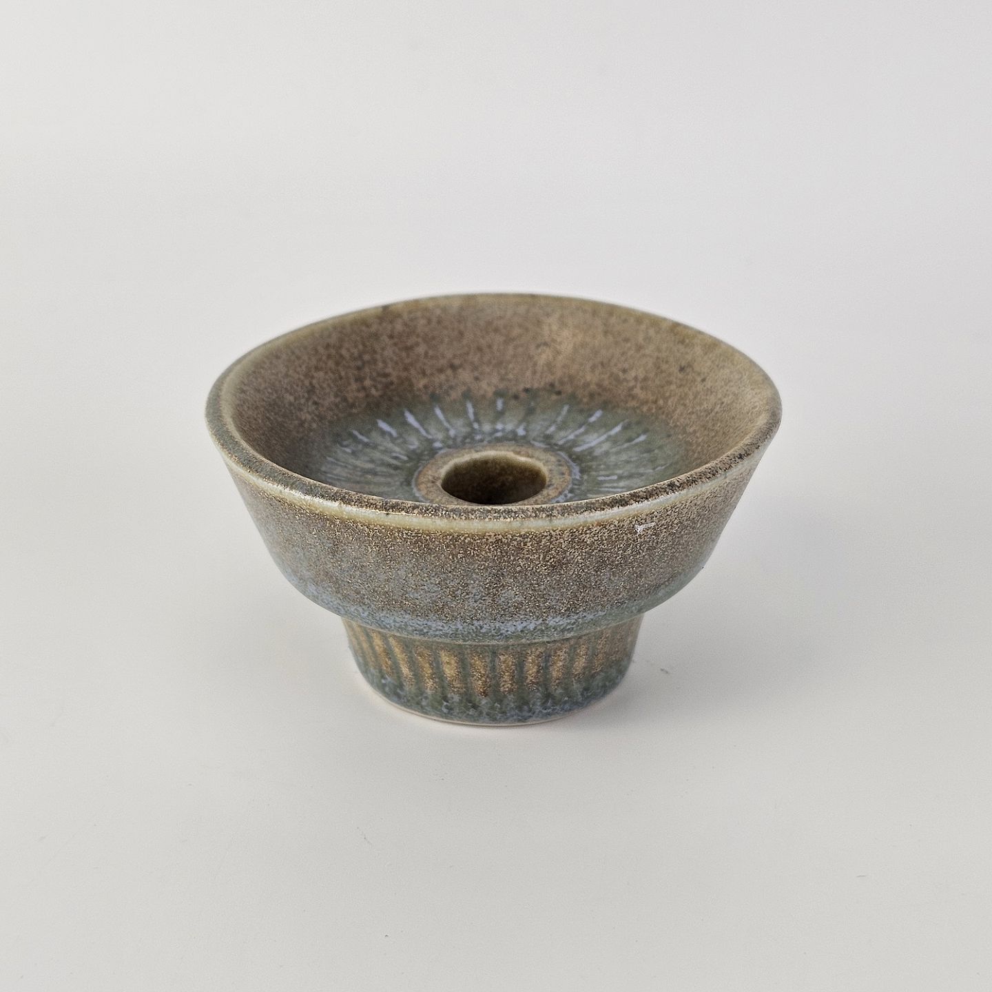 Beskrivelse: Lysestage af stentøj og dekoreret med en grønlig nuance glasering.