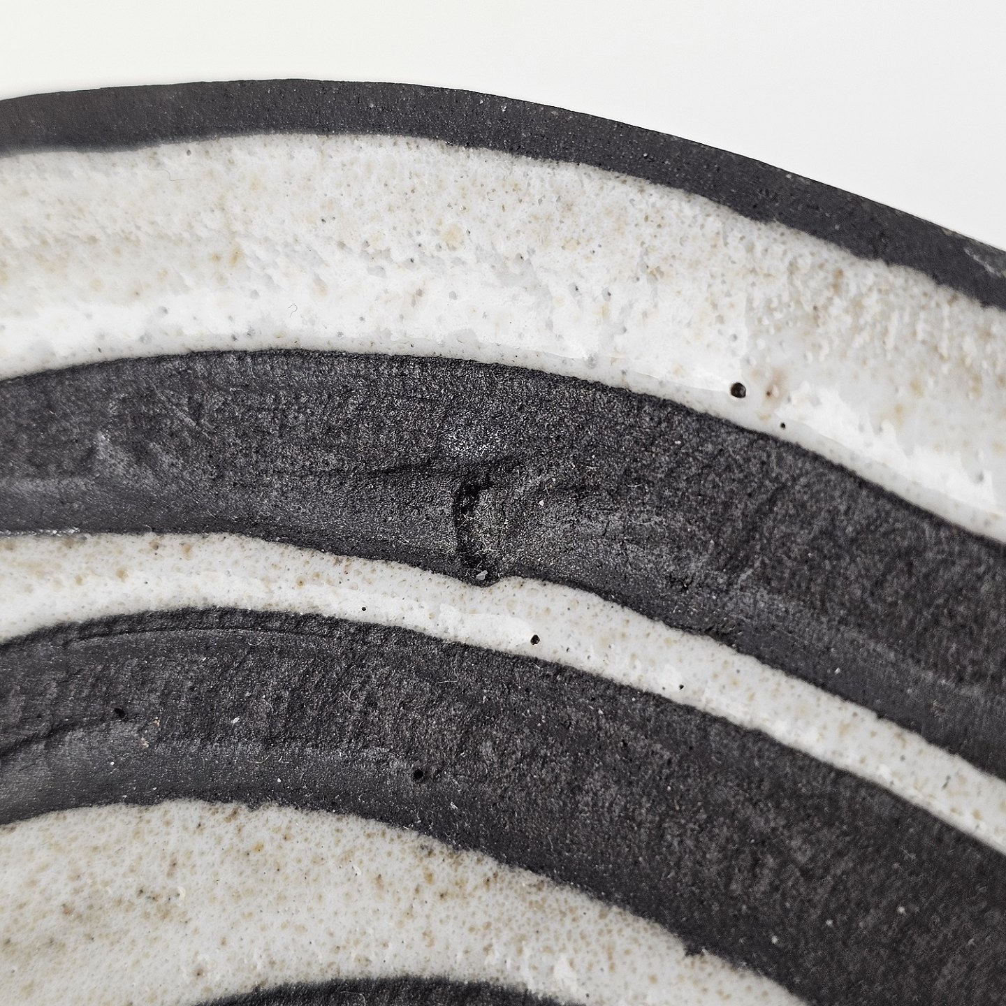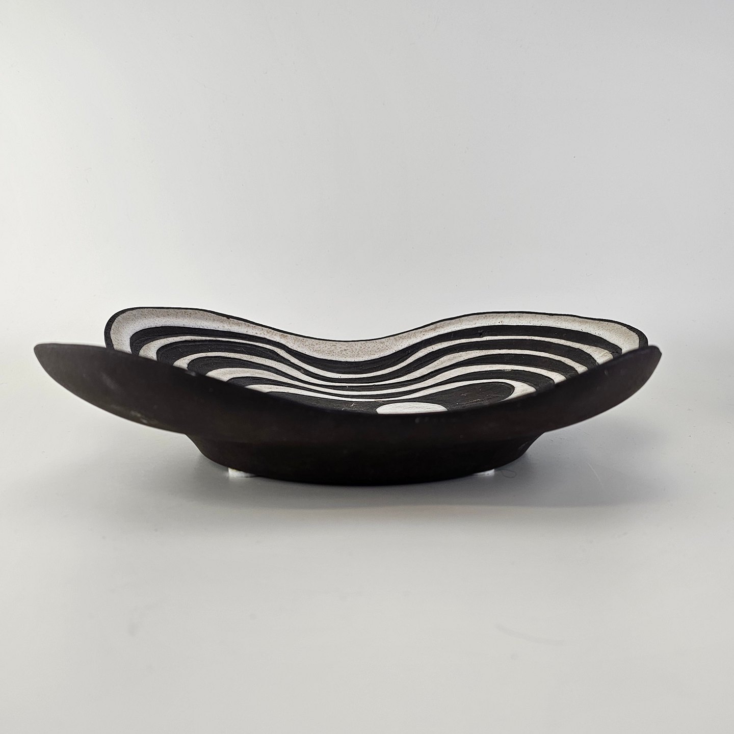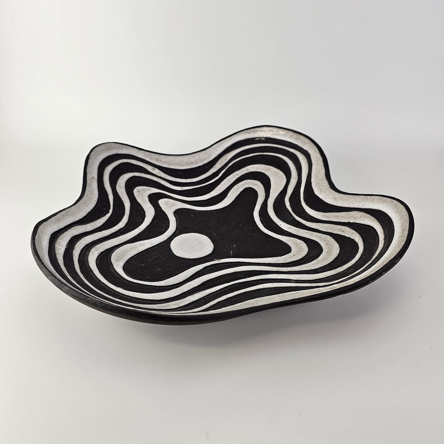 Beskrivelse: Fad i keramik fra Negro serien med abstrakt motiv på mørk baggrund. Nr. 5608-2
