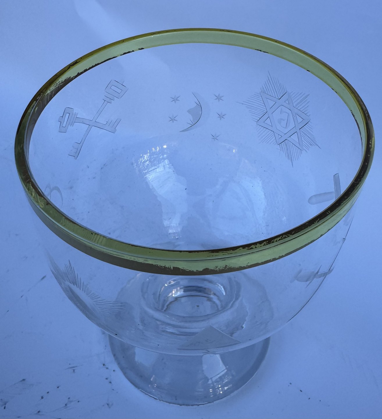 Beskrivelse: Stort glas med guldkant. Et fint glas til f.eks. øl. Stående på kraftig fod. Indgraverede frimurer symboler rundt om glasset. Fremstår i god stand. Formodes fremstillet i 1930’erne. H. 14 cm.