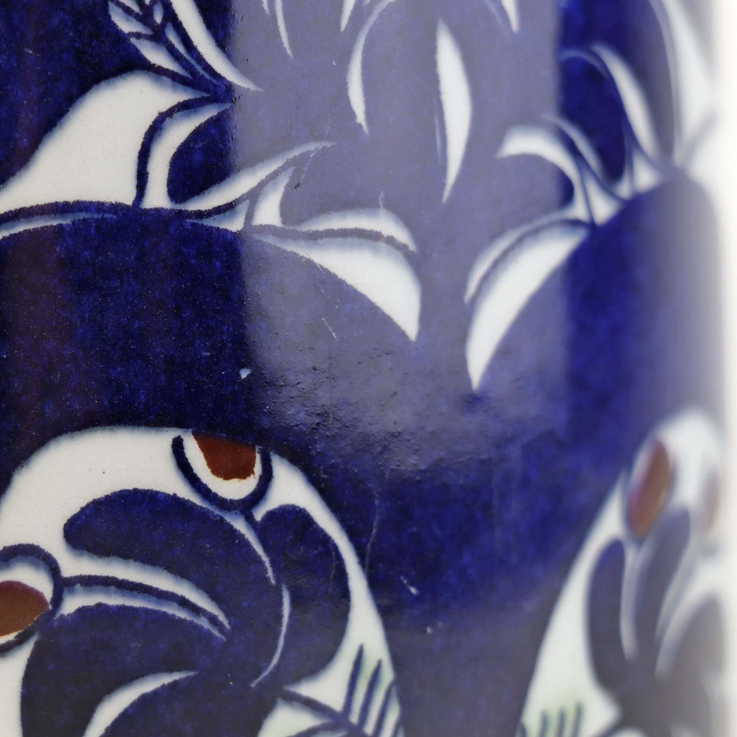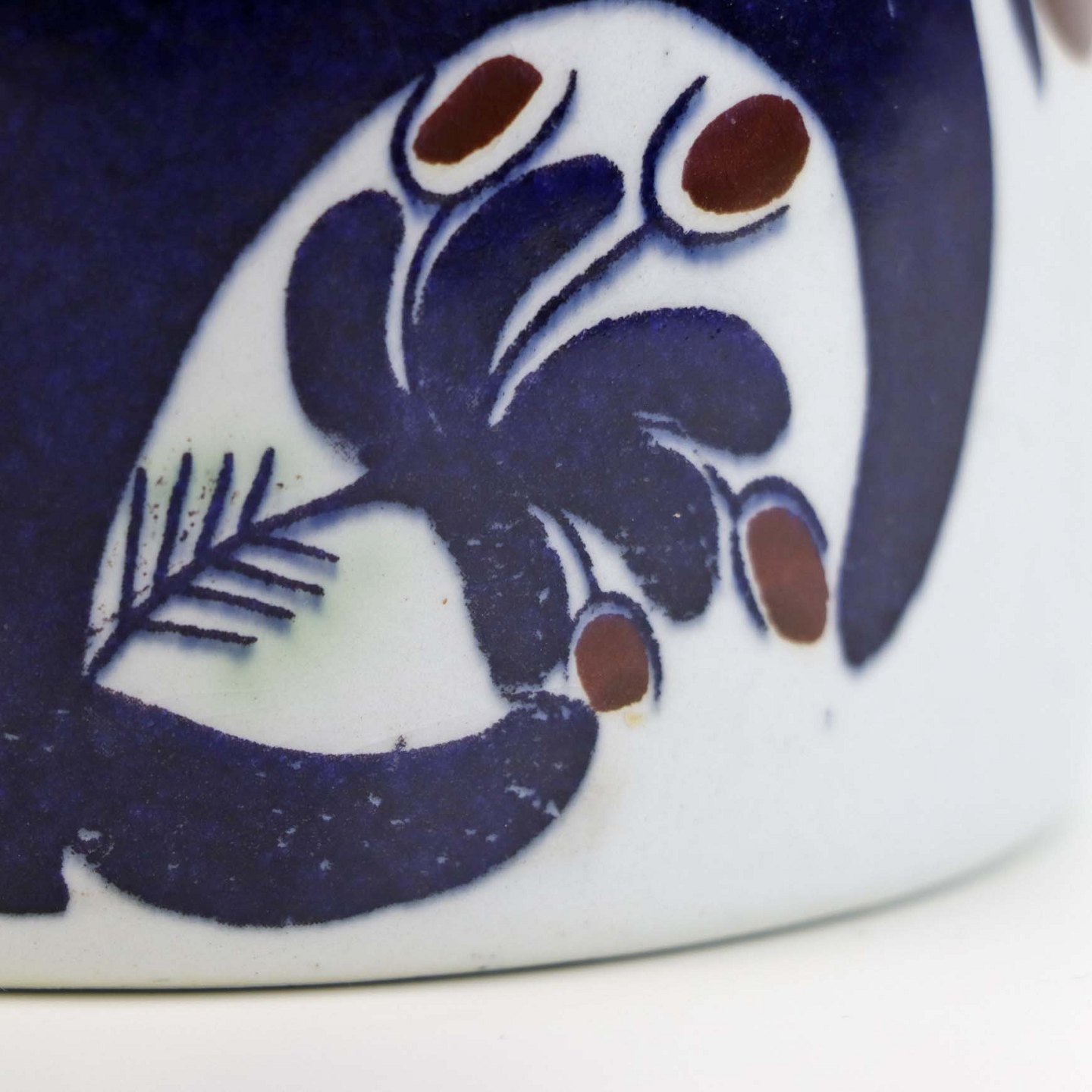 Fremstår med enkelte mindre ridser i glasuren samt en mindre fejl i glasuren ved topkanten.