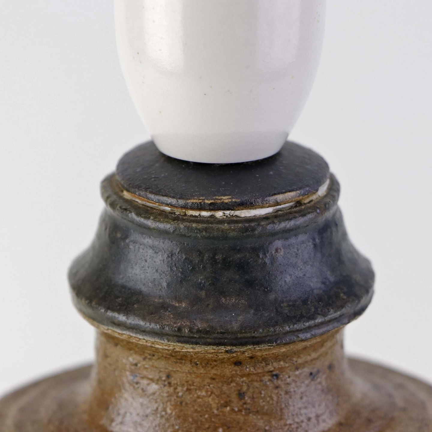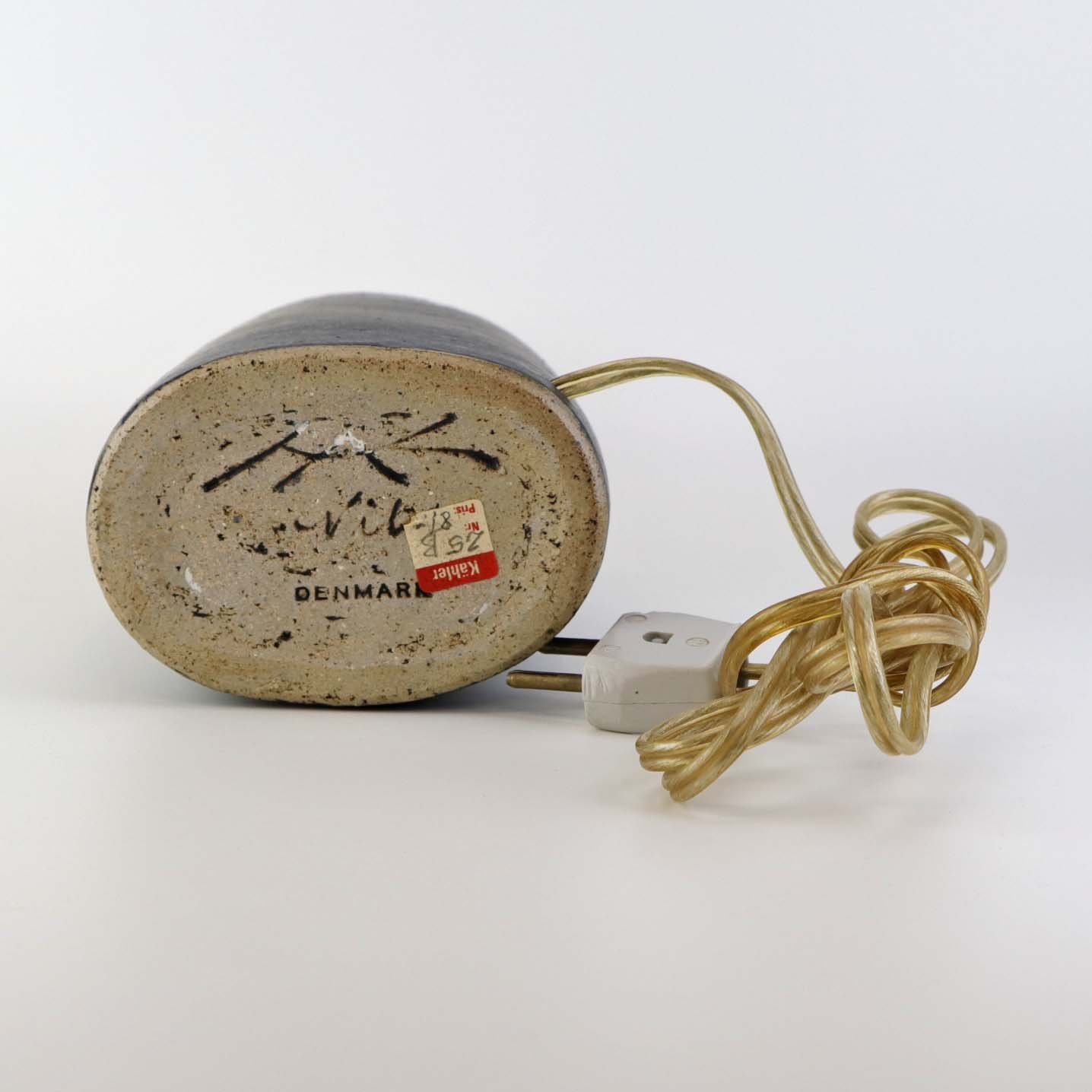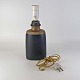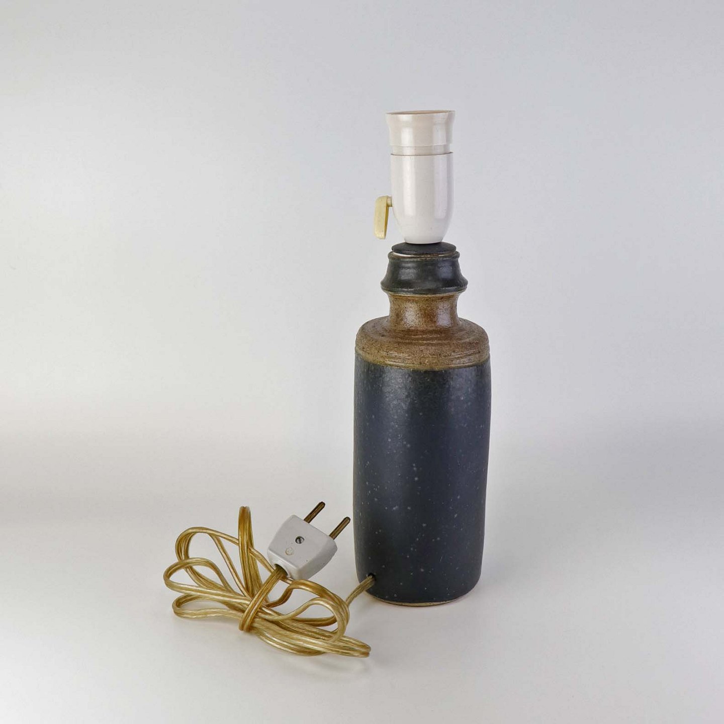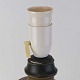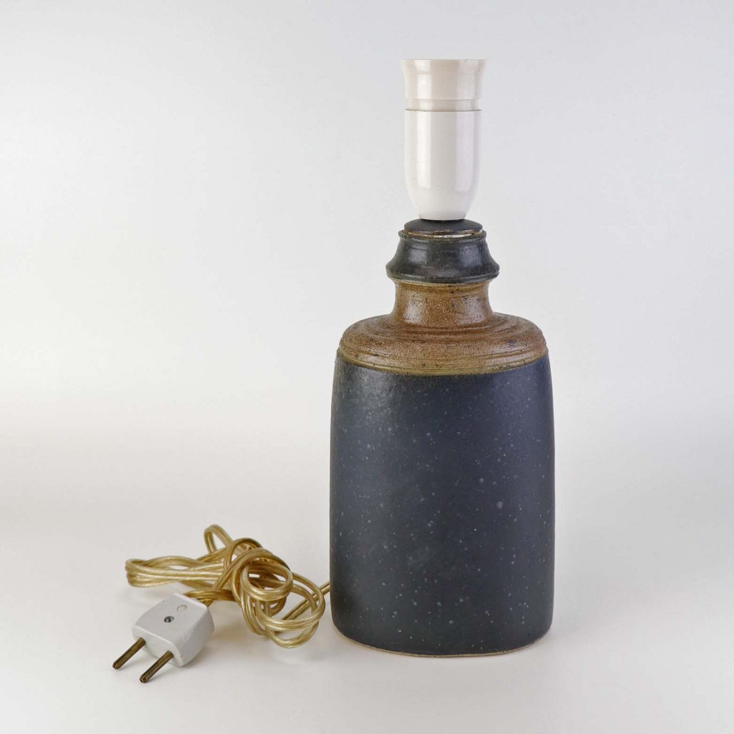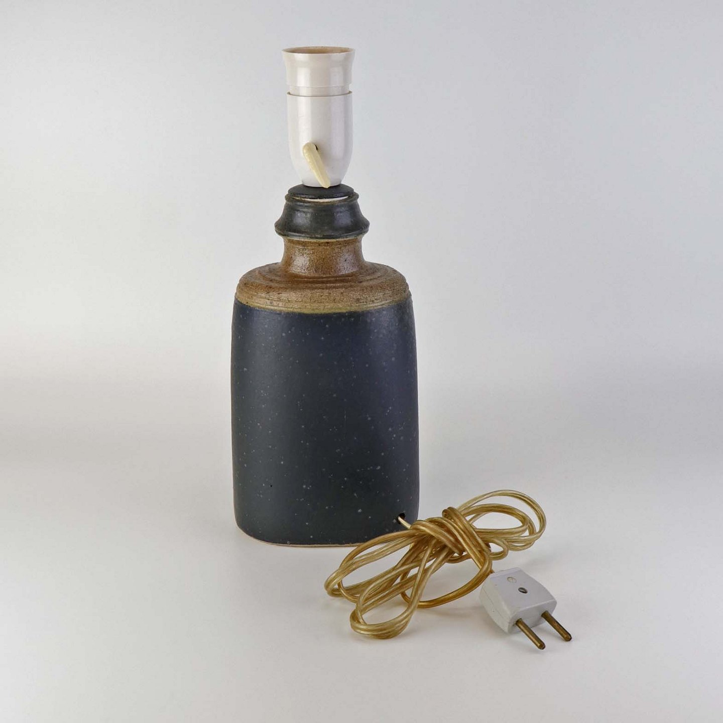Beskrivelse: Oval lampefod i keramik med brun og blåsort glasering og lys plastfatning.