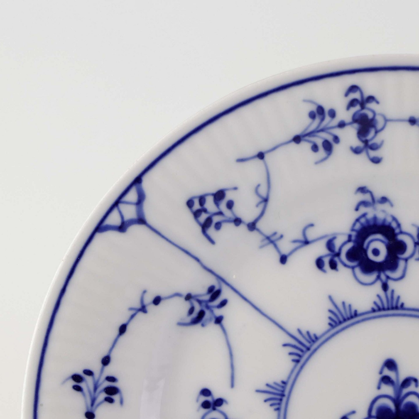 Musselmalet er af kongeligt hvidt porcelæn, dekoreret med rifler og mønster af blå ranker og blomster.