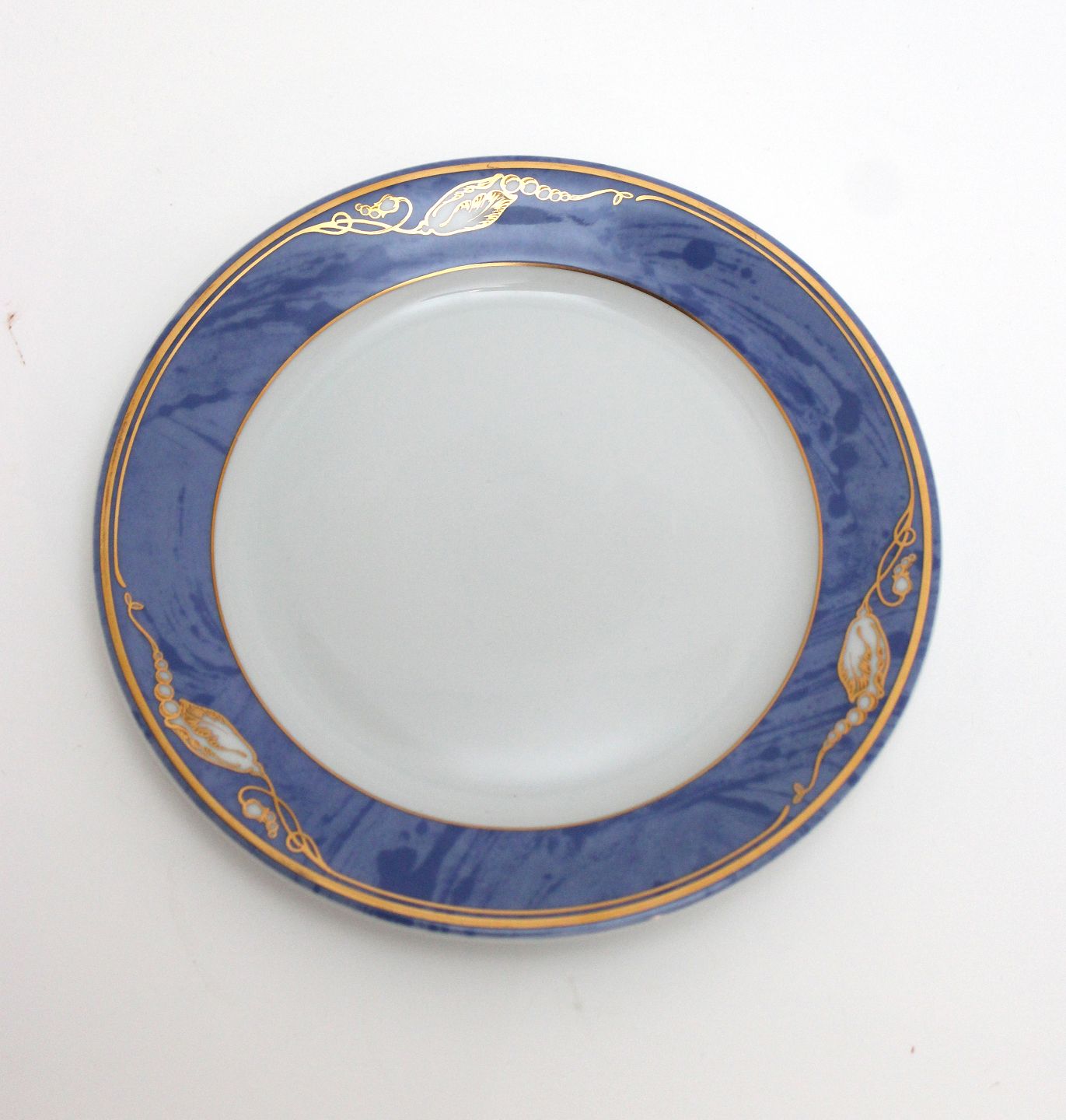 Beskrivelse: Royal Copenhagen, Blå Magnolia. Blå marmoreret bort dekoreret med gylden blomsterknop. Designet af Flemming Eskildsen. Stor kagetallerken. Diameter 17 cm. Nr. 617. I. sortering. Pris: 50 kr. stk. Lager: 6