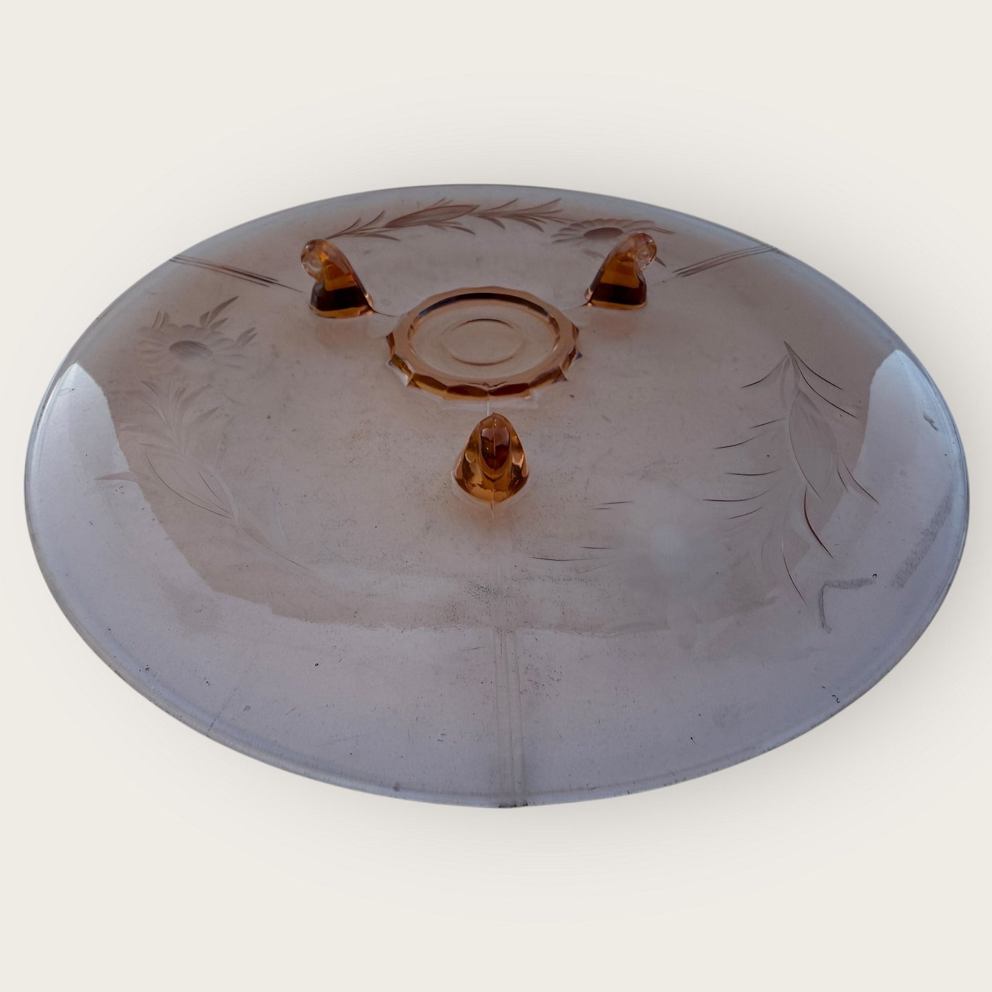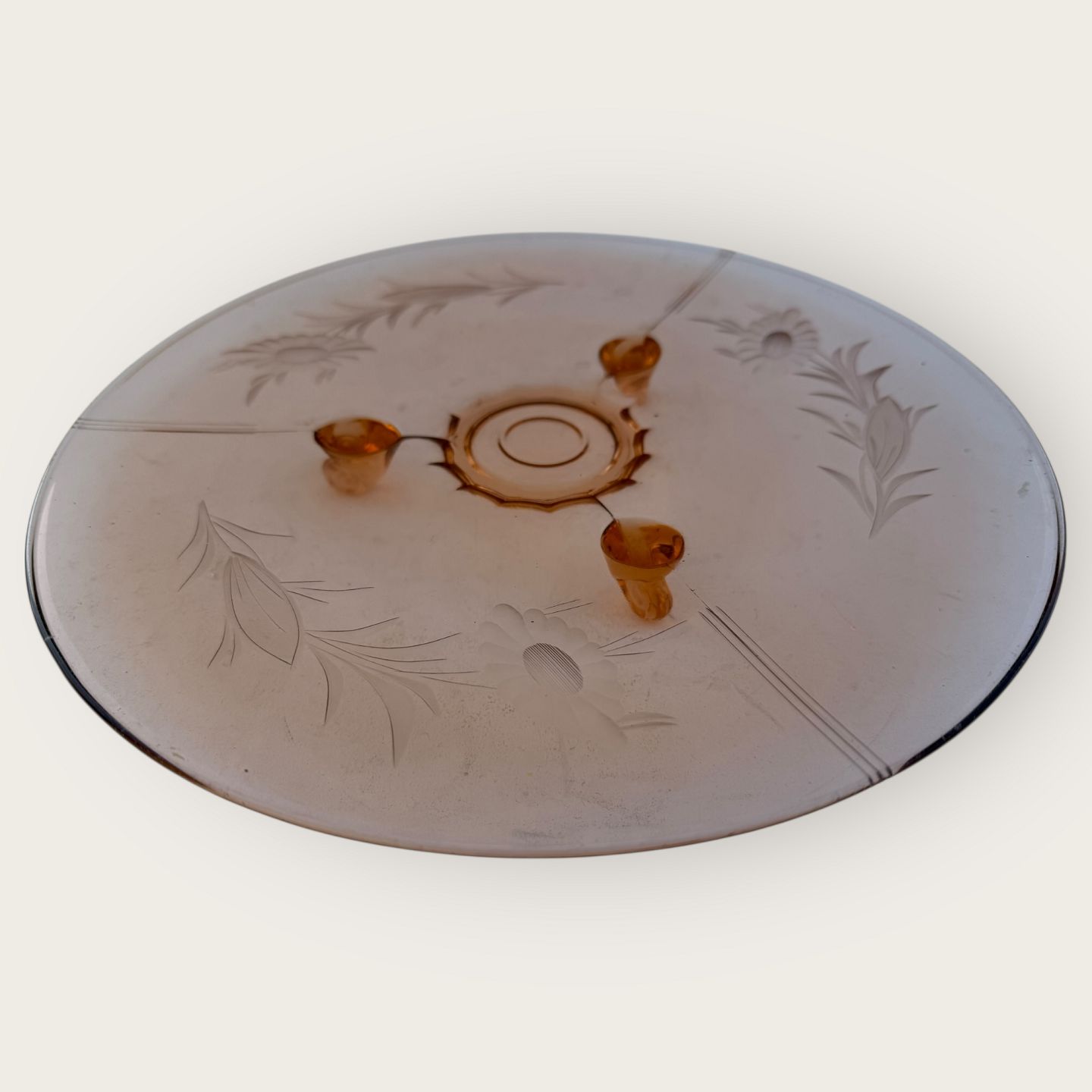 : Rosa glasfad med blomsterslibninger og tre fødder, diameter 29cm *pæn stand*