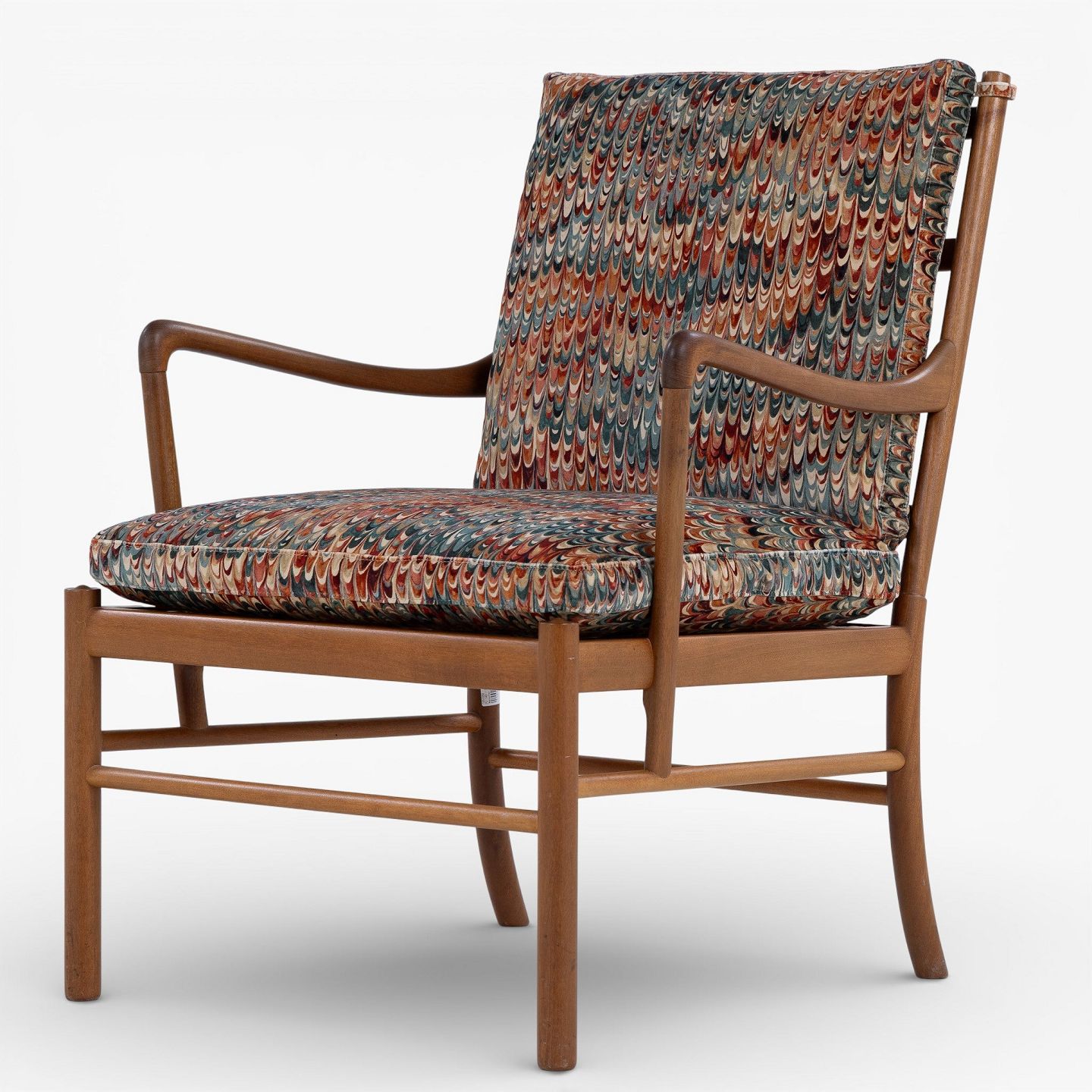PJ 149 - 'Colonial Chair'-lænestol i patineret mahogni med nybetrukkede hynder i 'End Paper Velvet'-tekstil. Mærket fra producent.