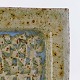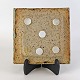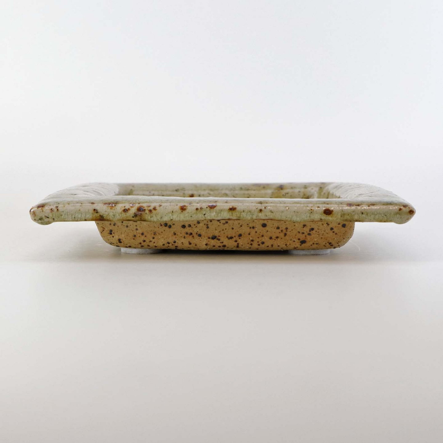Beskrivelse: Firkantet fad i keramik med struktureret bund med lyseblå og beige glasur med røde pigmenter.