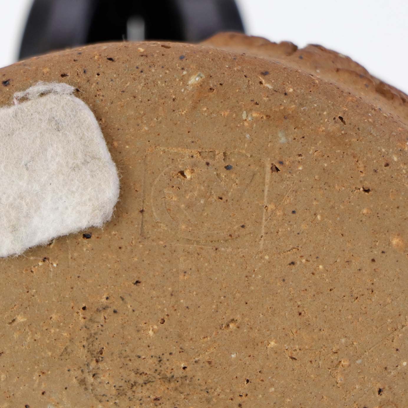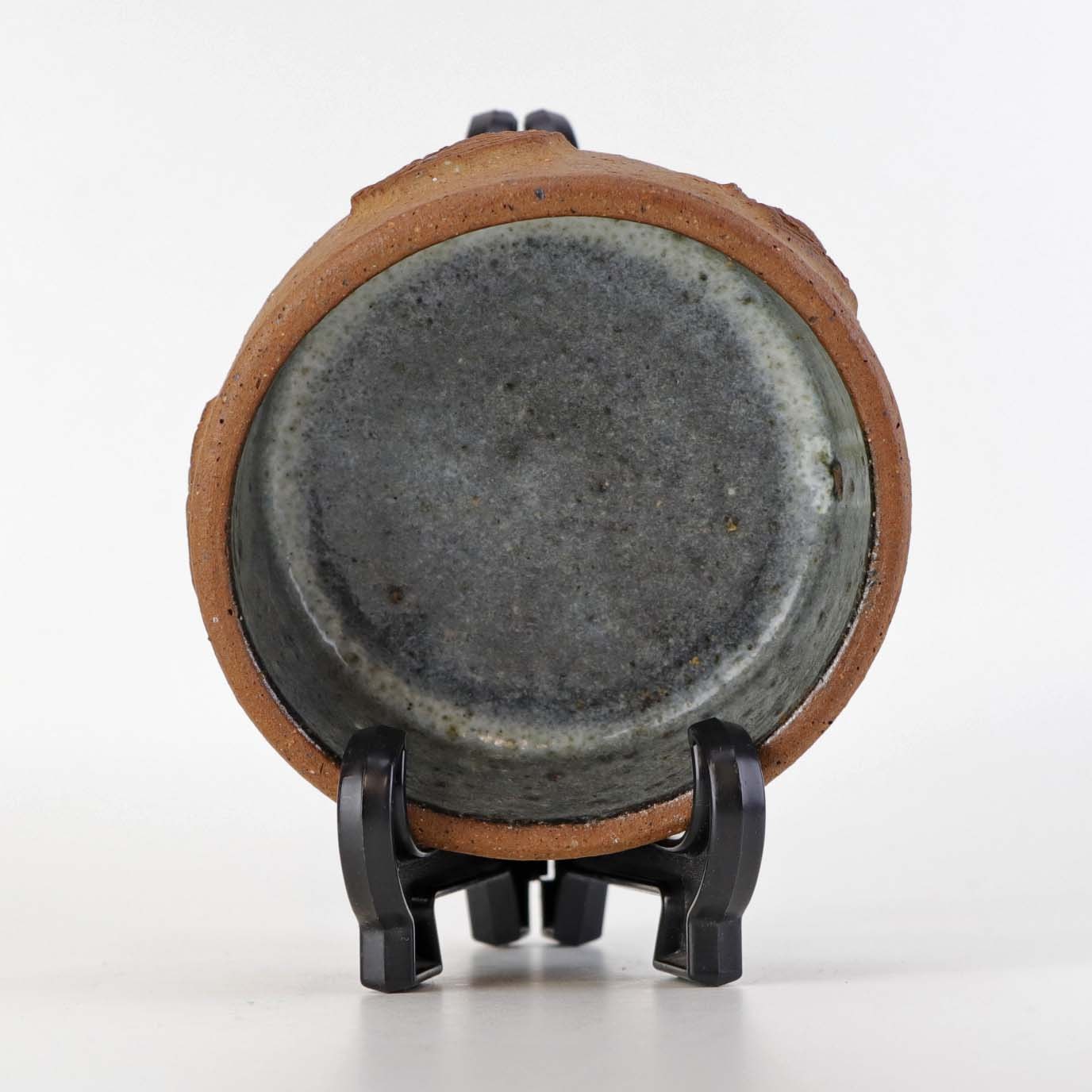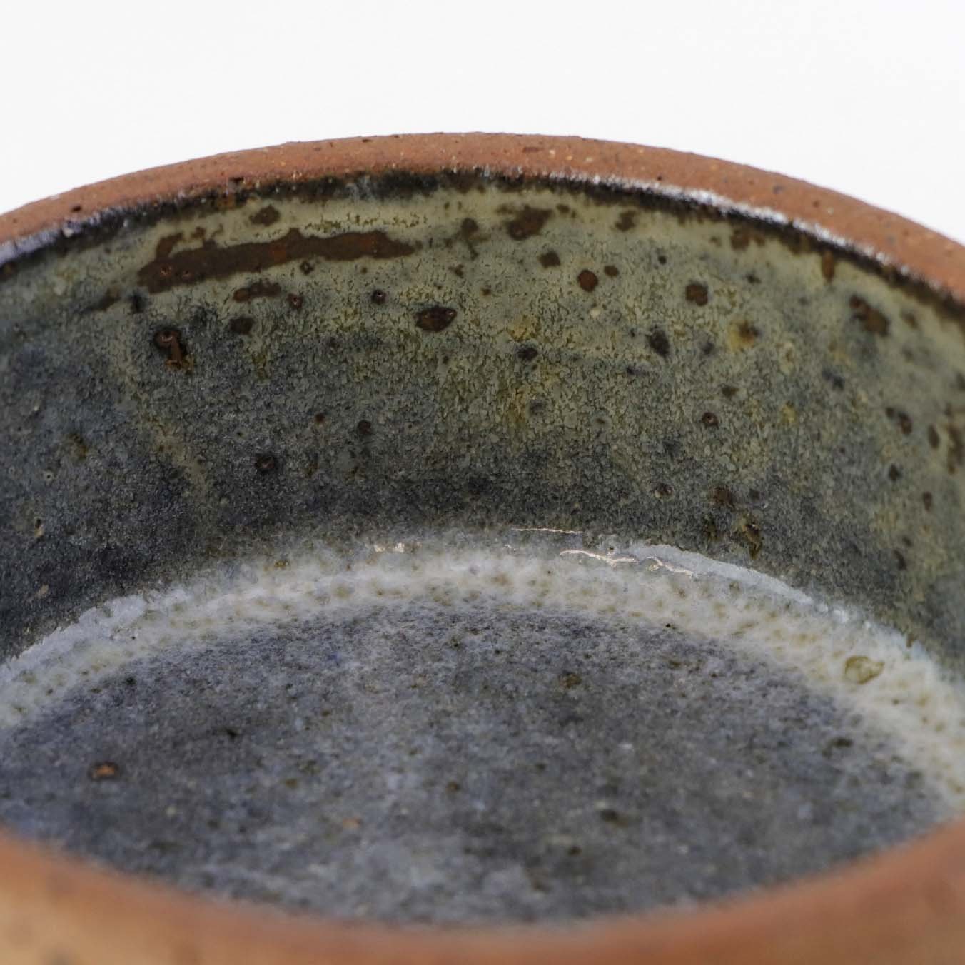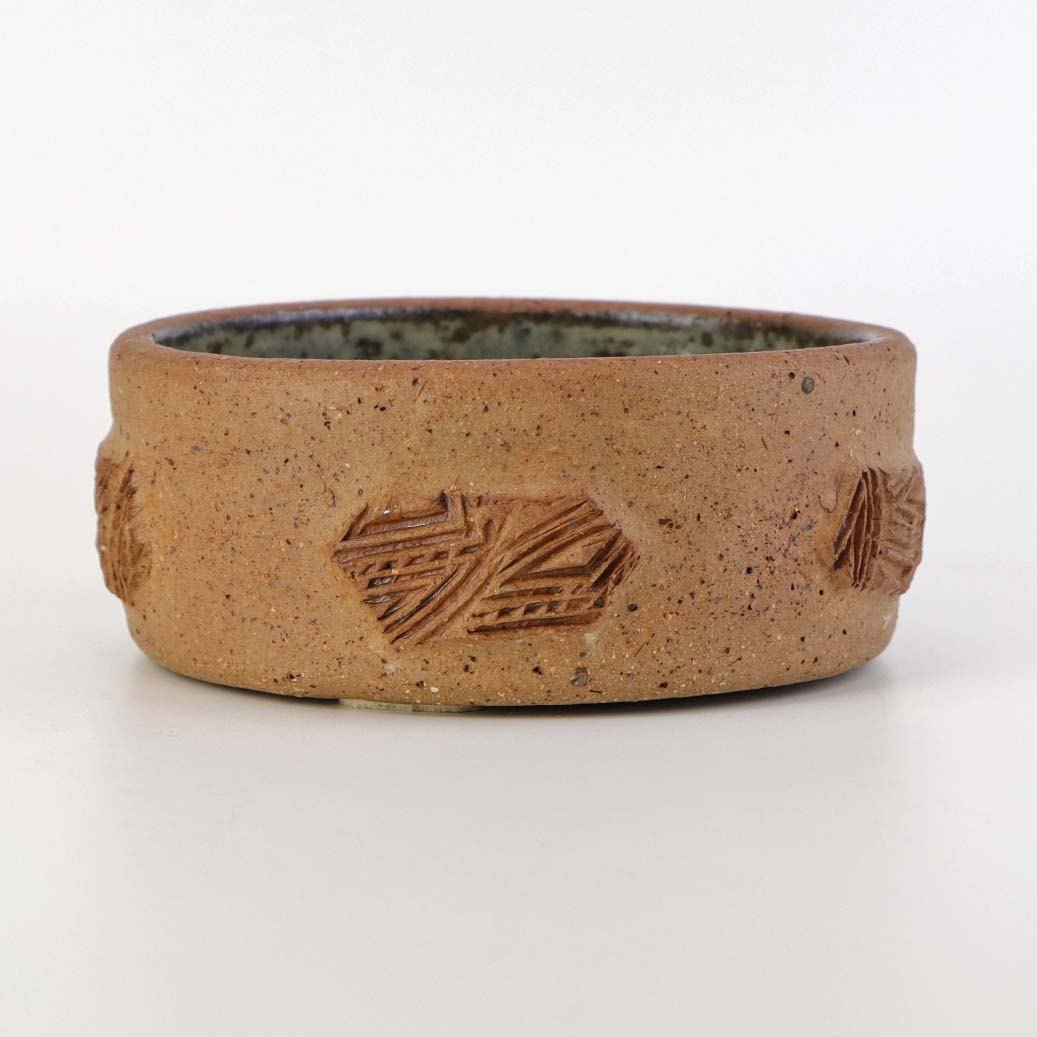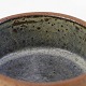 Beskrivelse: Lille rund skål i keramik med grå glasur på indersiden samt abstrakt mønstret yderside i uglaseret keramik.