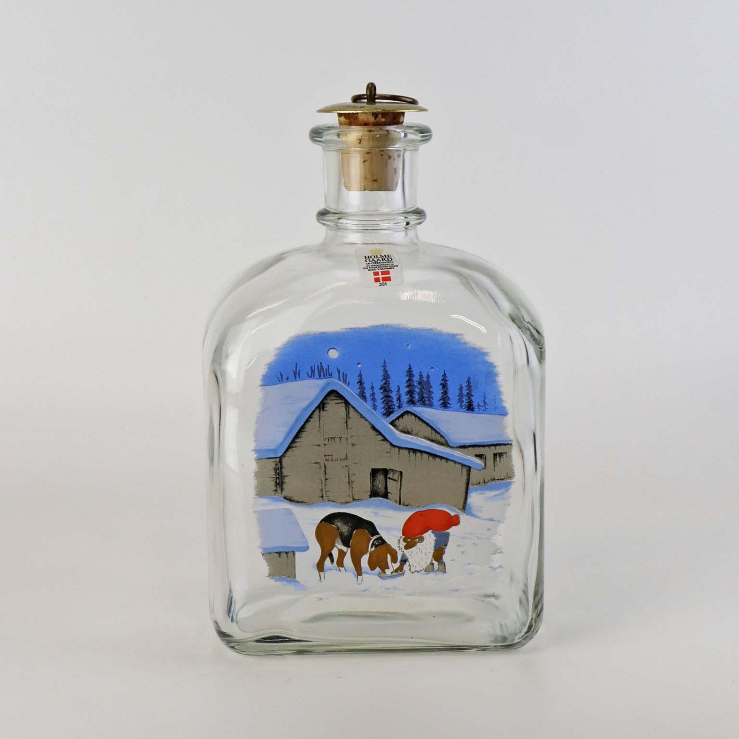 Beskrivelse: Dramflaske i glas med julemotiv af Nisse, hund og ræv efter tegning af Harald Wibergs. Snapseflasken kommer med korkprop.