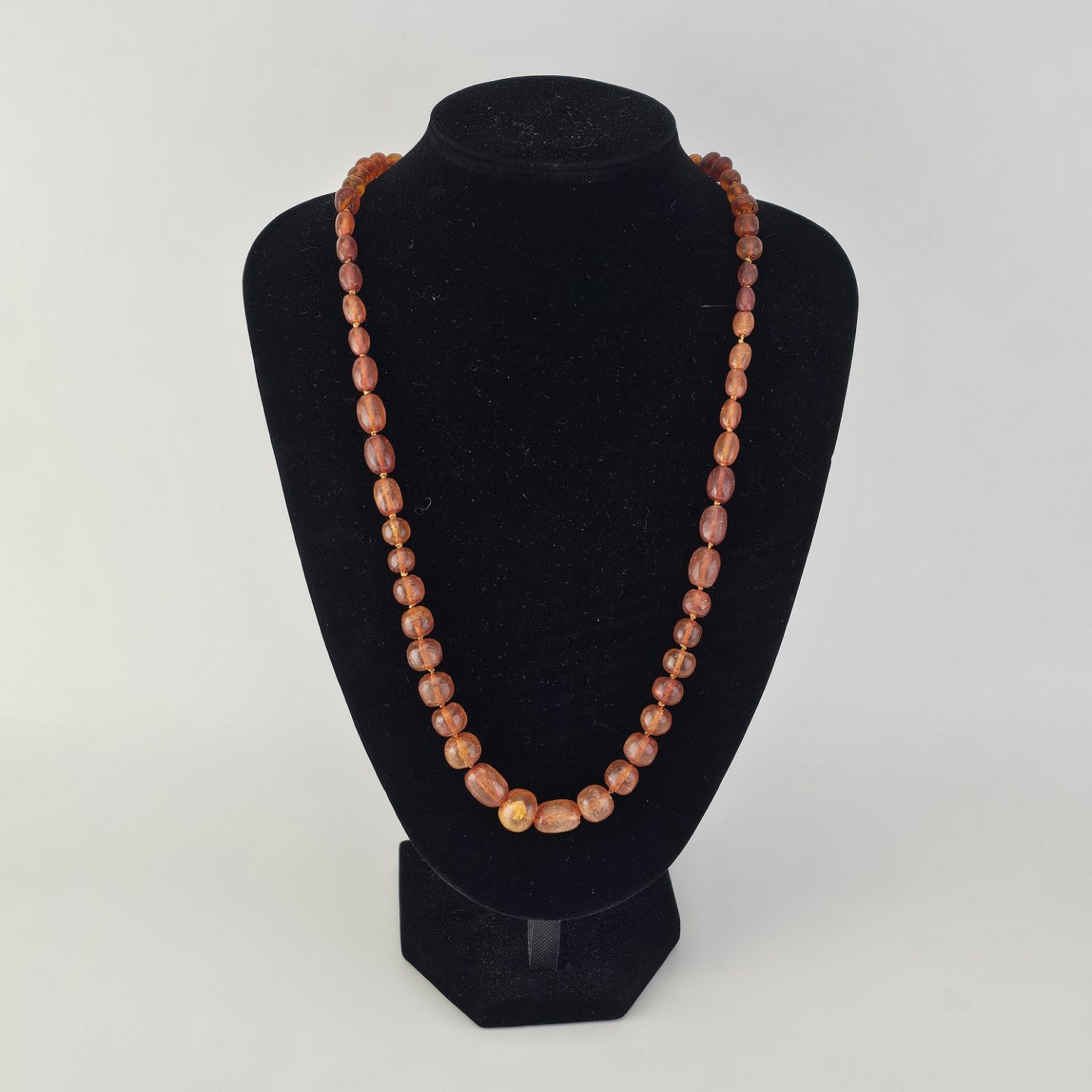 Beskrivelse: Halskæde med glatslebne ravstykker i varierende størrelse på snor, i alt 65 stykker rav