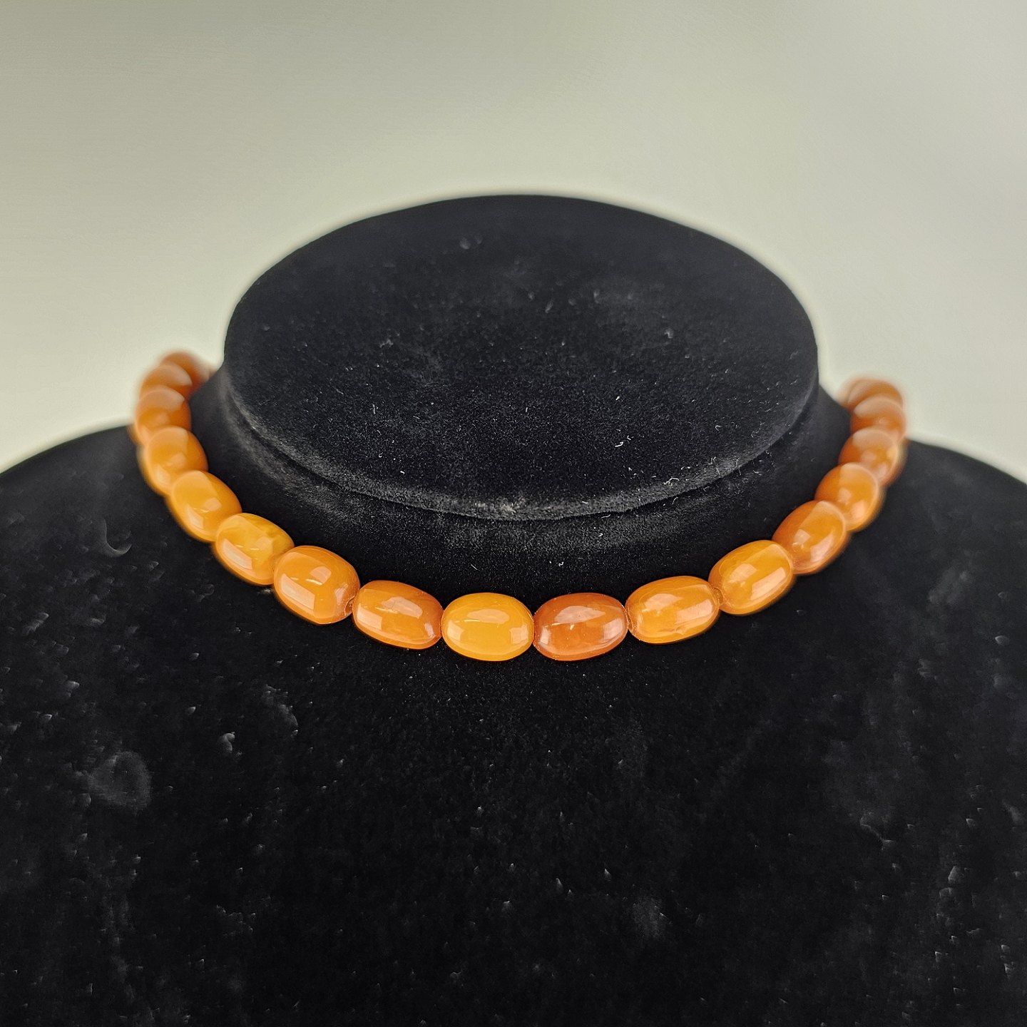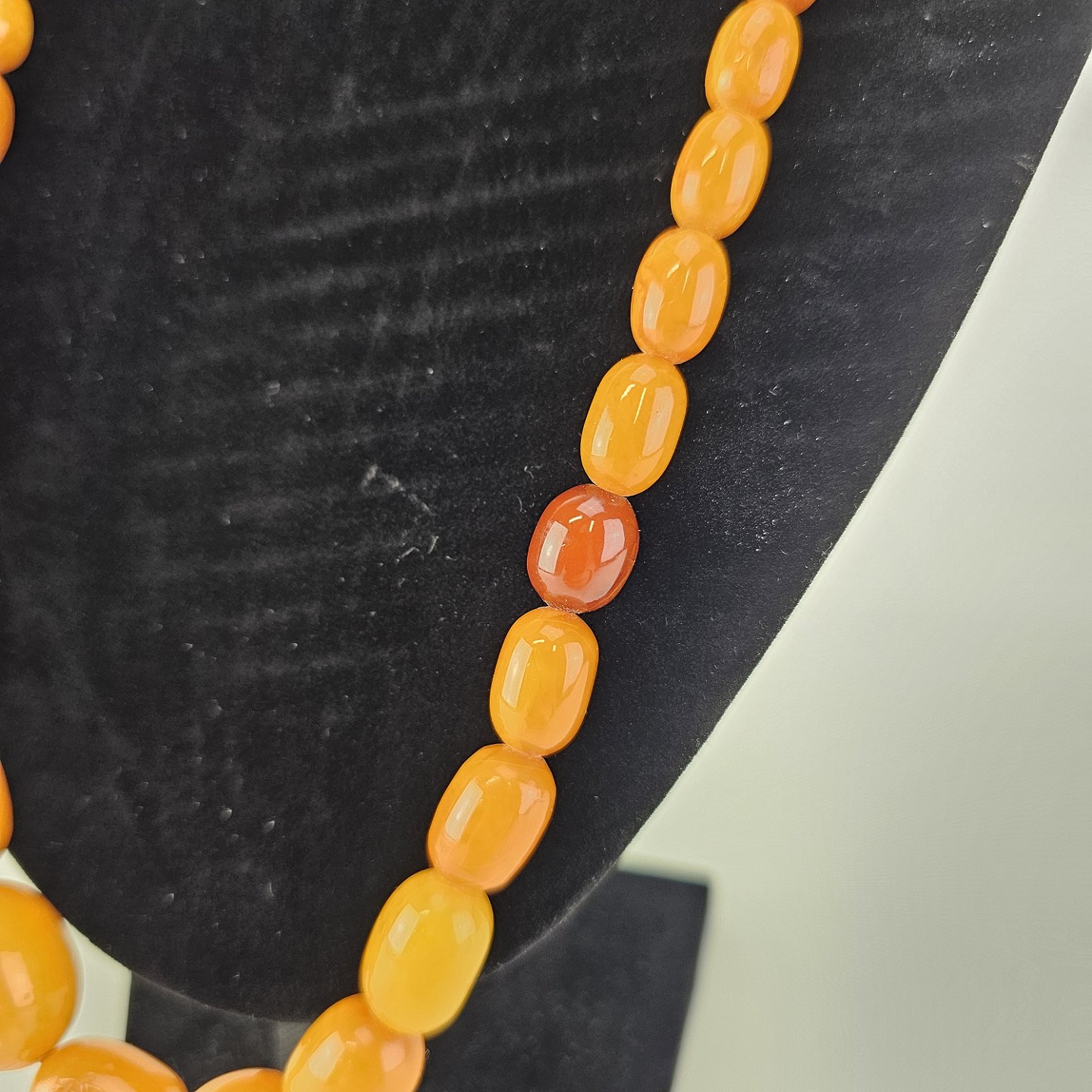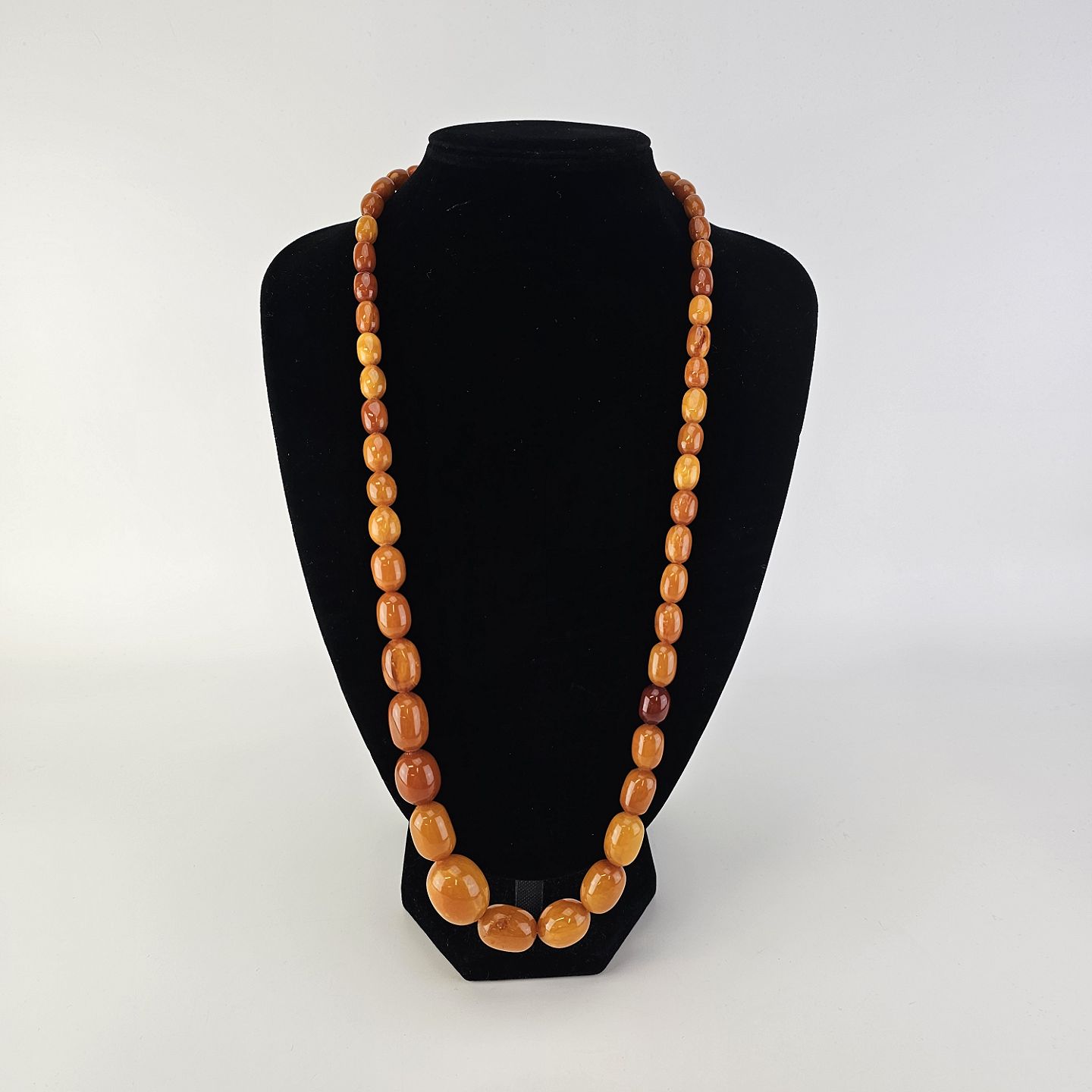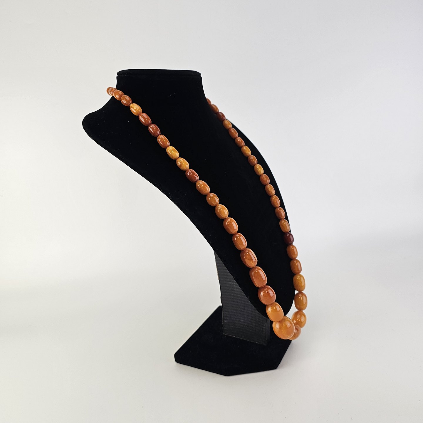 Beskrivelse: Halskæde med perler af glatslebet rav i varierende størrelse på snor, i alt 54 stykker rav