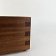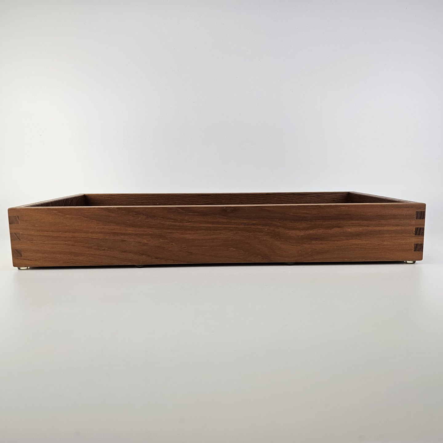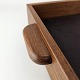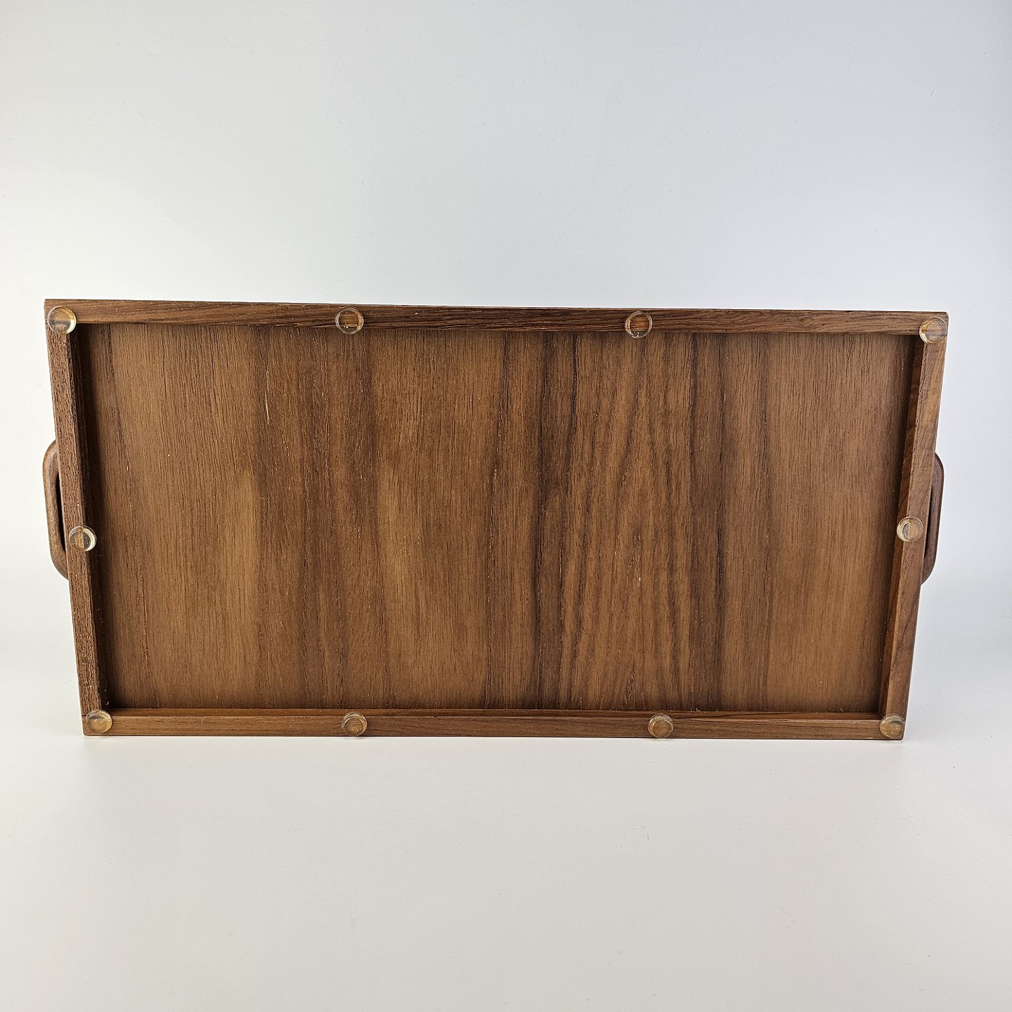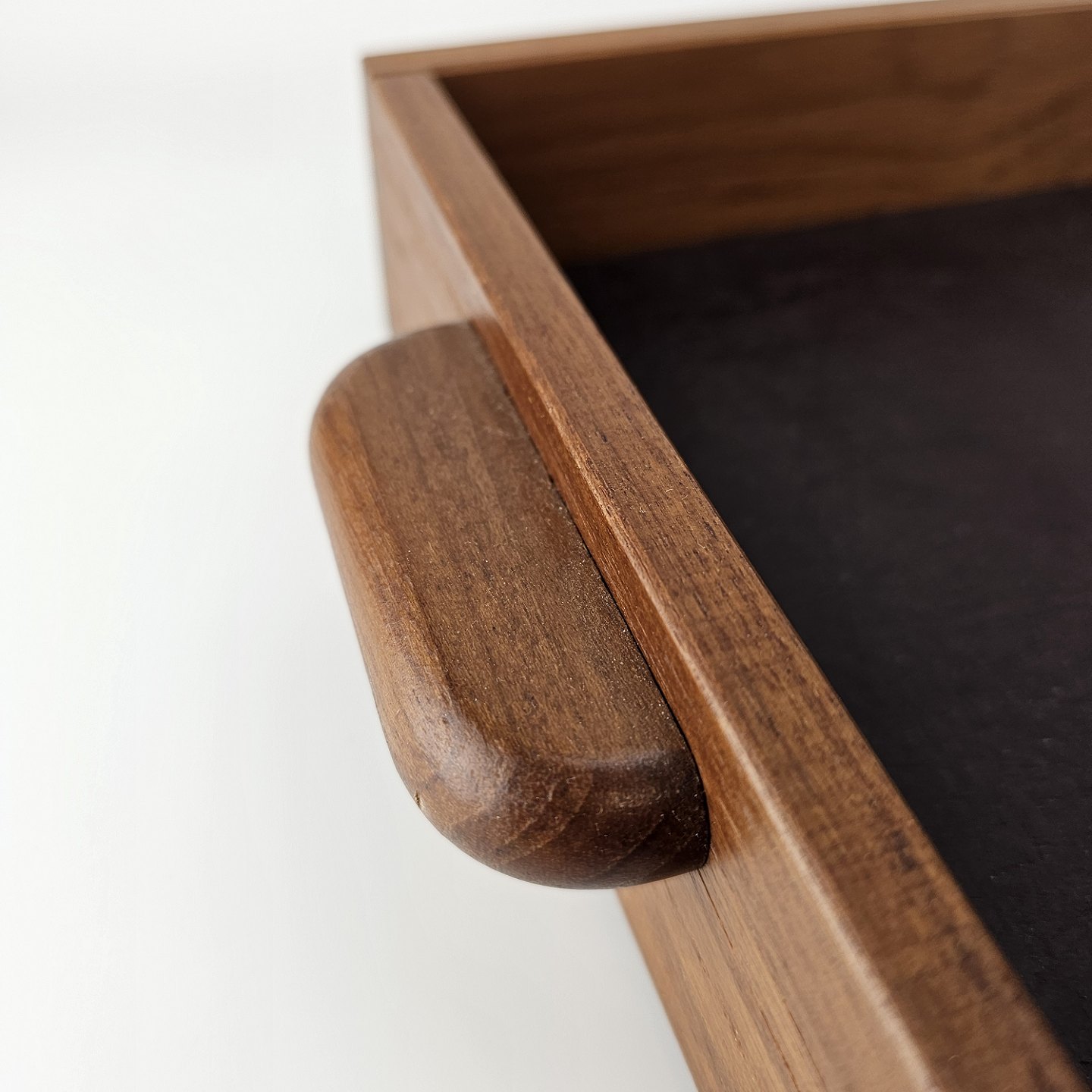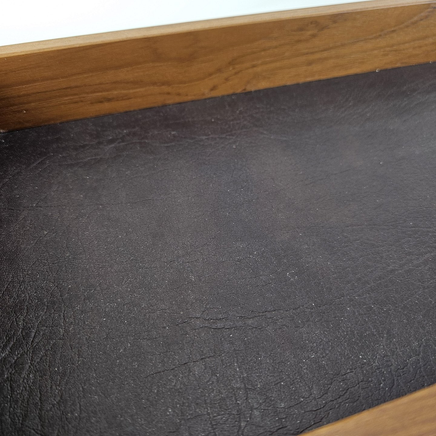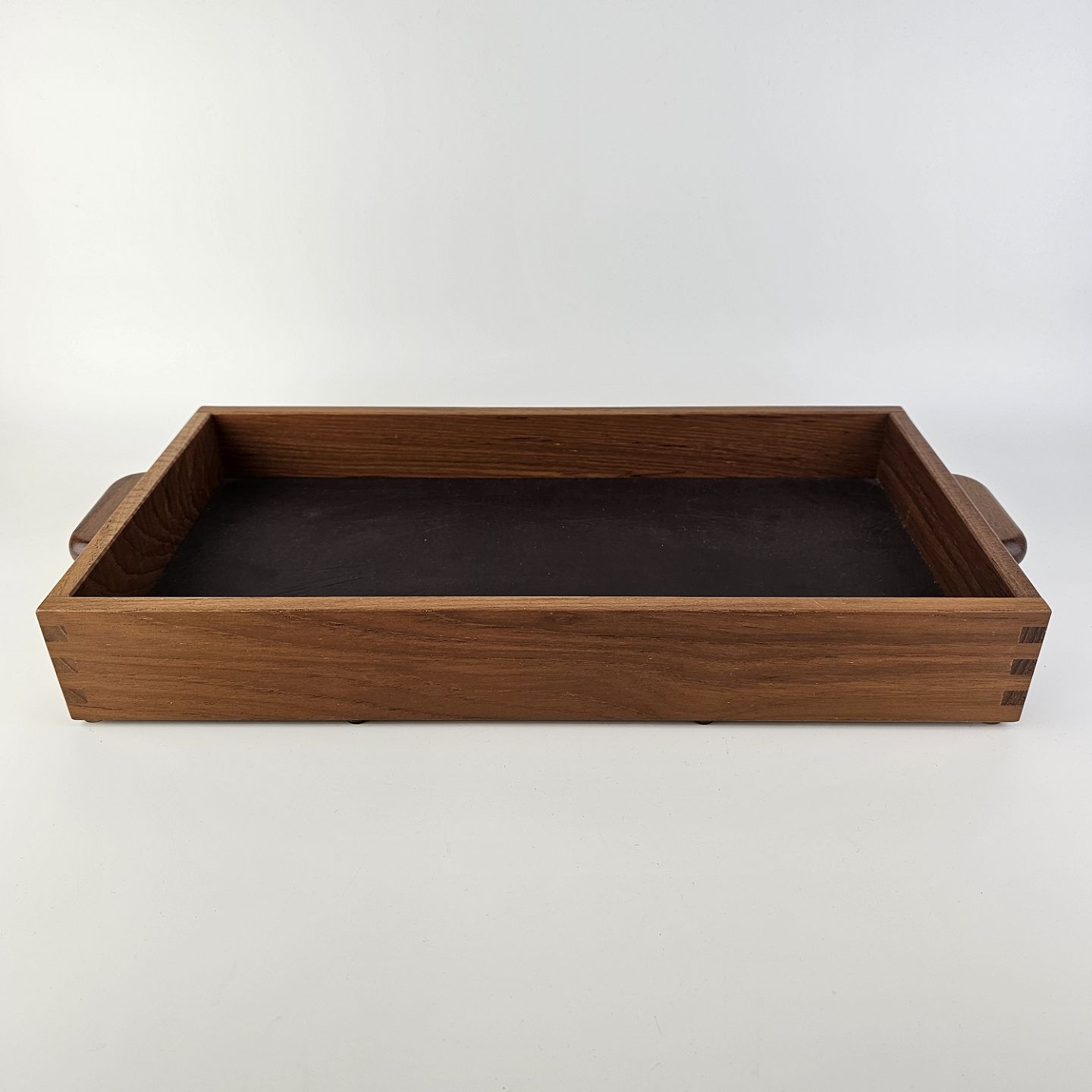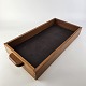 Beskrivelse: Bakke i teak træ med læder i bunden