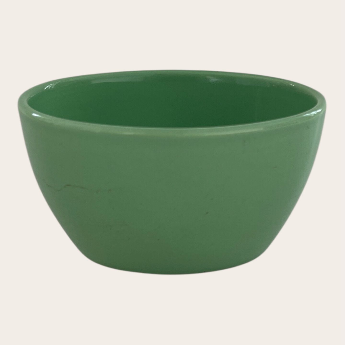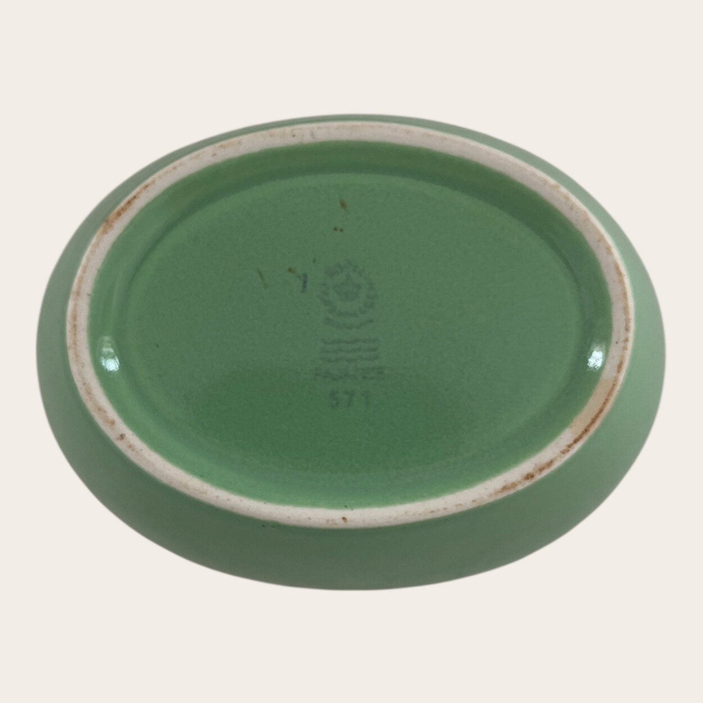 Beskrivelse: Royal Copenhagen, Aluminia, Ursula, Oval skål, Grøn #571, 1. sortering, 10,5cm lang, 8cm bred, 6cm høj, Design Ursula Munch Petersen *Pæn stand*