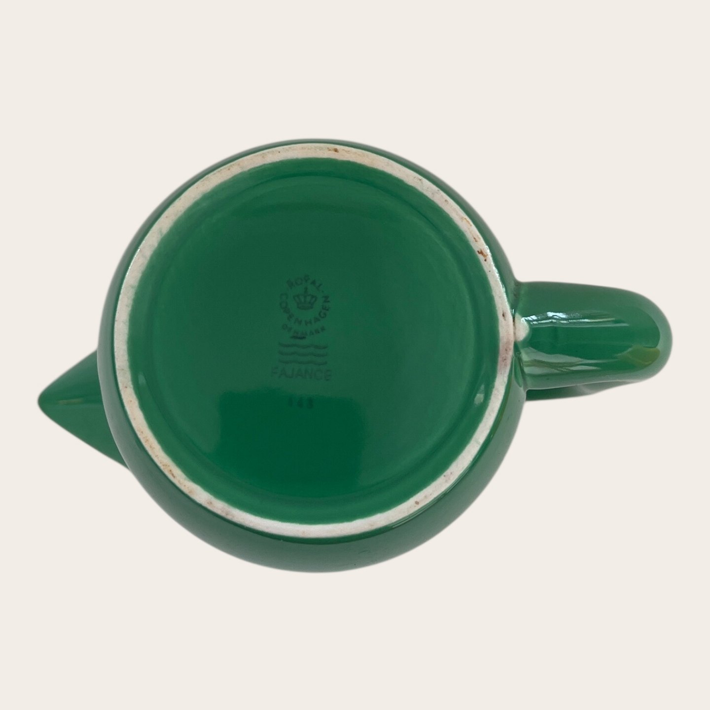 Beskrivelse: Royal Copenhagen, Aluminia, Ursula, Kande med hank, Grøn #143, 1. sortering, 16cm høj, 21cm bred, Design Ursula Munch Petersen *Pæn stand* (Se også låg til kanden varenr. 629129)
