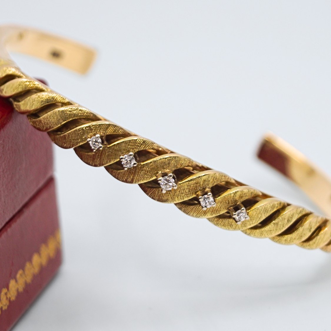 Beskrivelse: Guldarmring i 14 kt. prydet med fem diamanter, som er fattet i hvidguld. Indvendige mål 5,3 cm x 4,6 cm. B. 5-7 mm. Designet med både glat og materet overflade i guldet. Kraftig kvalitet.