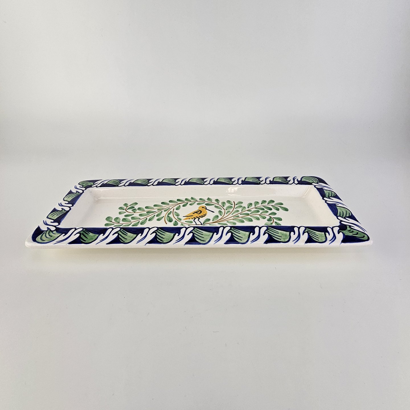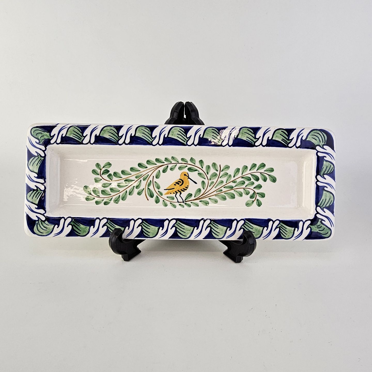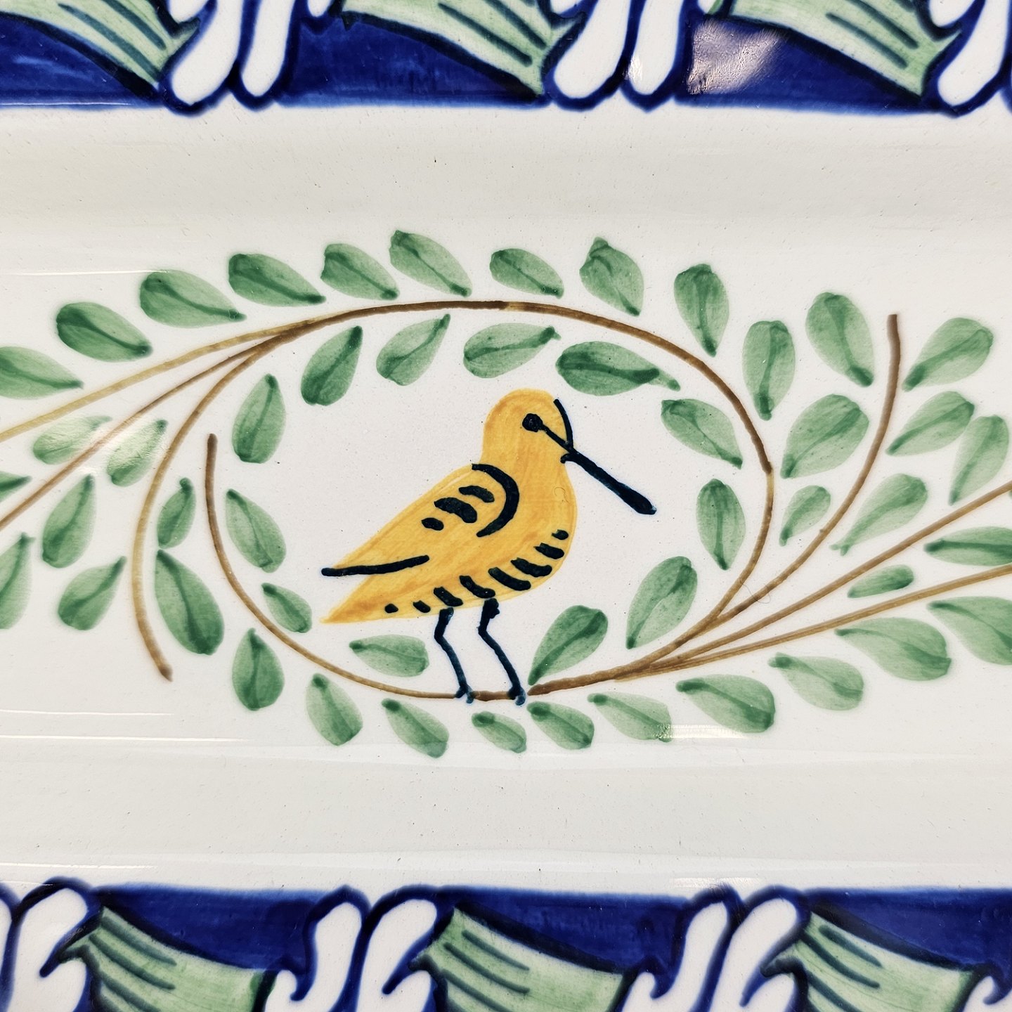 Beskrivelse: Pennebakke i fajance med dekoration af en gul fugl, blade og blå kant med blomster, flot stand.