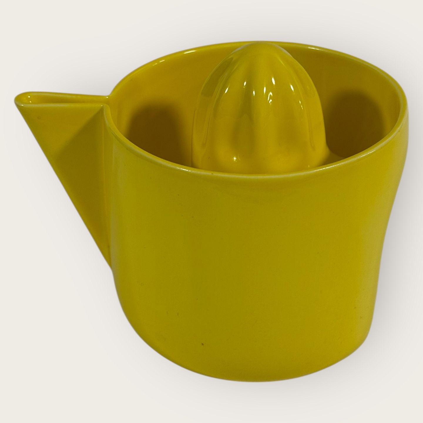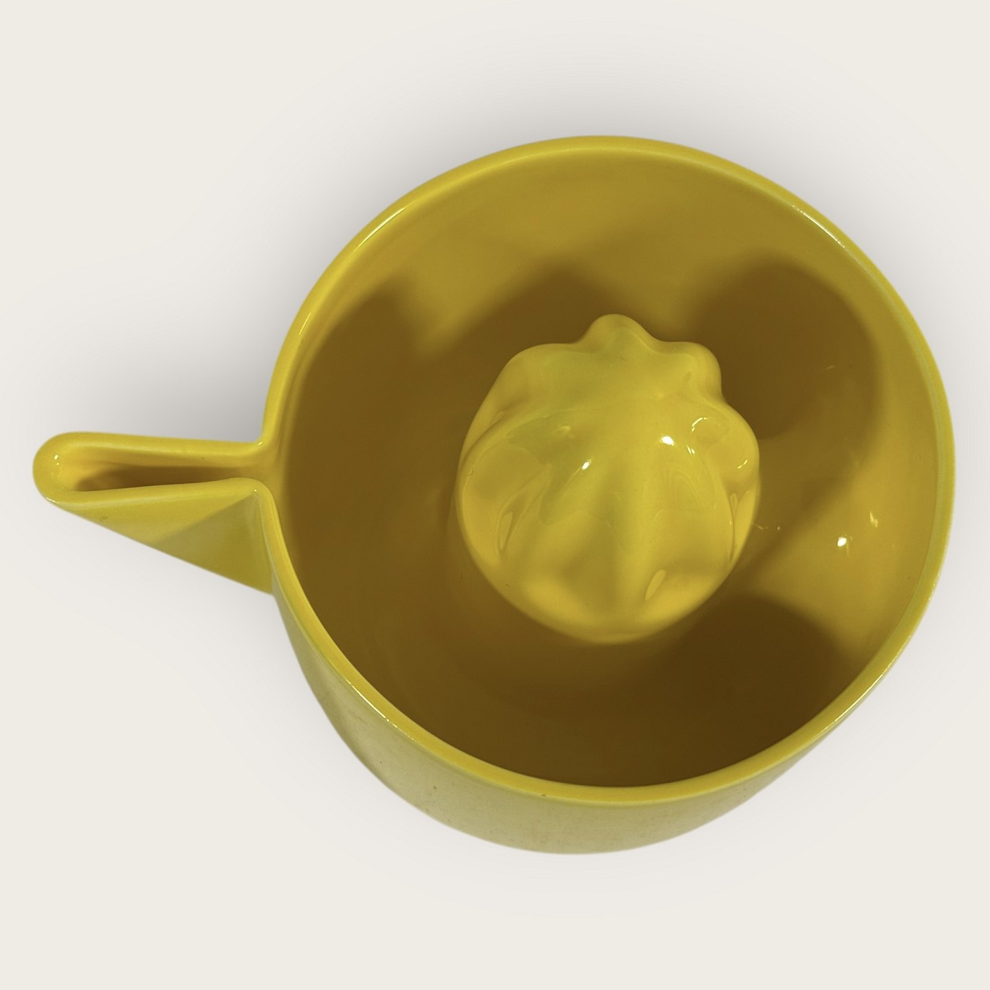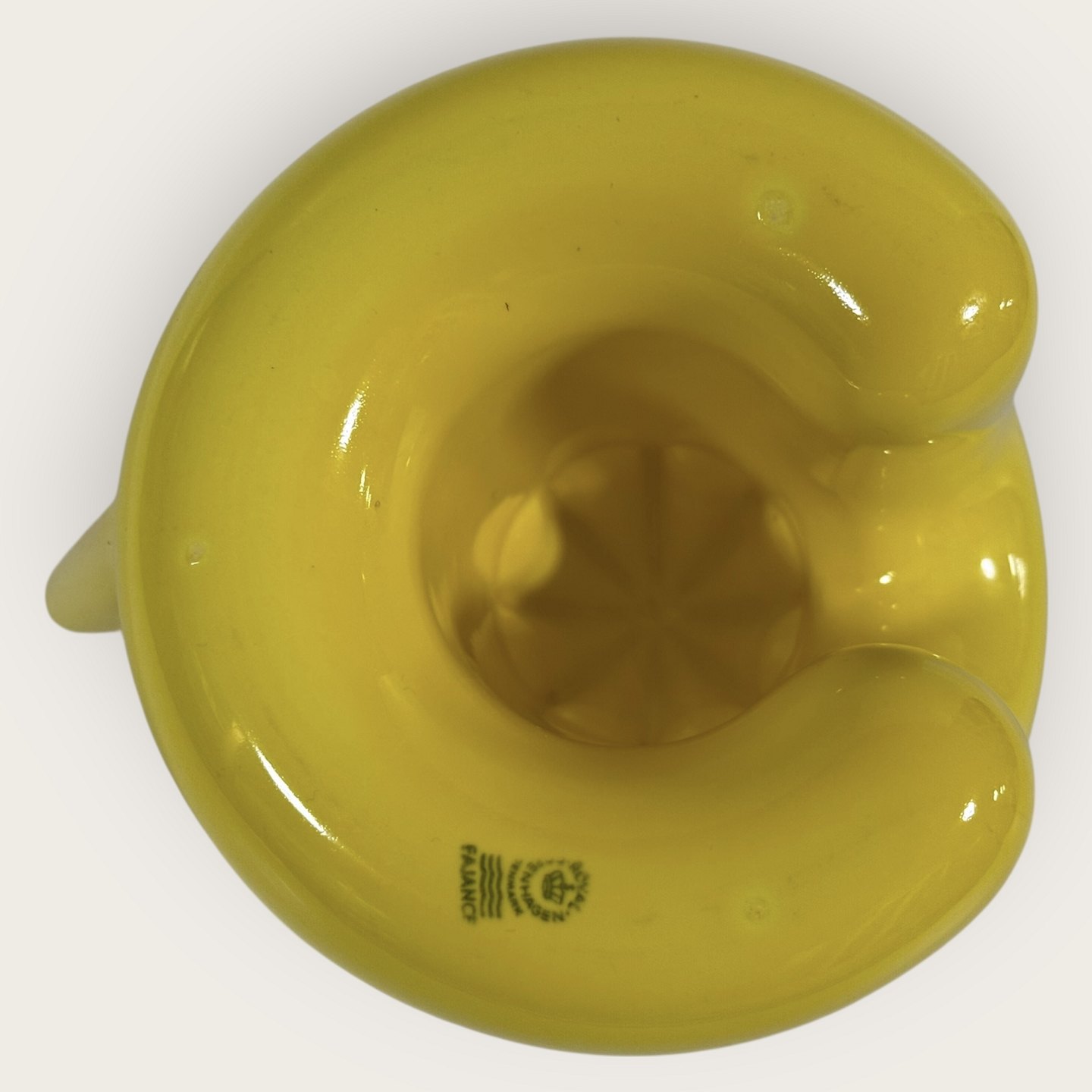 Description: Royal Copenhagen, Faience, yellow lemon squeezer, # 848, Design Ole Jensen, Dimensions: height 11cm, diameter 13.5cm, width with spout 17cm, 1st grade *Perfect condition*