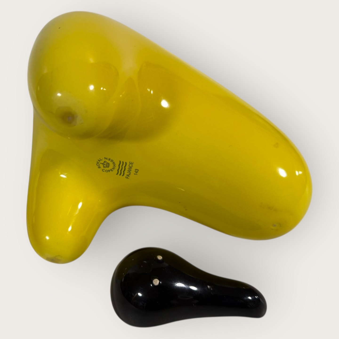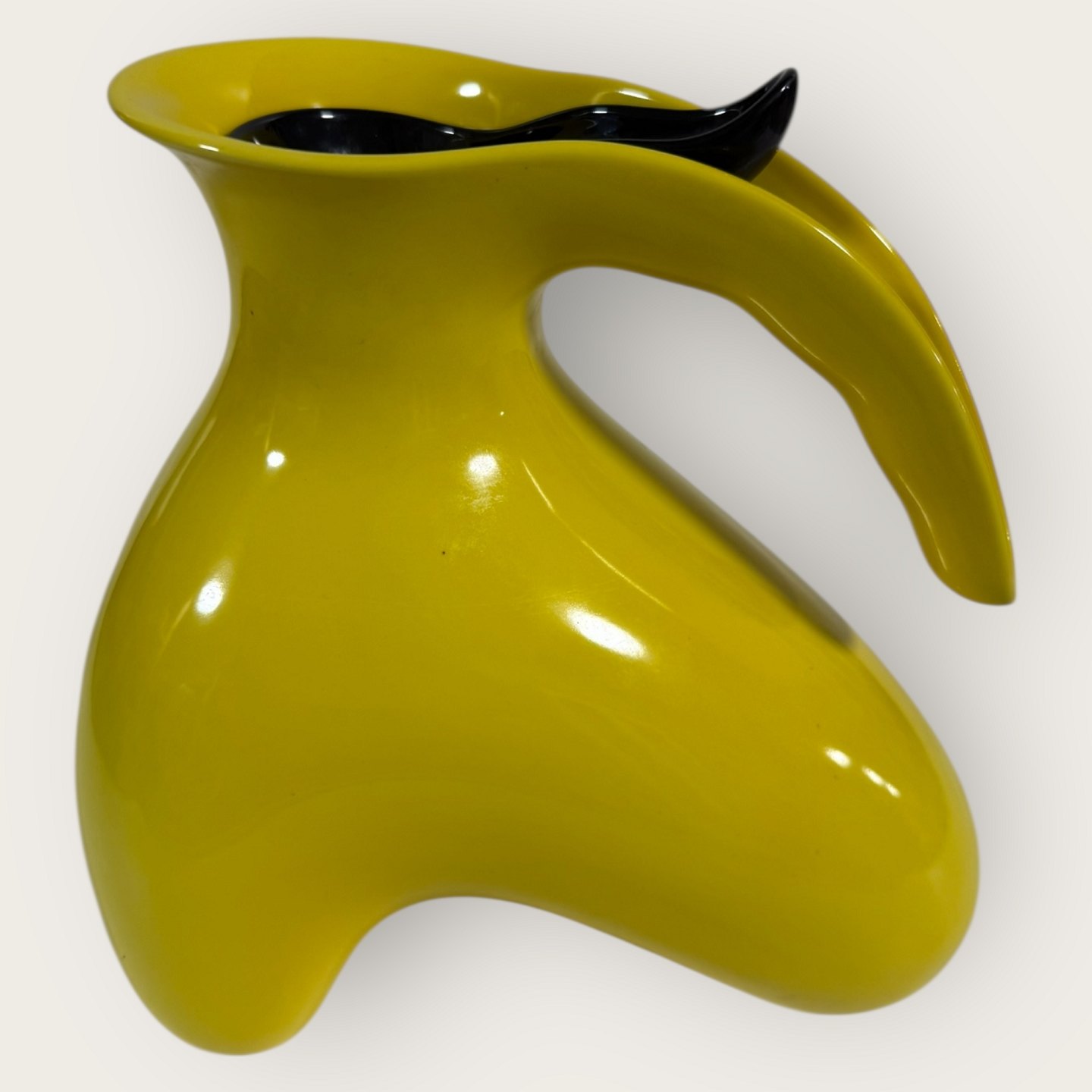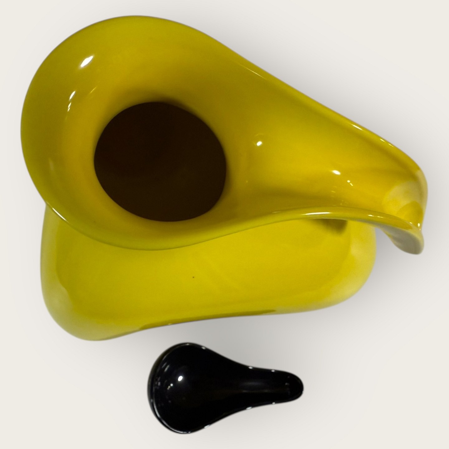 Description: Royal Copenhagen, Faience, yellow jug with black lid, # 143, Design Ole Jensen, the lid also functions as a measuring spoon, Dimensions: approx. 20x19x15cm, 1st grade *Perfect condition*