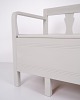 Description: Antique beater bench from the 1860s in gray painted pine. Classic folk design with seating and storage. Historical and functional furniture.