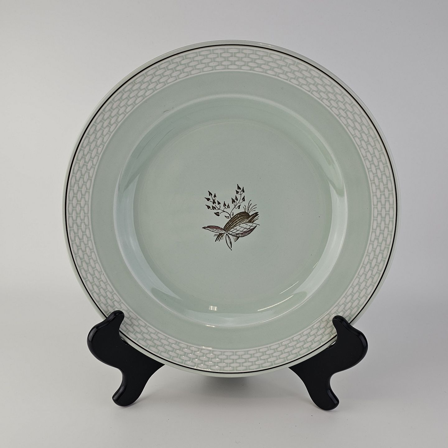 Stel i lysegrøn fajance med natur dekoration og flettet kant