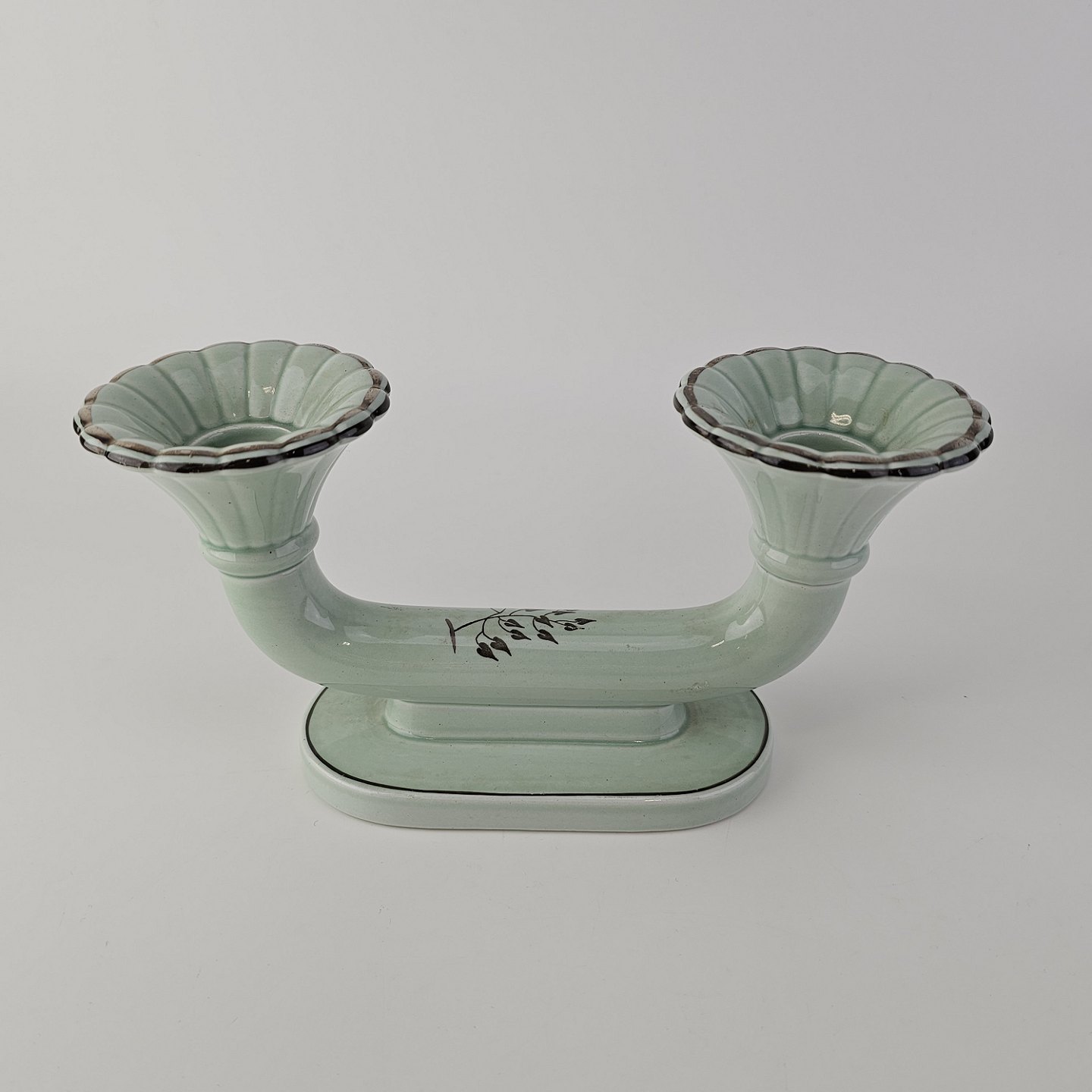 Beskrivelse: To-armet lysestage i fajance fra stellet Morgenfrue