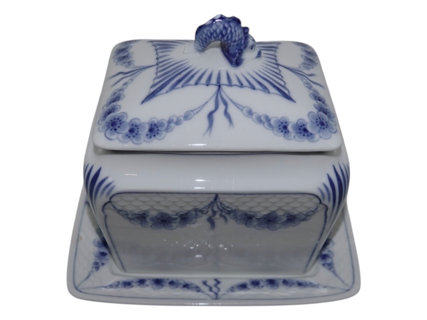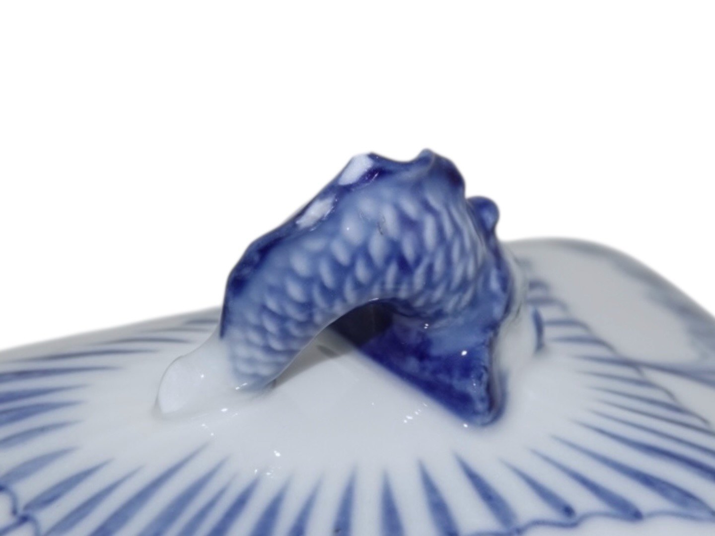 Der er tre skår på toppen af låget samt et pålimet skår på underfadet, se nærbilleder, ellers fejlfri.