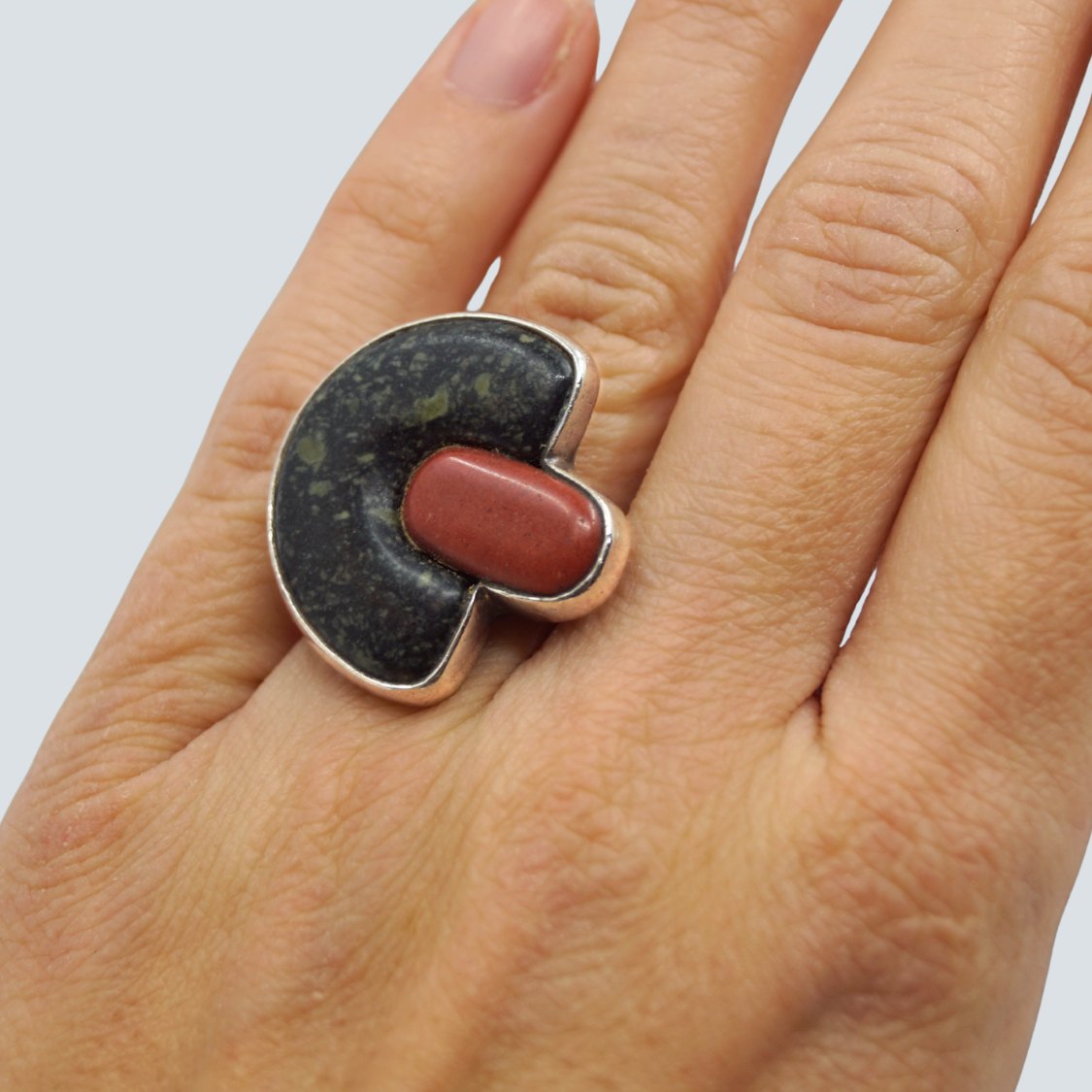 Beskrivelse: Agnete Dinesen; Kraftig ring af sterlingsølv prydet med to sten.