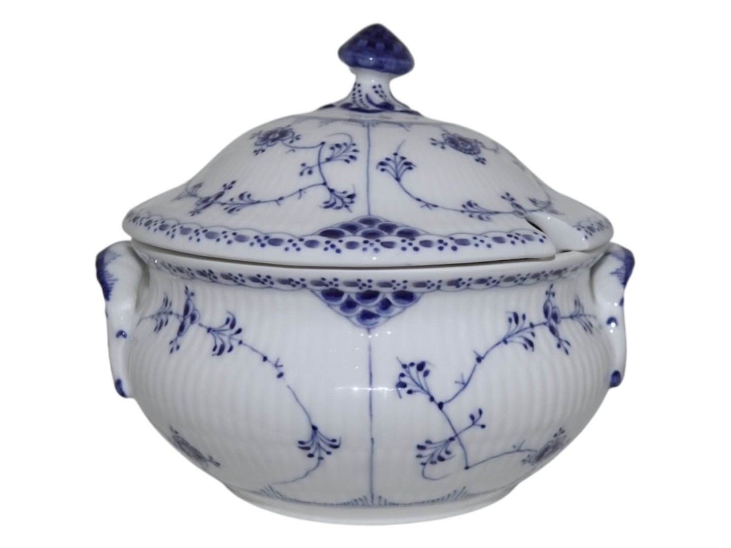 Beskrivelse: Kongelig Musselmalet Halvblonde, sjælden lille rund suppeterrin med låg.