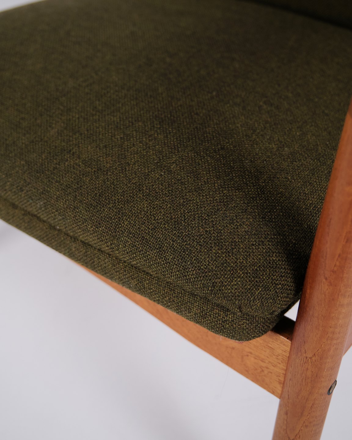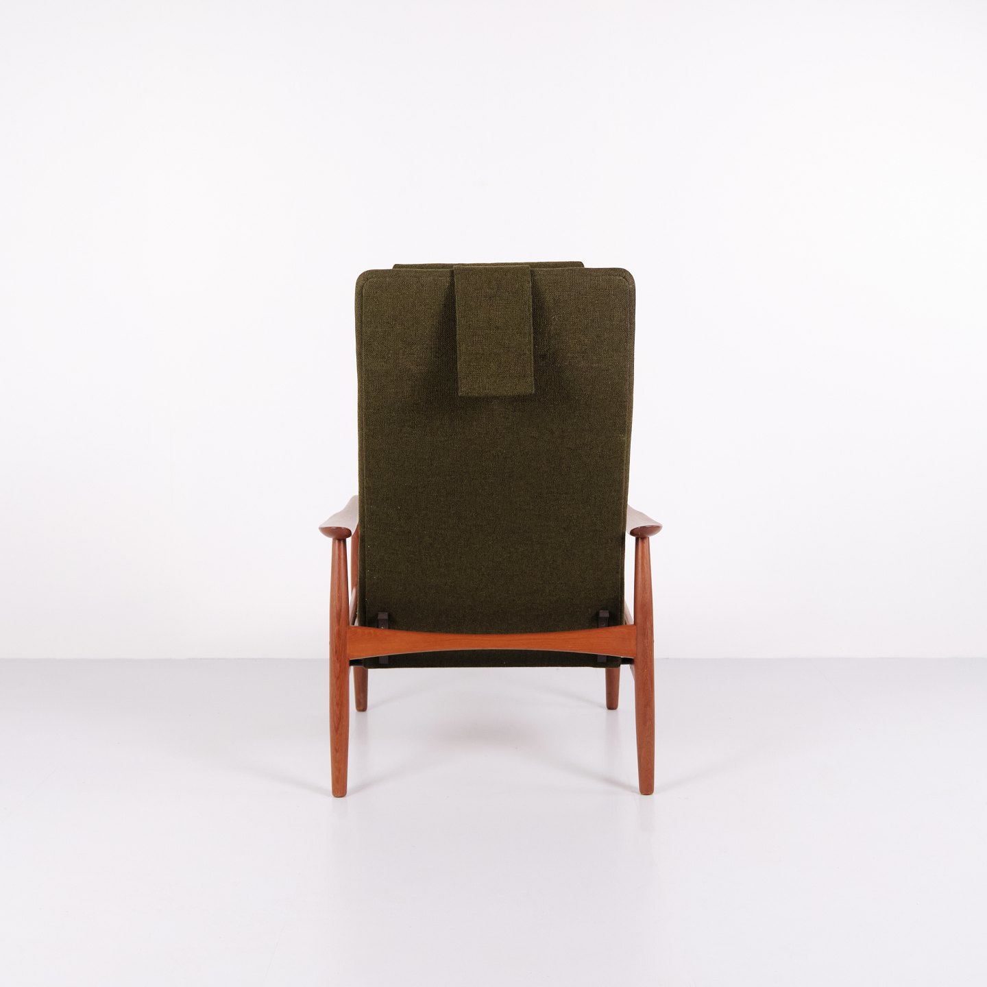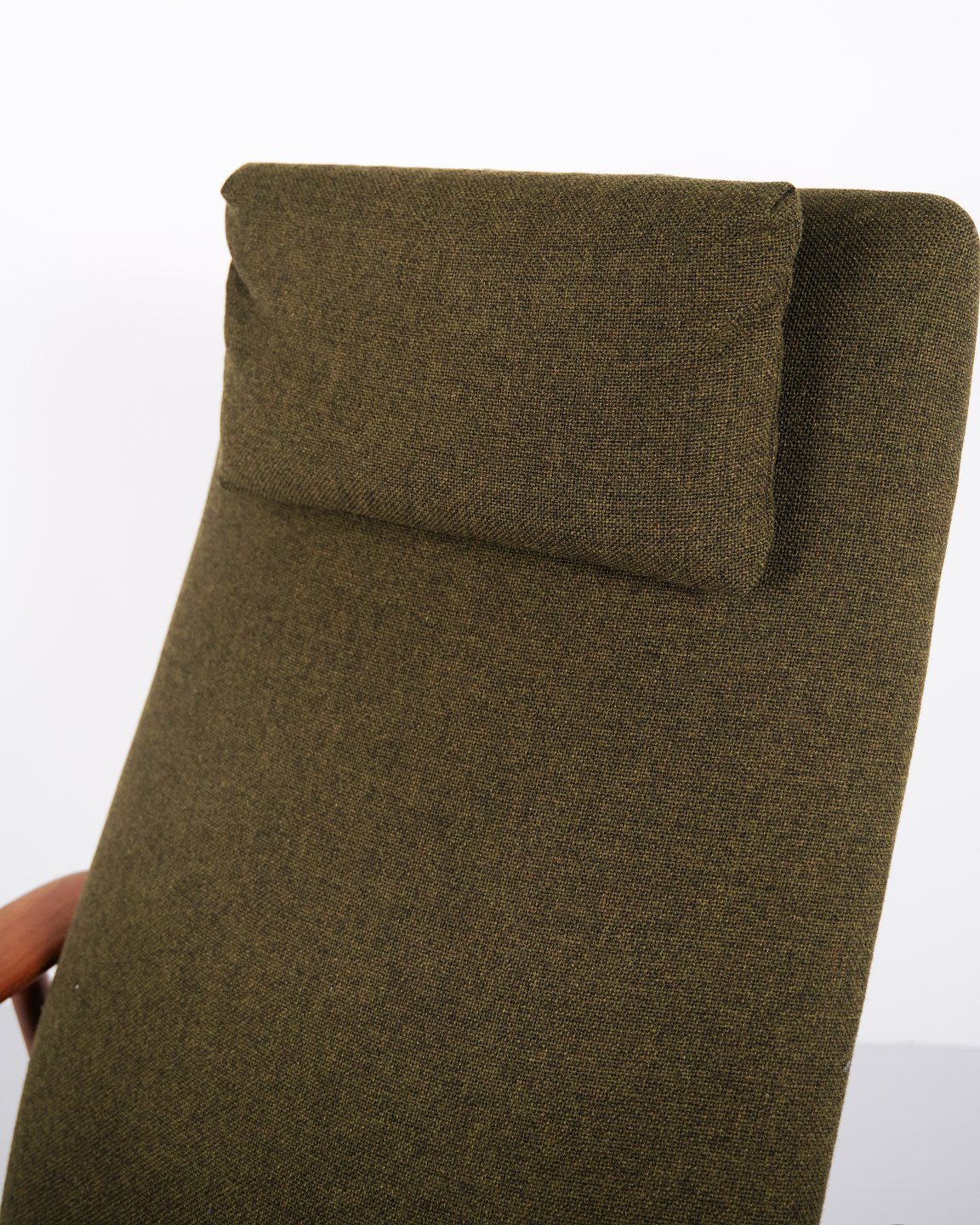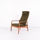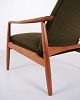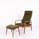 Beskrivelse: Et par hvilestole med skammel designet af Alf Svensson for Fritz Hansen. Teaktræ og grønt stof. Skandinavisk design fra 1960’erne med fokus på komfort.
