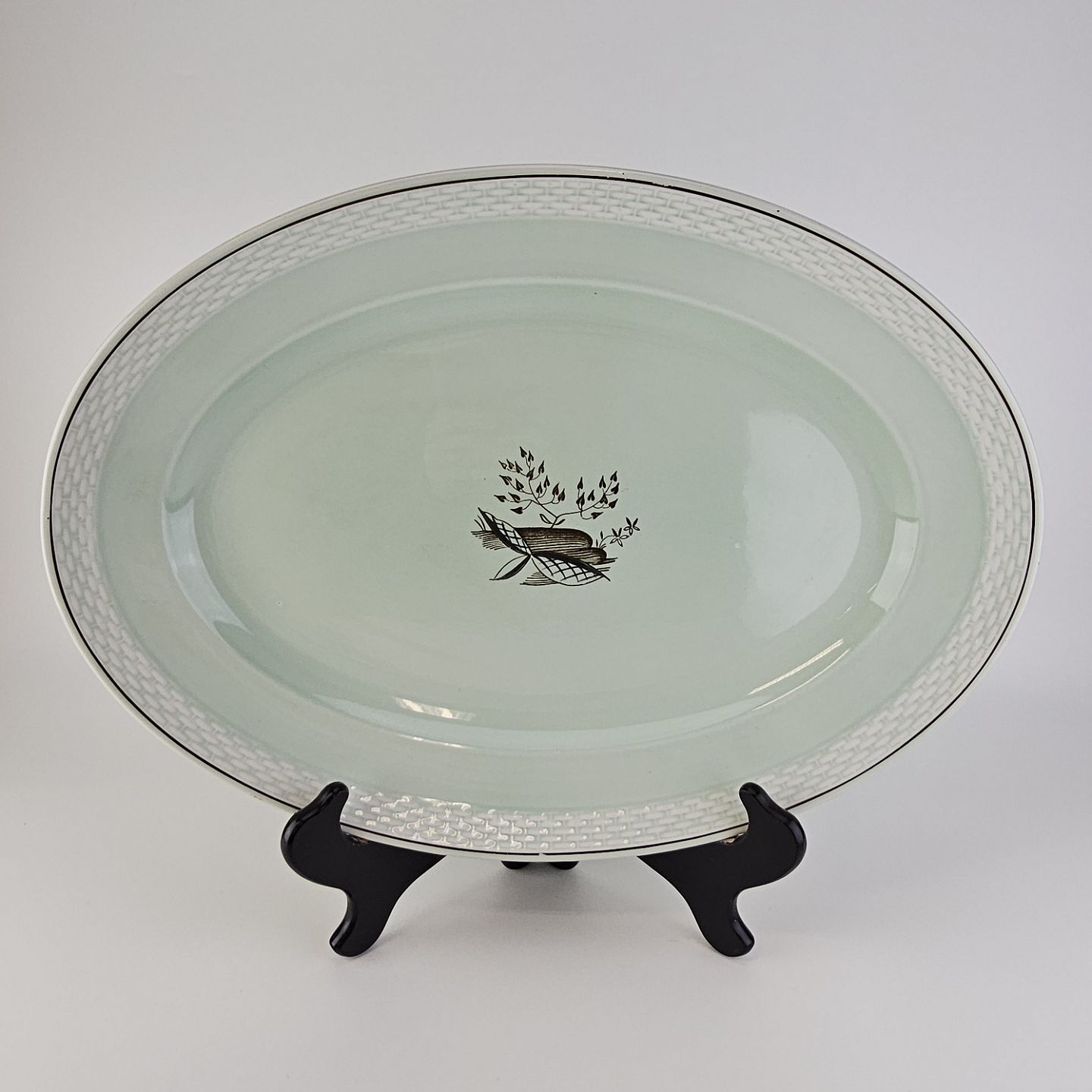 Stel i lysegrøn fajance med natur dekoration og flettet kant