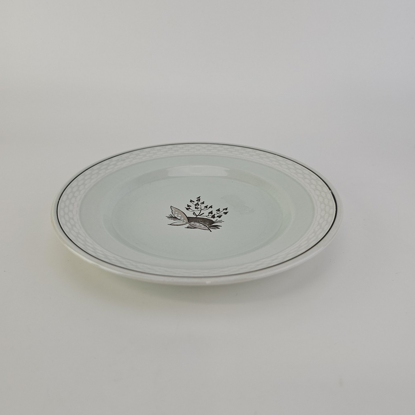 Stel i lysegrøn fajance med natur dekoration og flettet kant