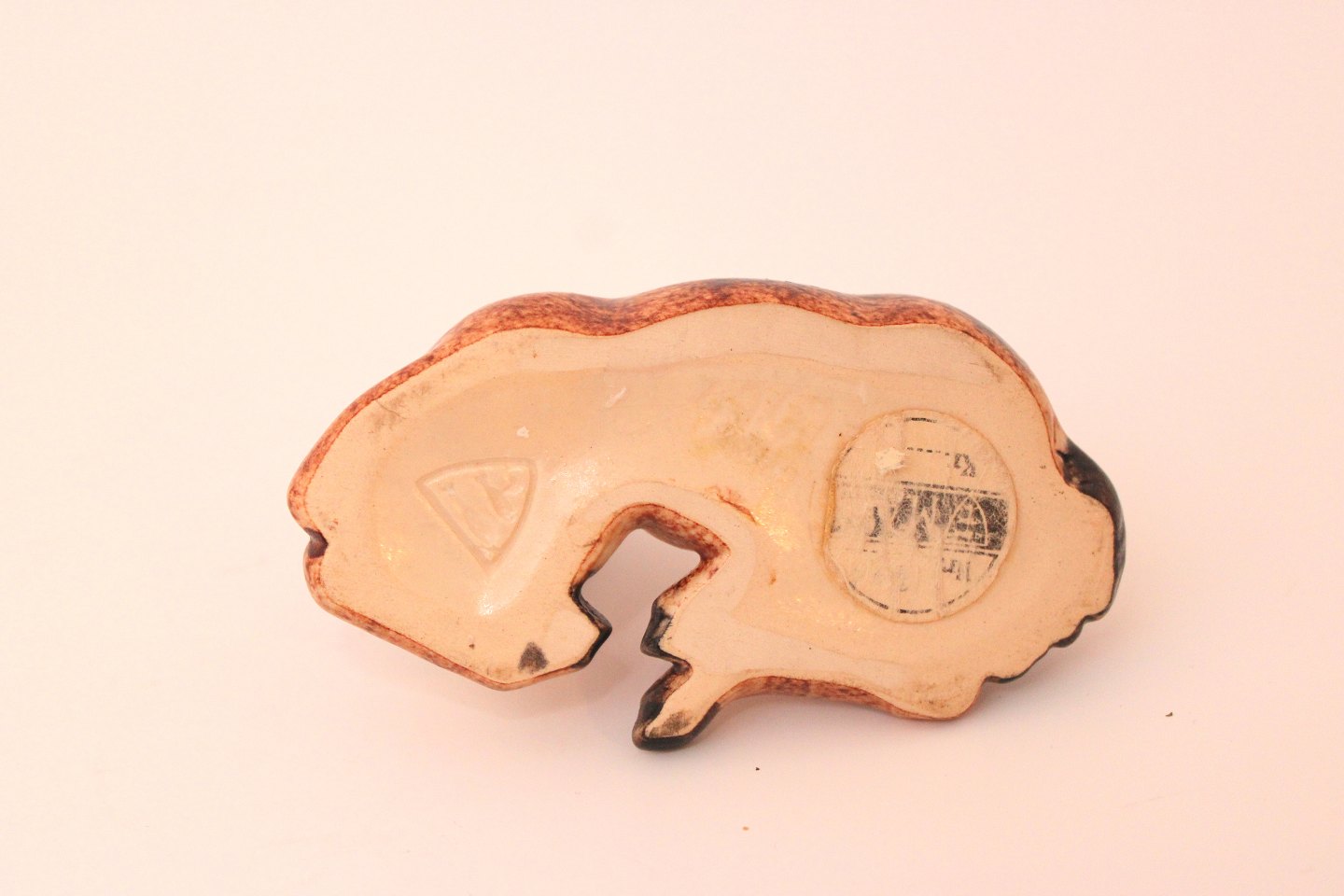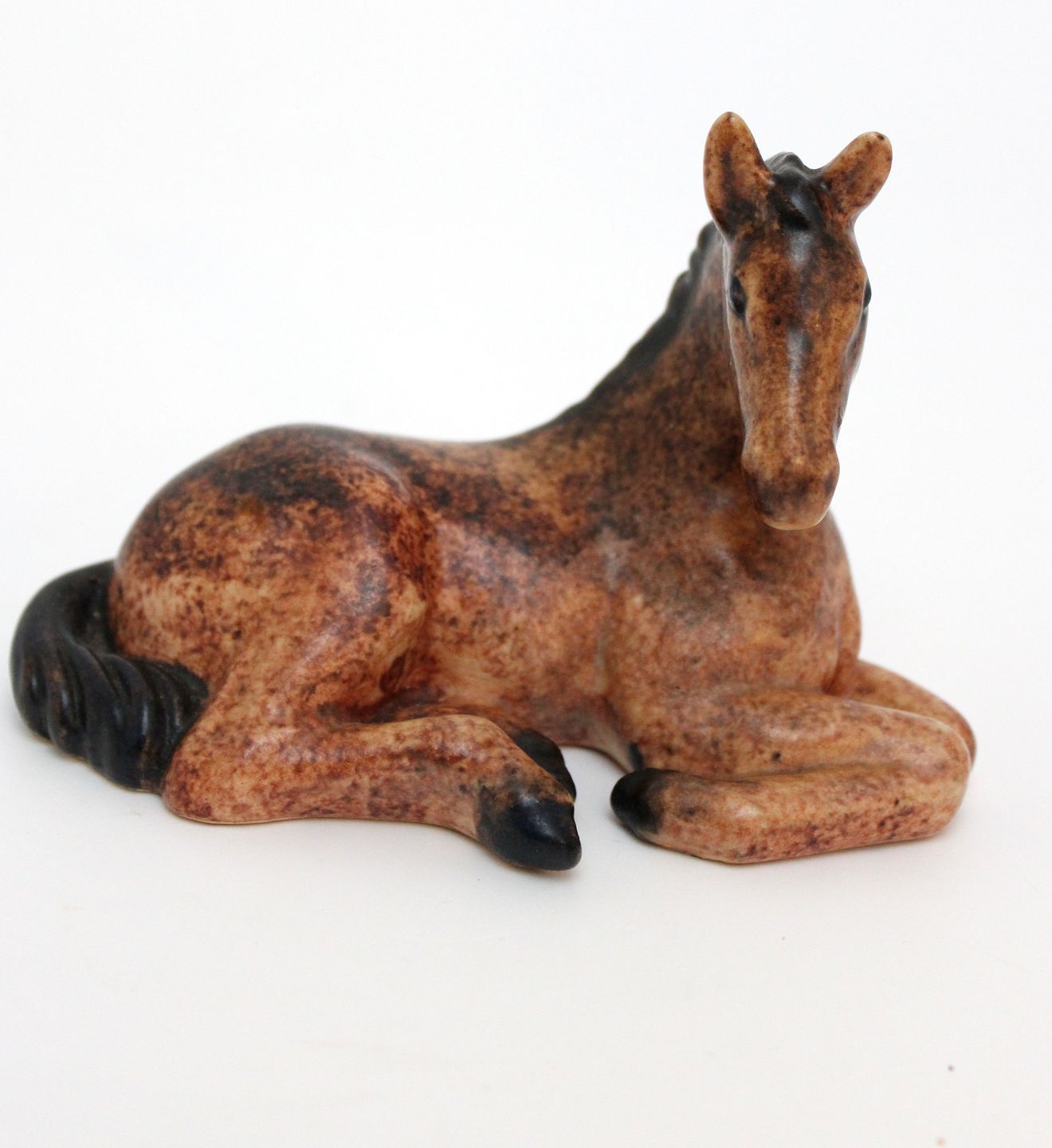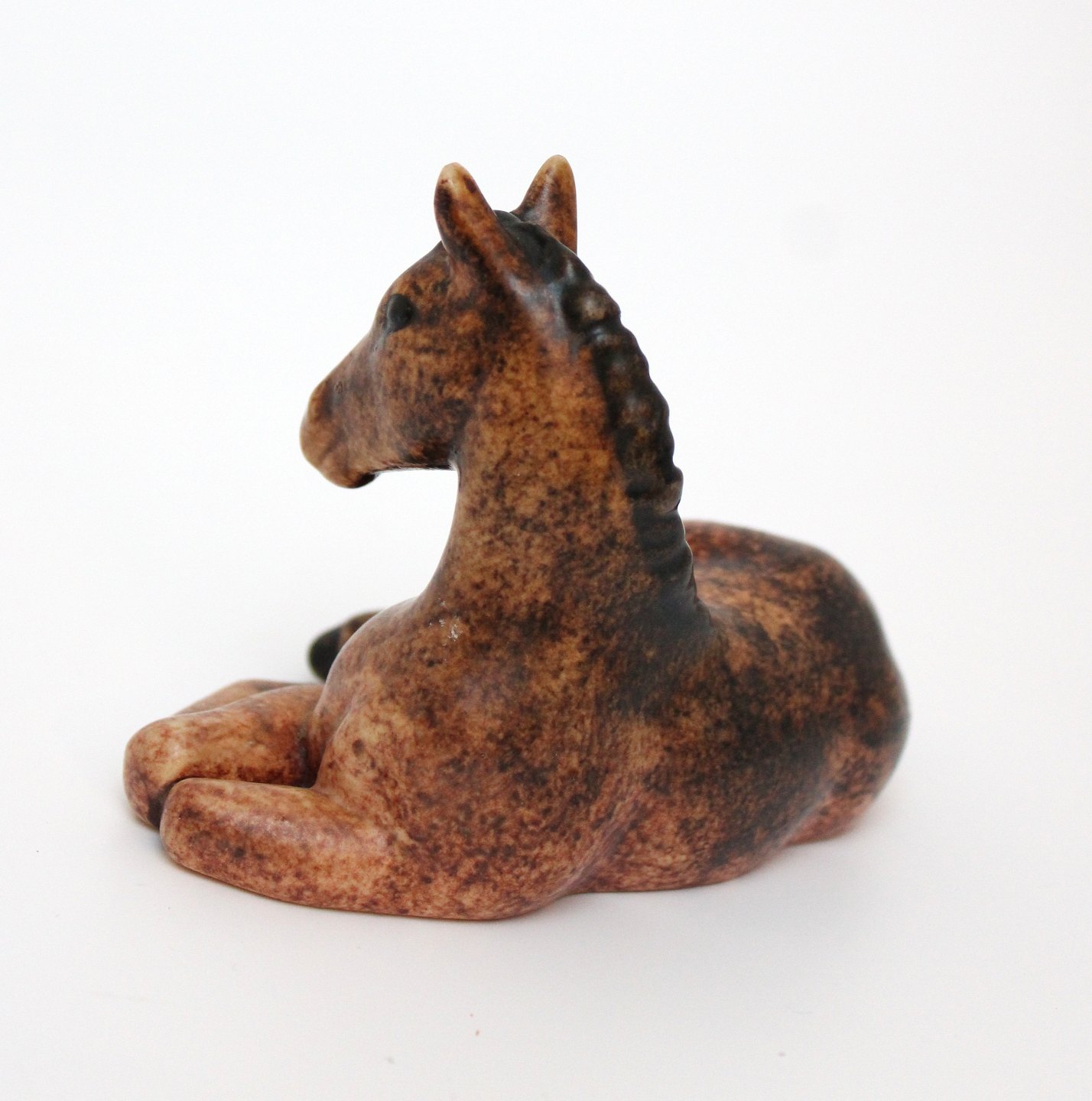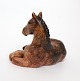 Beskrivelse: Michael Andersen, Bornholm, Lille liggende føl i brun glasur. Stempel + det gamle klistermærke. Længde 12 cm. Højde 8 cm. Flot stand. Pris: 450 kr.