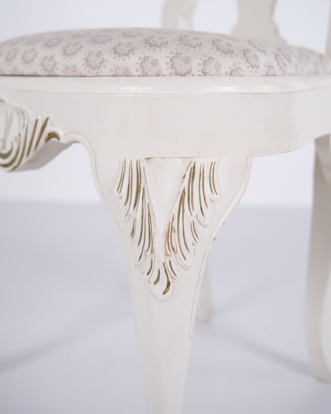 Beskrivelse: Antikke spisebordsstole i ny rokoko stil fra 1920’erne. Sæt af 6 hvidmalede stole med dekorative detaljer.