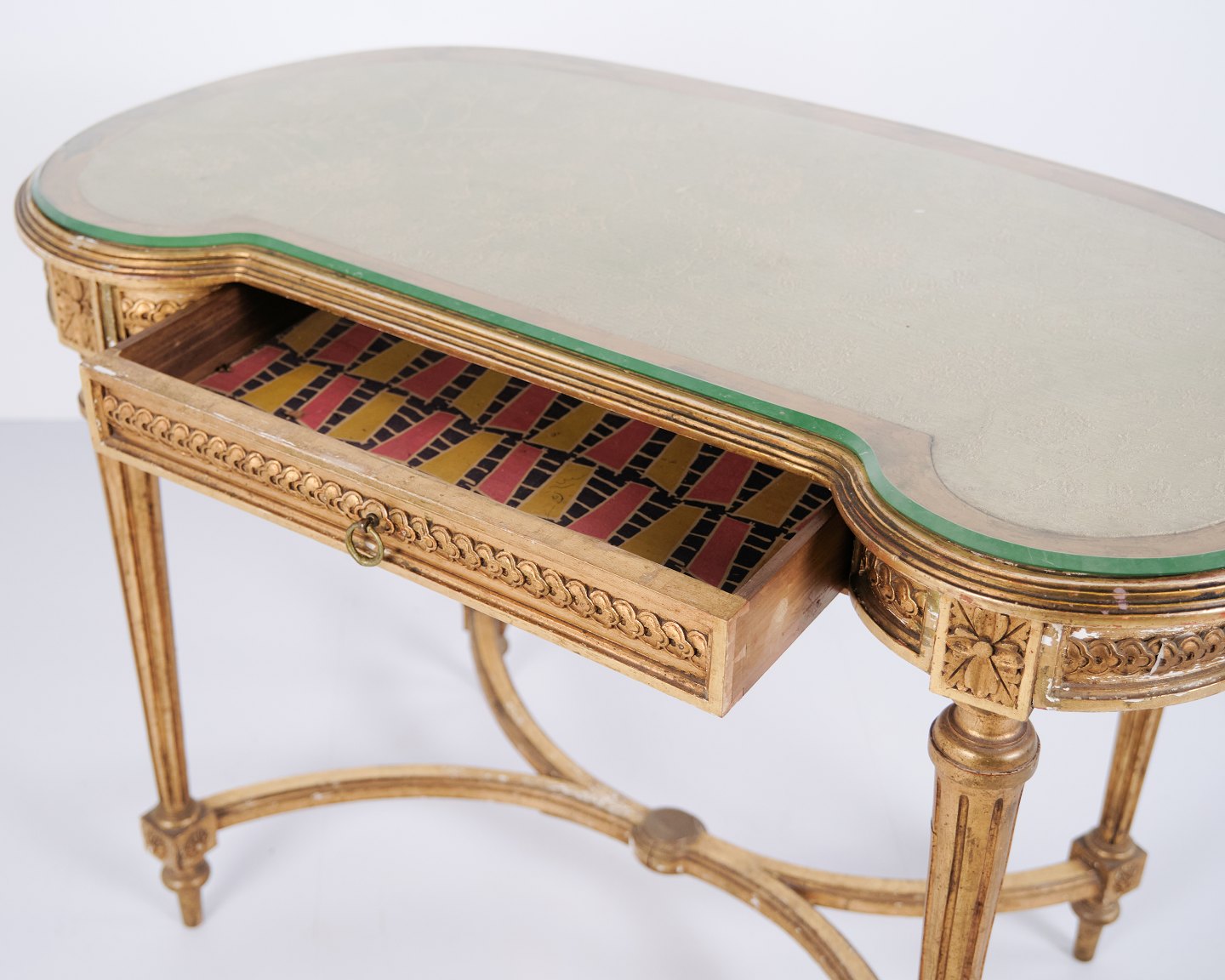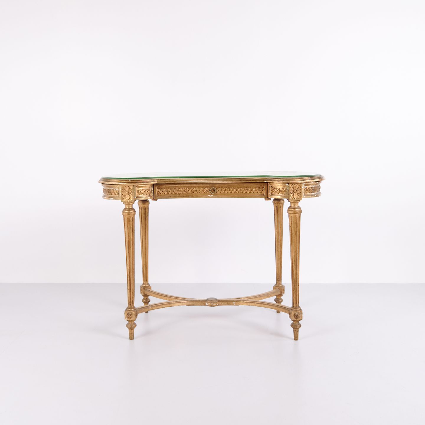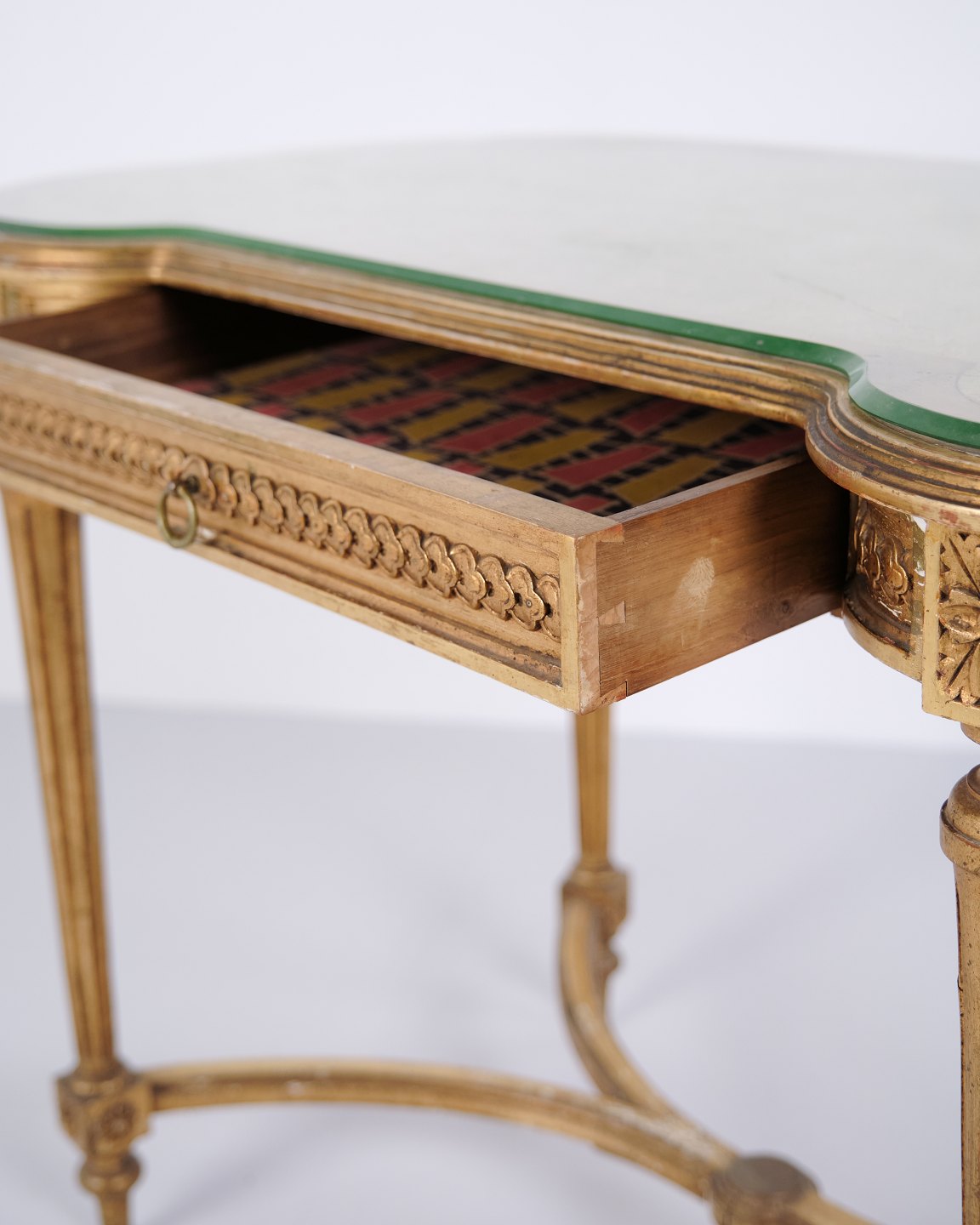 Antik Skrivebord Med Glasbordplade & Skuffe – Gustaviansk/Louis XVI-stil – Forgyldt Træ – År 1850erne
