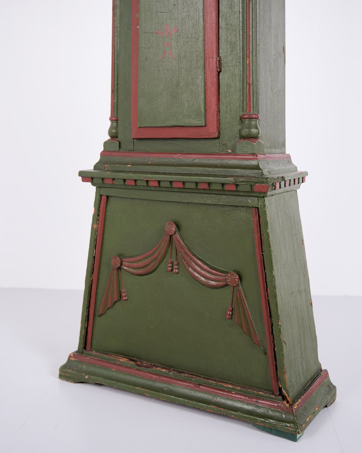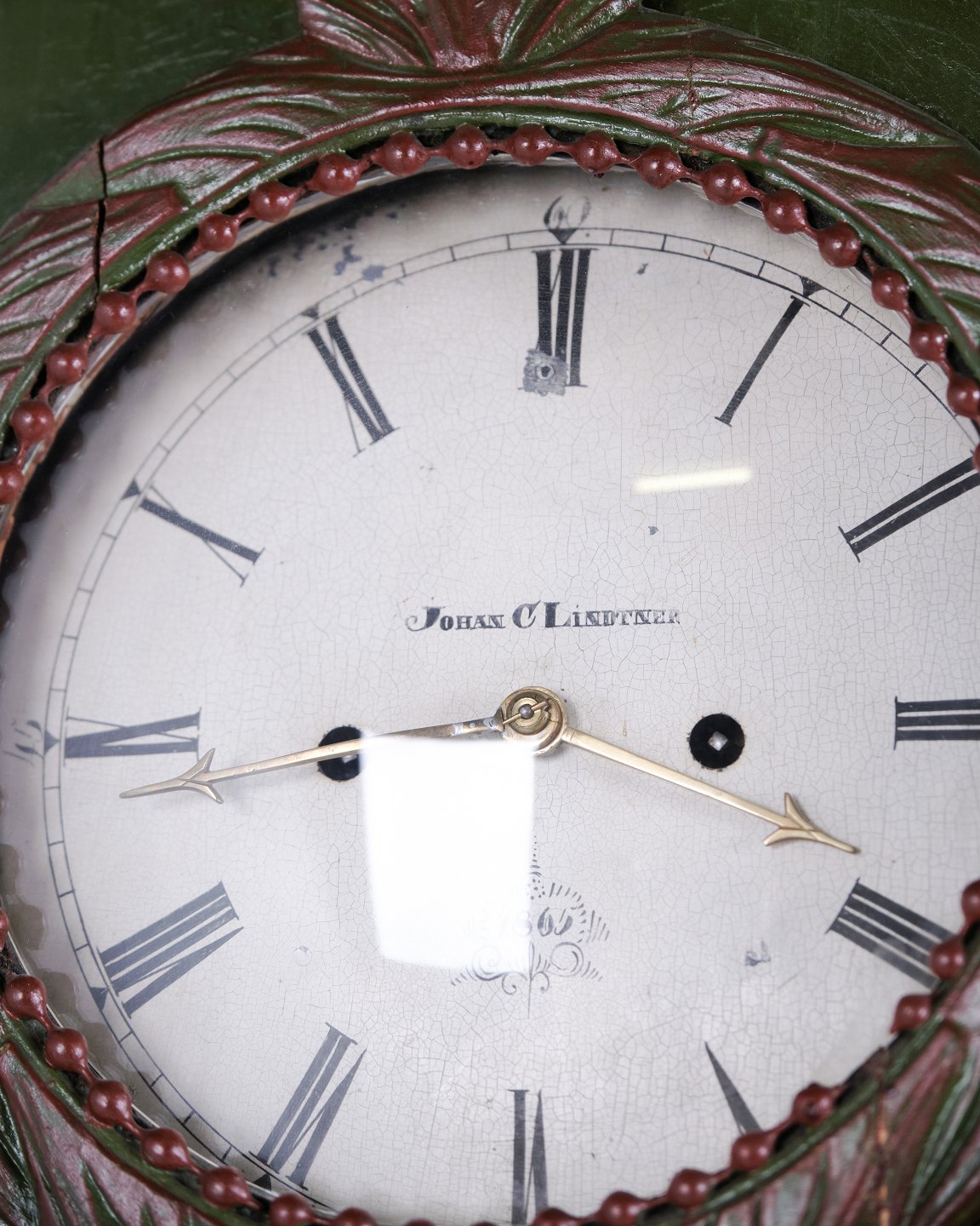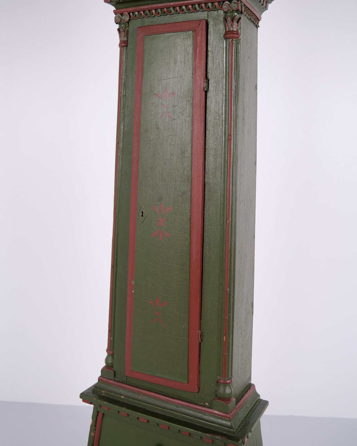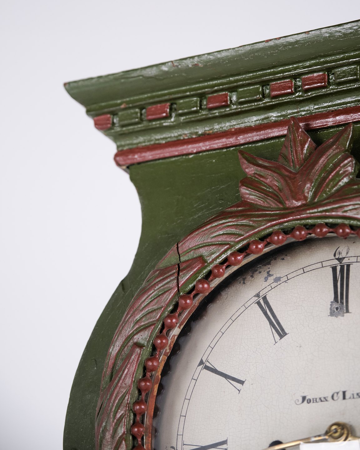 Beskrivelse: Bornholmerur frøkenmodel 1860’erne, håndmalet med udskårne detaljer i grøn/rød bemaling. Antikt bornholmer ur 1800-tallet.