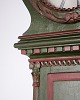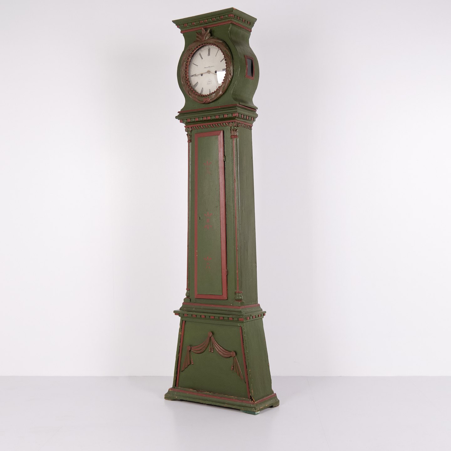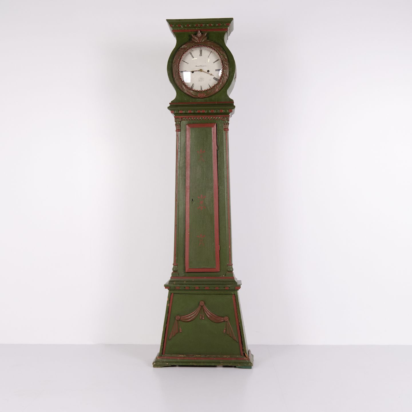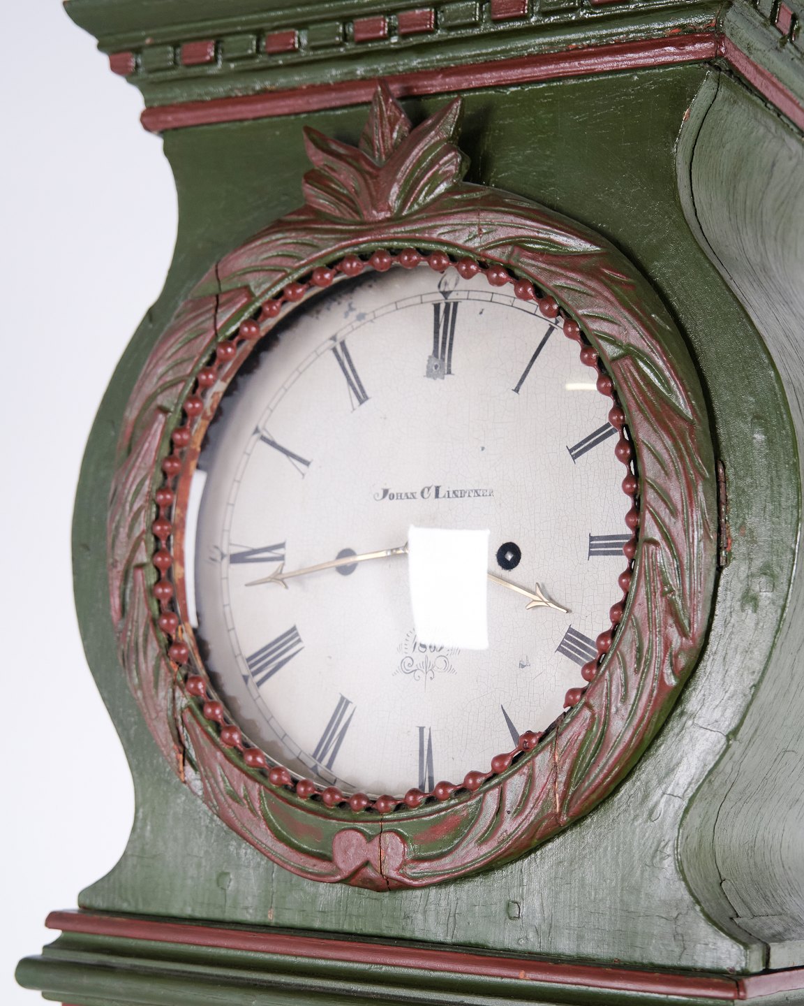 Beskrivelse: Bornholmerur frøkenmodel 1860’erne, håndmalet med udskårne detaljer i grøn/rød bemaling. Antikt bornholmer ur 1800-tallet.
