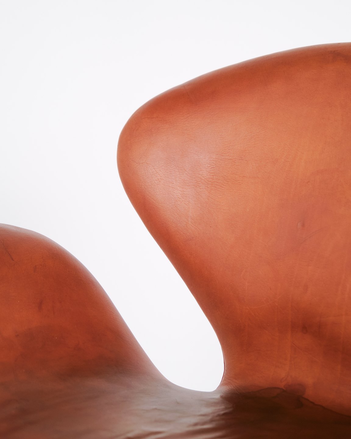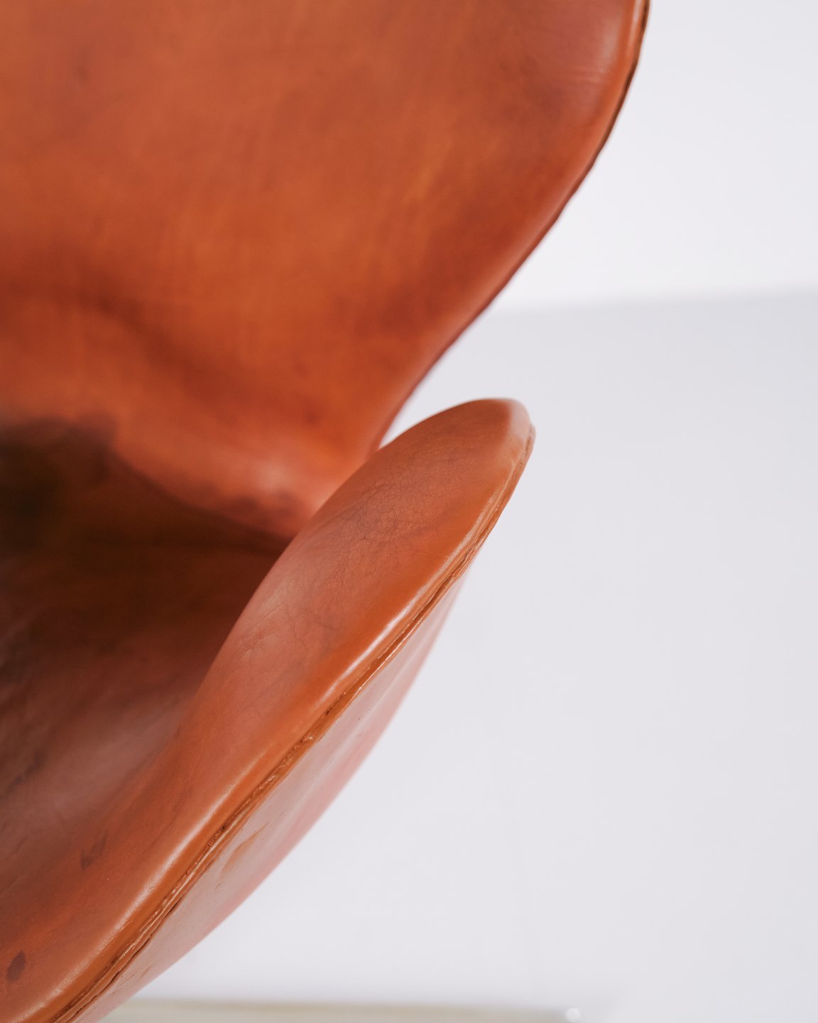Beskrivelse: Svanen model 3320 af Arne Jacobsen for Fritz Hansen i originalt cognac læder fra 1960’erne. Ikonisk dansk design.