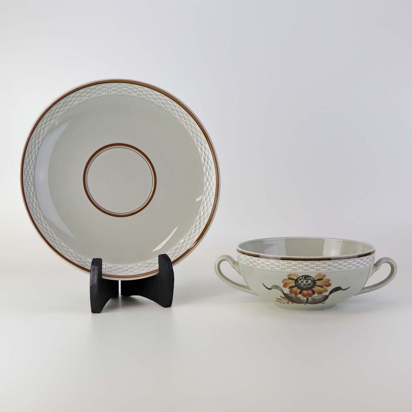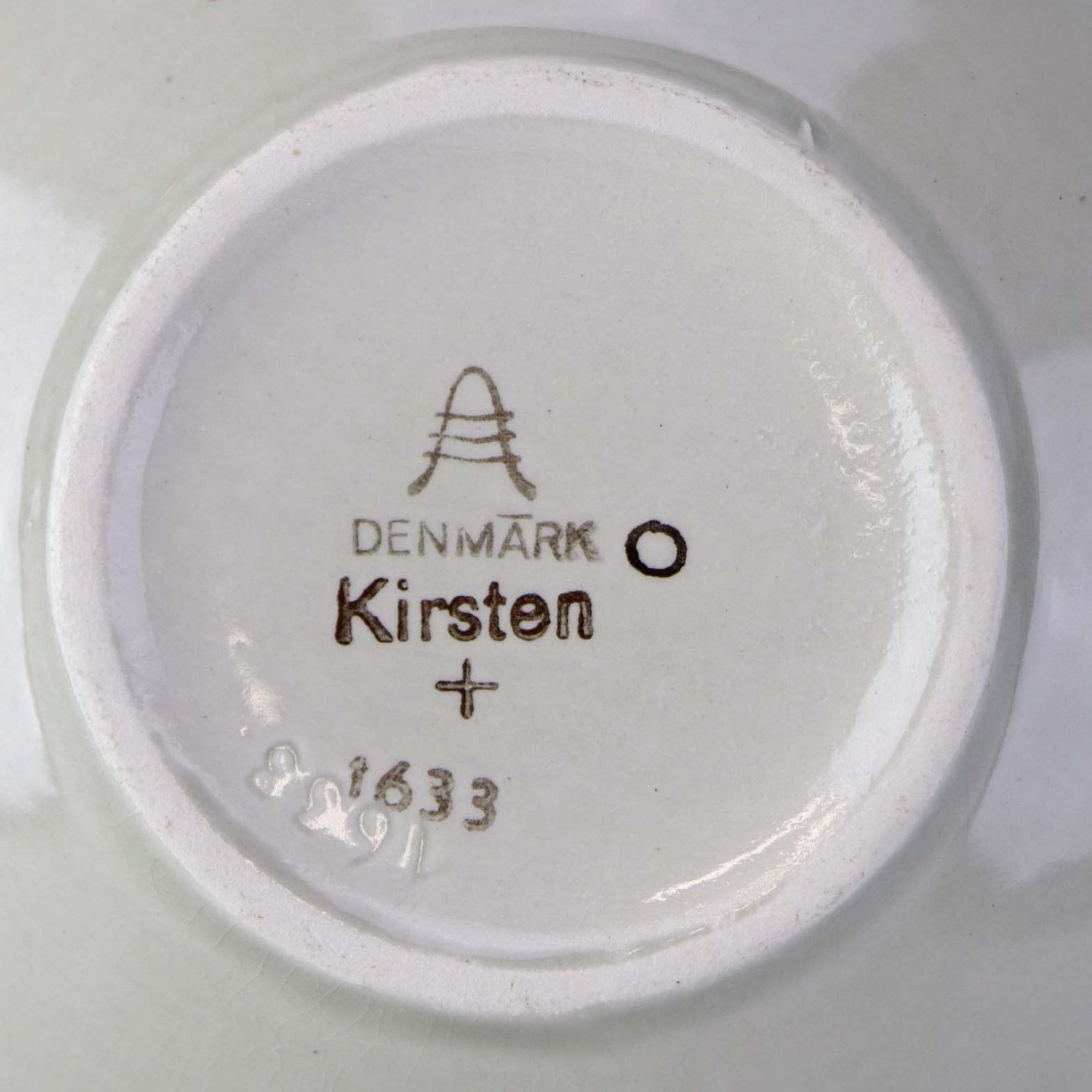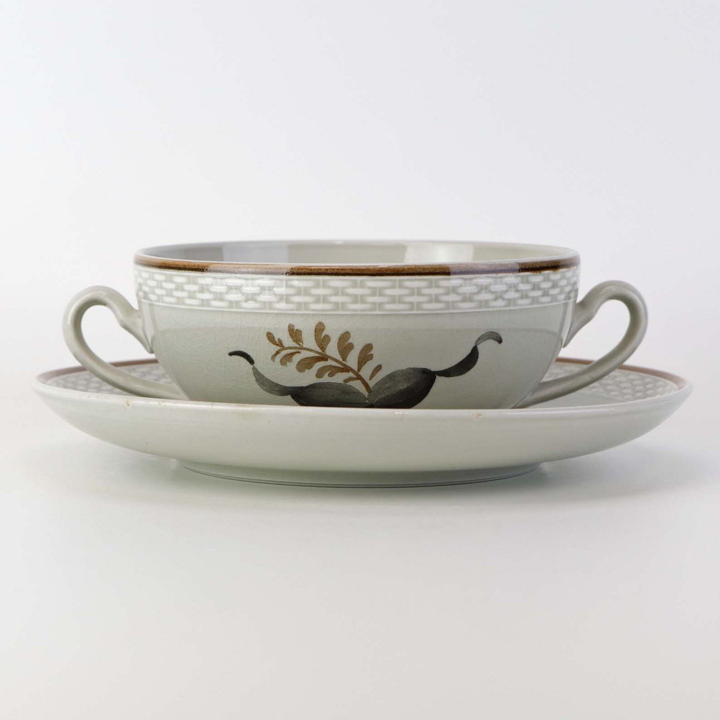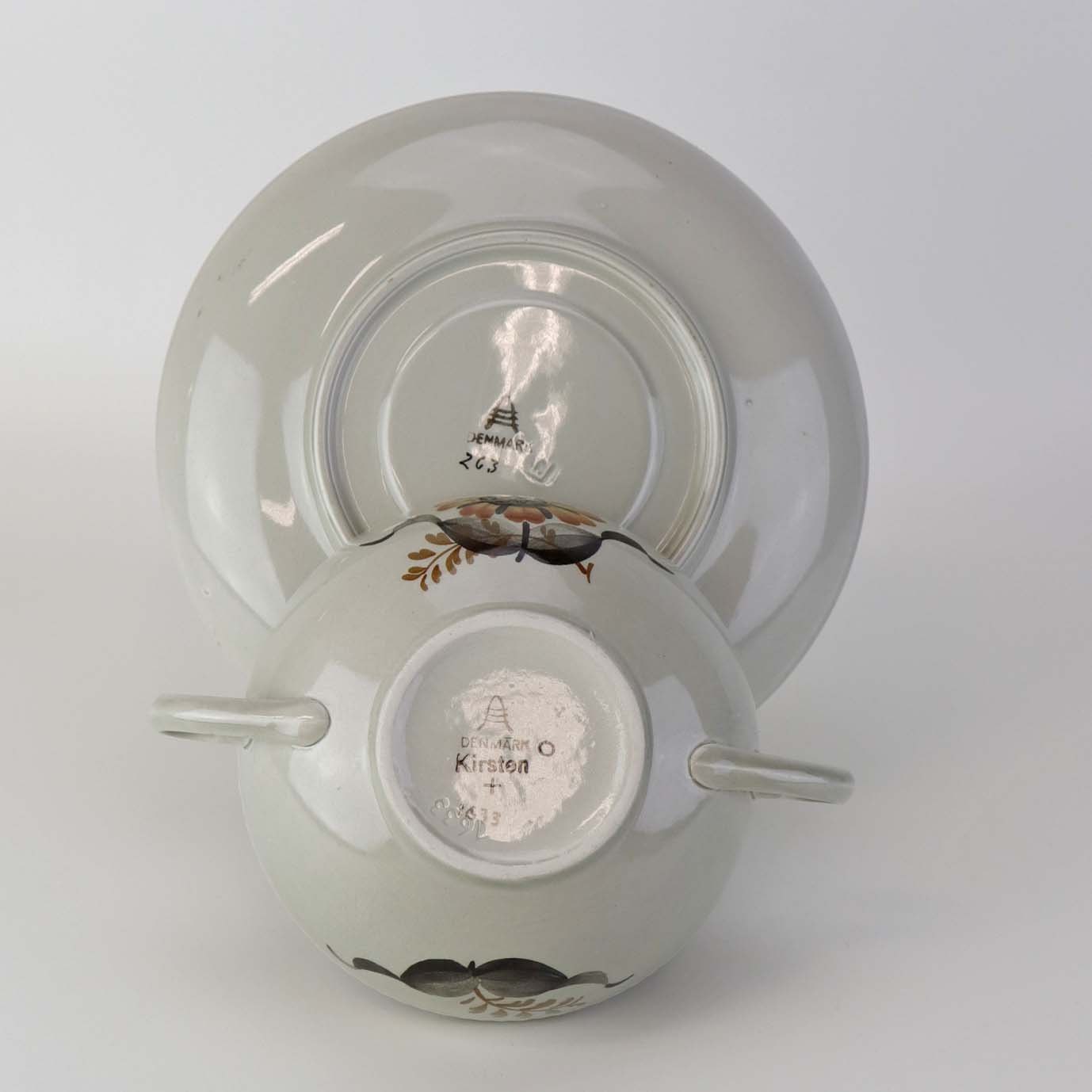 Beskrivelse: Suppekop med underkop i fajance fra stellet Kirsten, som blev fremstillet i perioden 1934-1957. Nr. 263/1633