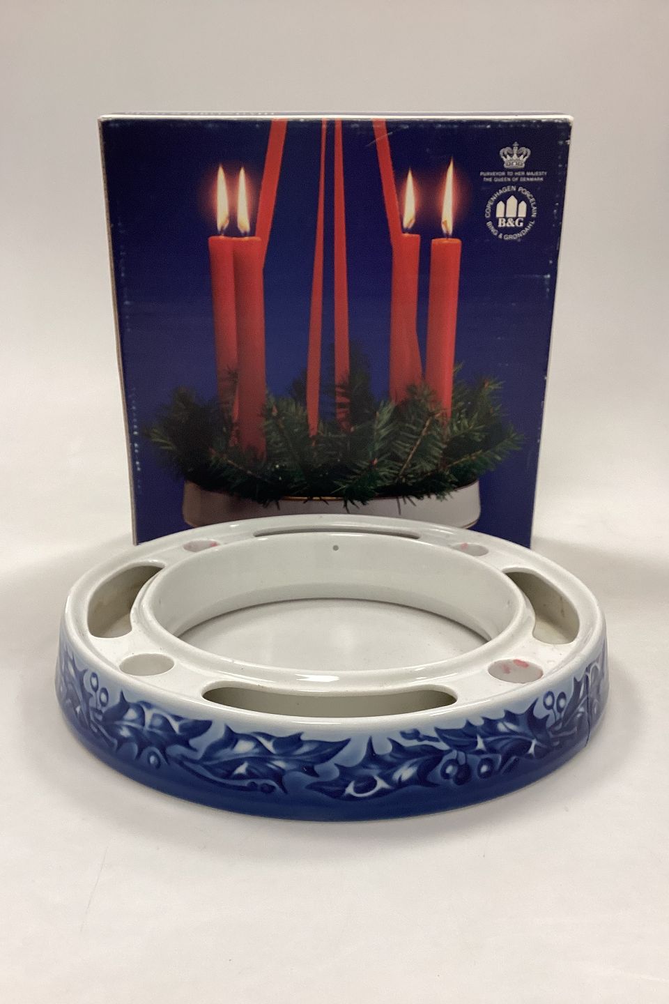 Beskrivelse: Bing og Grøndahl Adventskrans / Lysestage No. 9217. Dekoreret med Kristtjørn i hvidt og blåt.