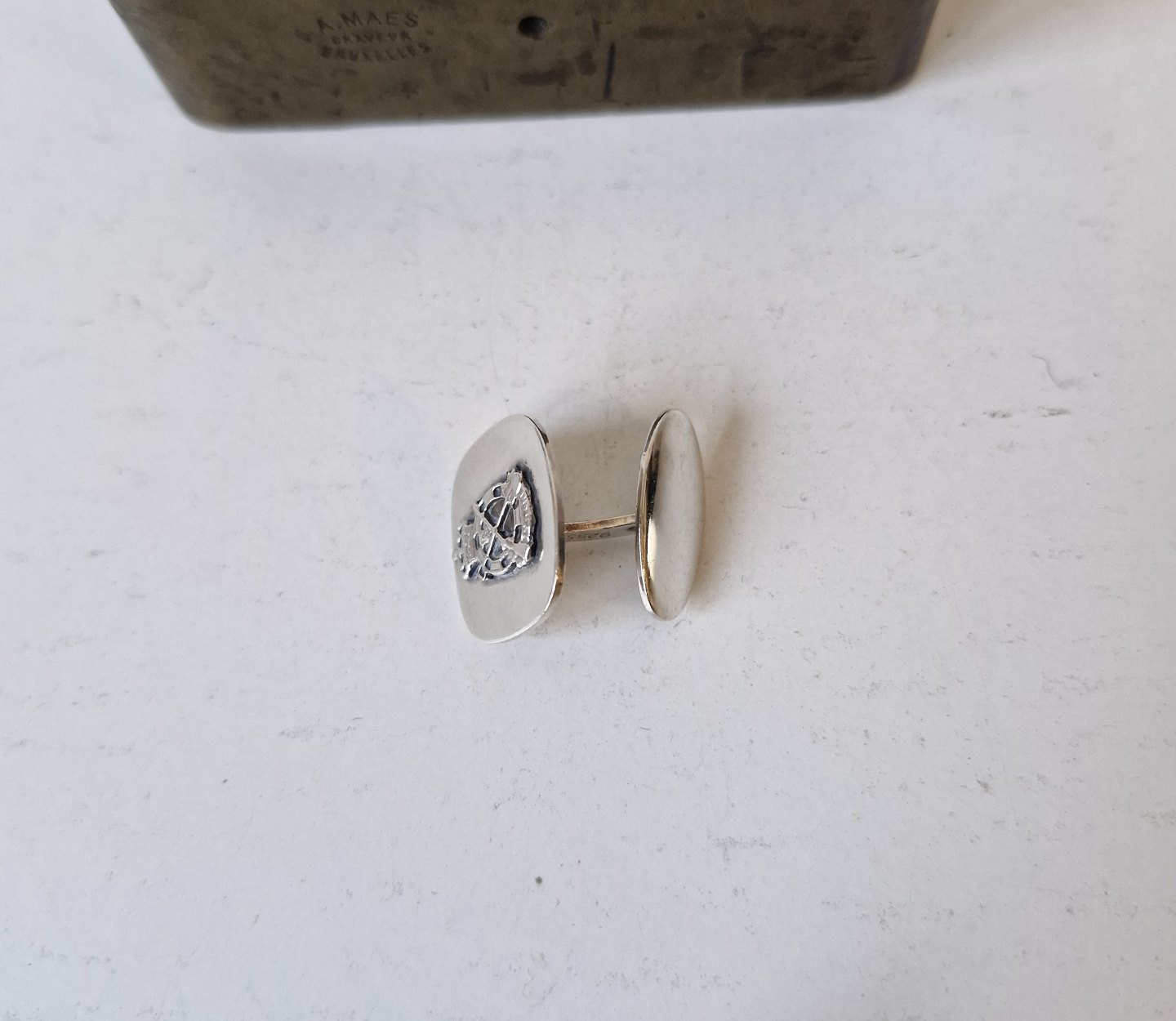 Beskrivelse: Manchetknapper i sterlingsølv med Ingeniørregimentets logo udført af Hermann Siersbøl