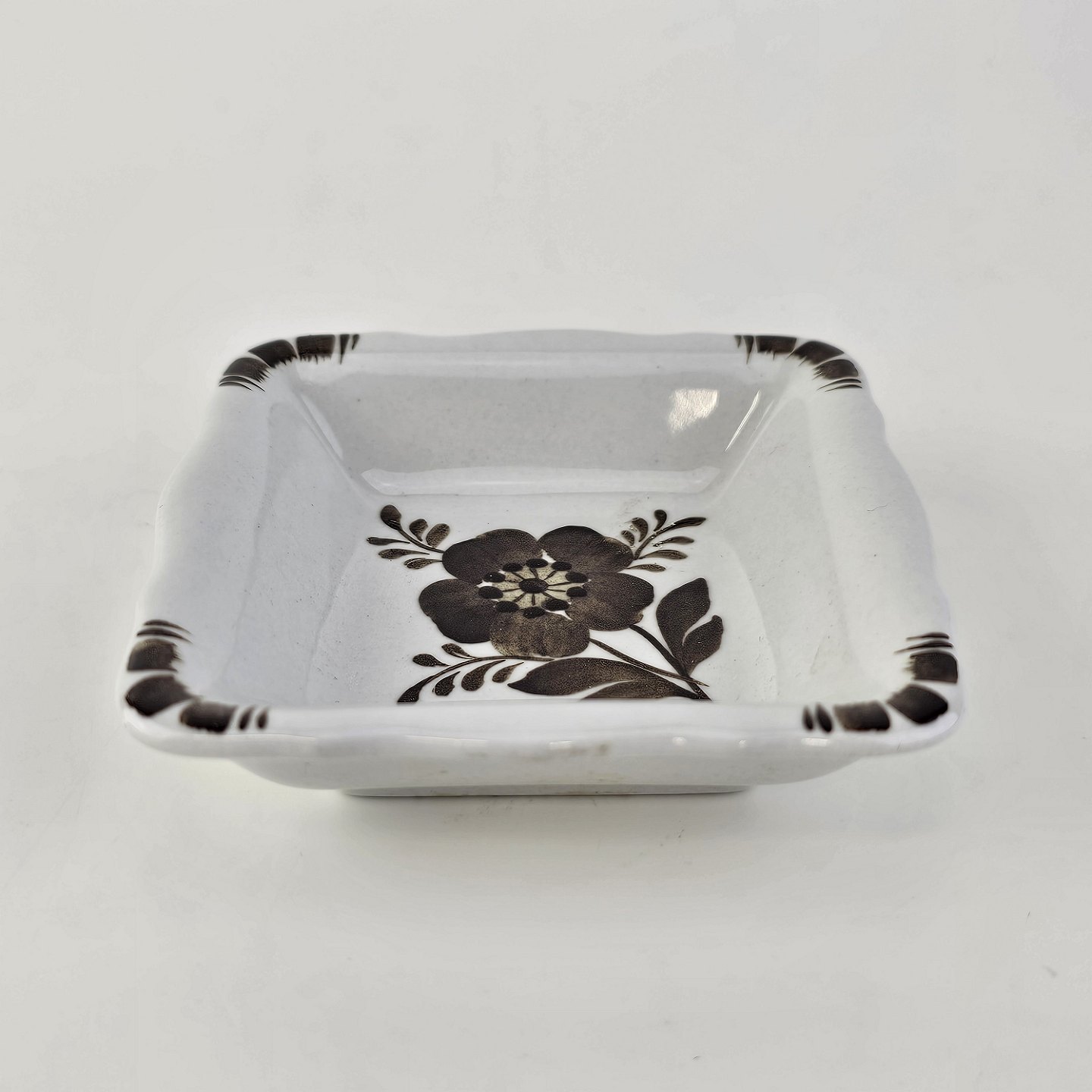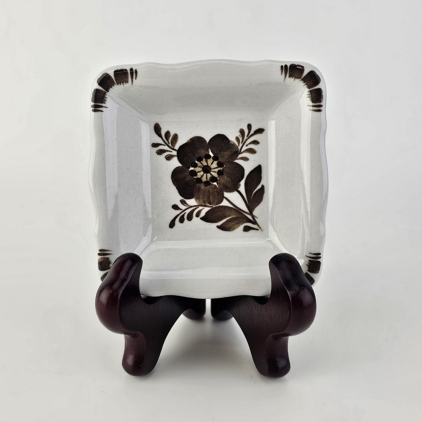 Beskrivelse: Firkantet asiet i fajance fra stellet Brun Tranquebar fra år 1919