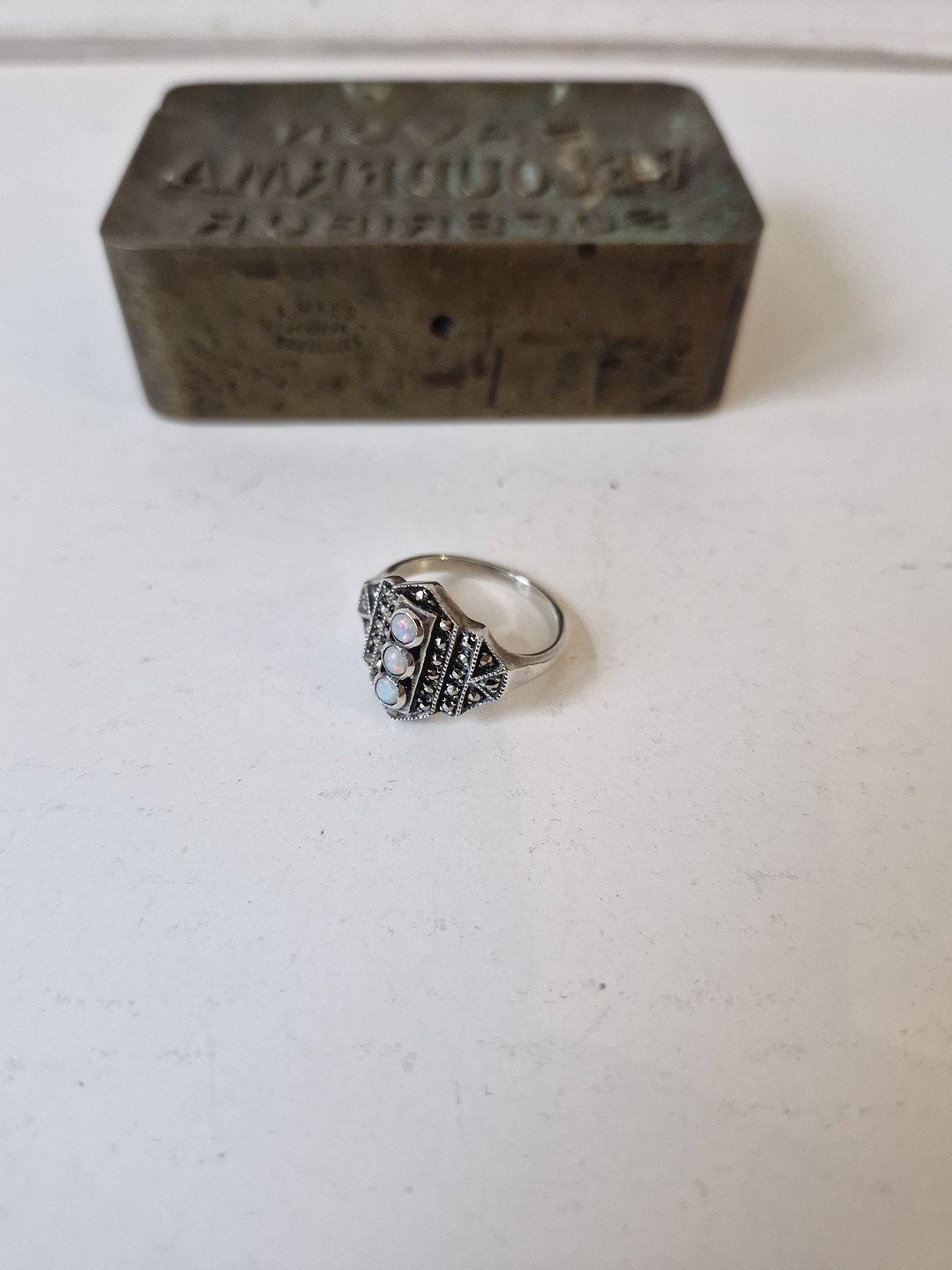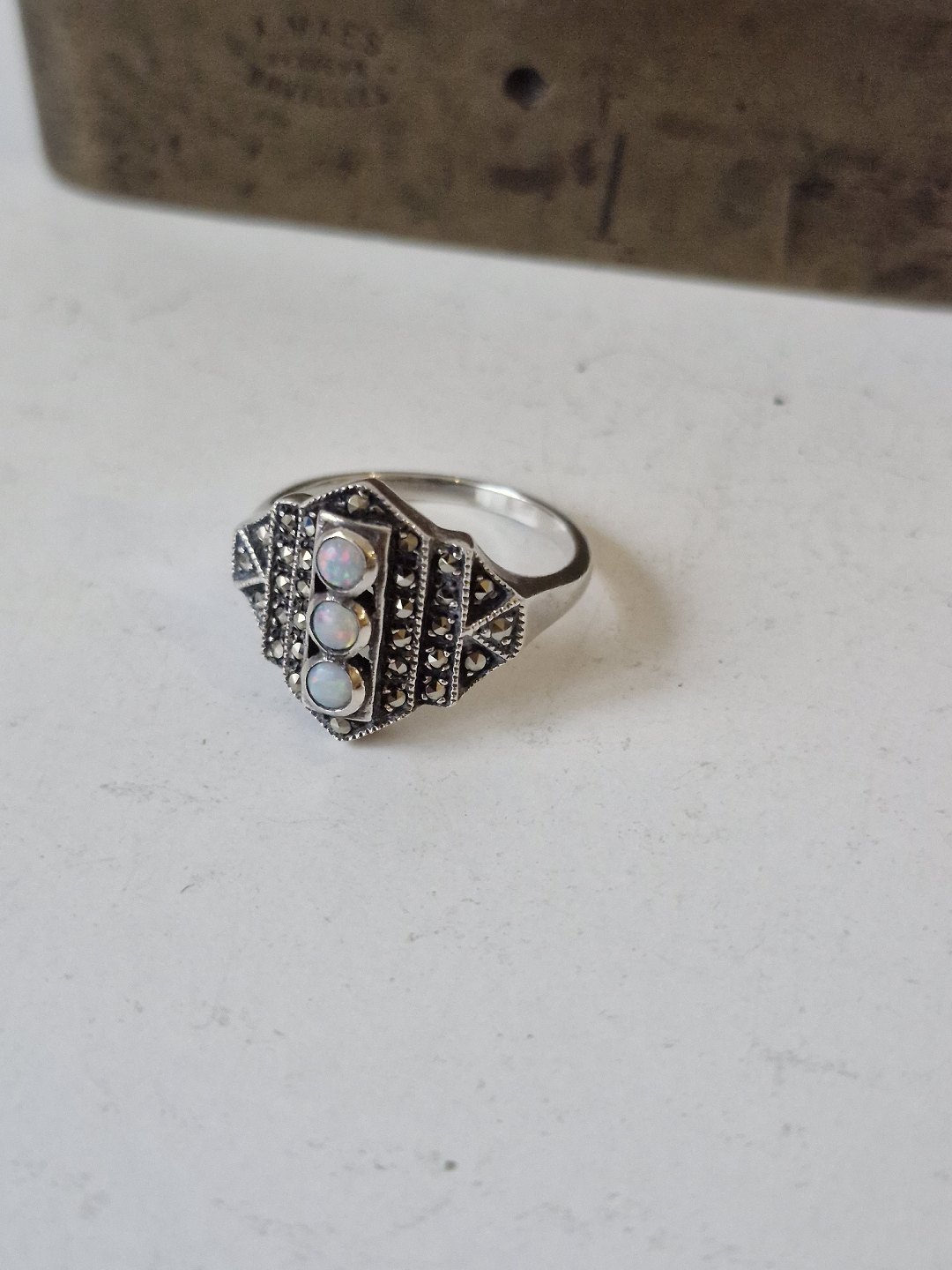 Art deco ring i sterlingsølv med tre opaler omkranset af markasitter