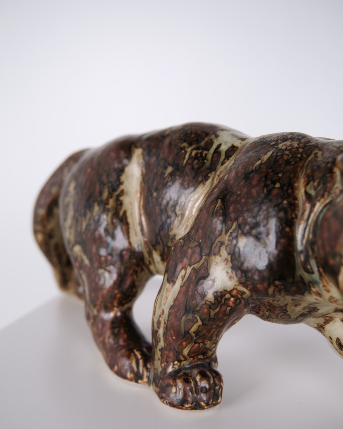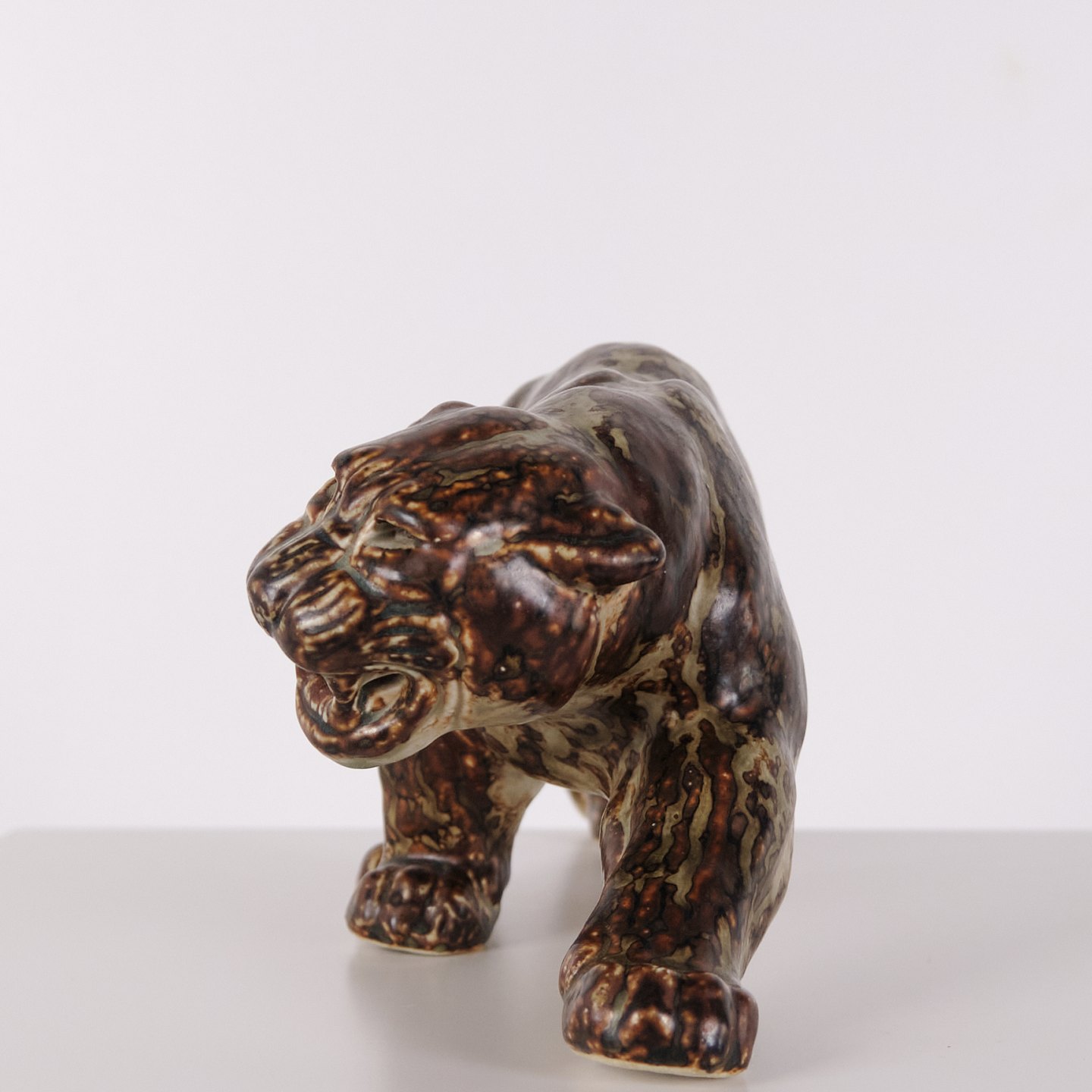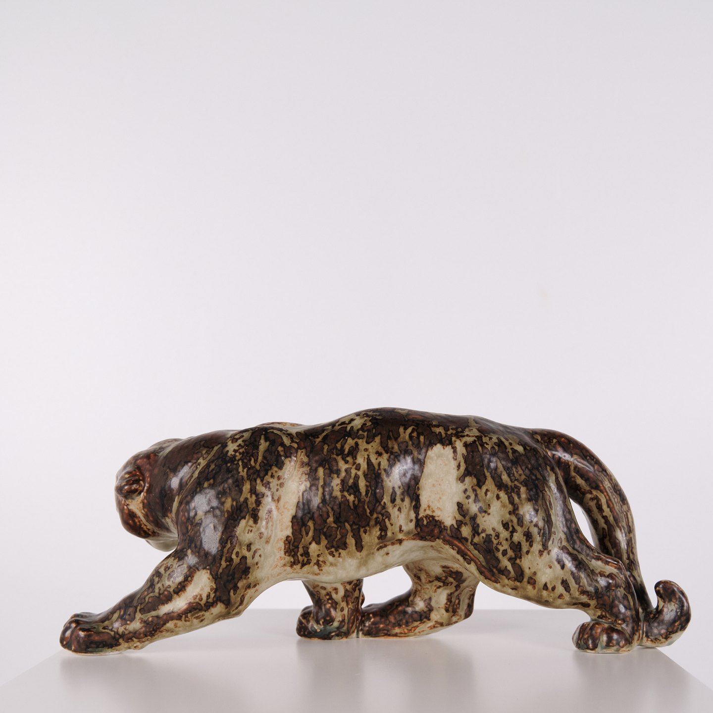 Description: Stoneware figure depicting a panther, model 20283, designed by Knud Kyhn for Royal Copenhagen. The figure is executed in stoneware and is part of Kyhns animal sculptures produced at Royal Copenhagen, recognised for their emphasis on form and movement within Danish ceramic design.