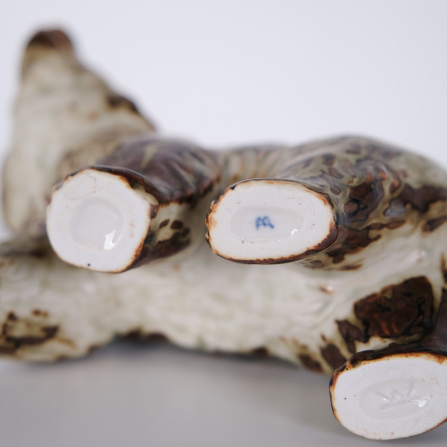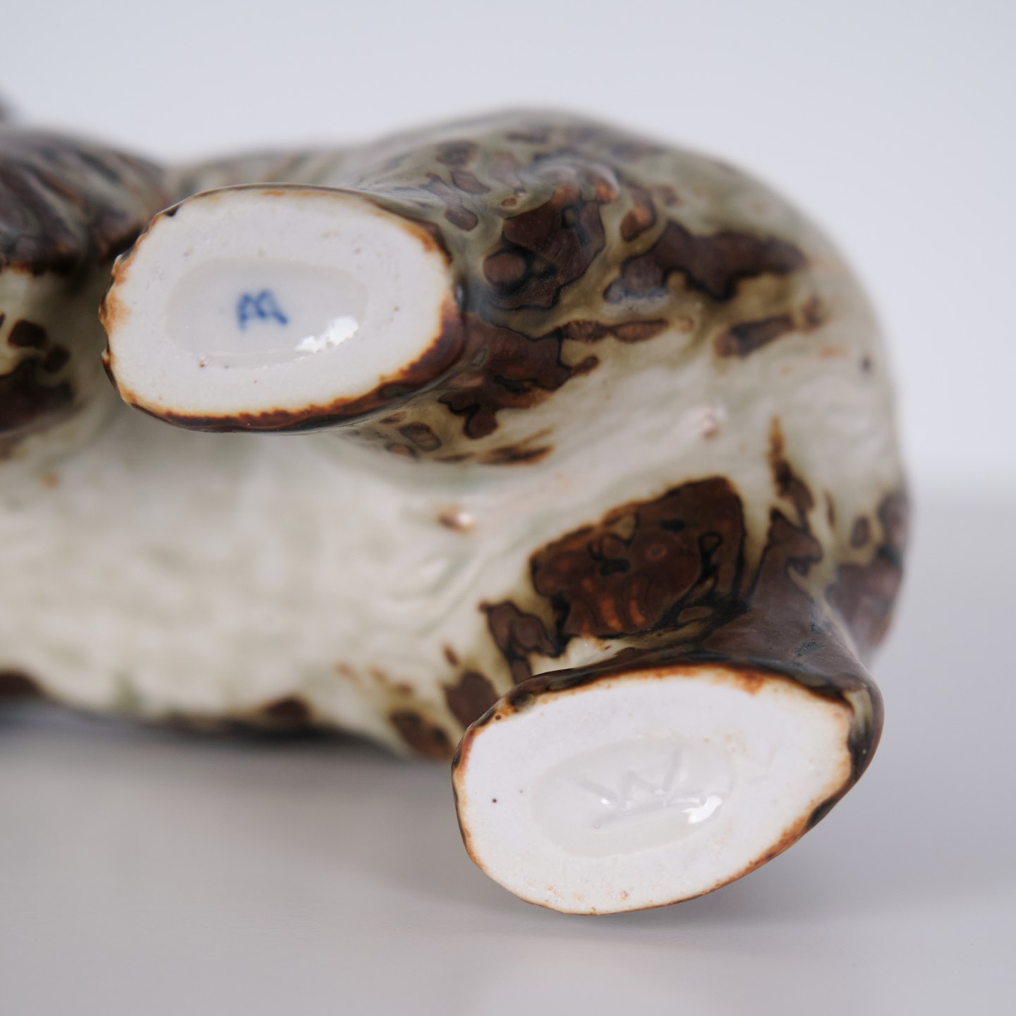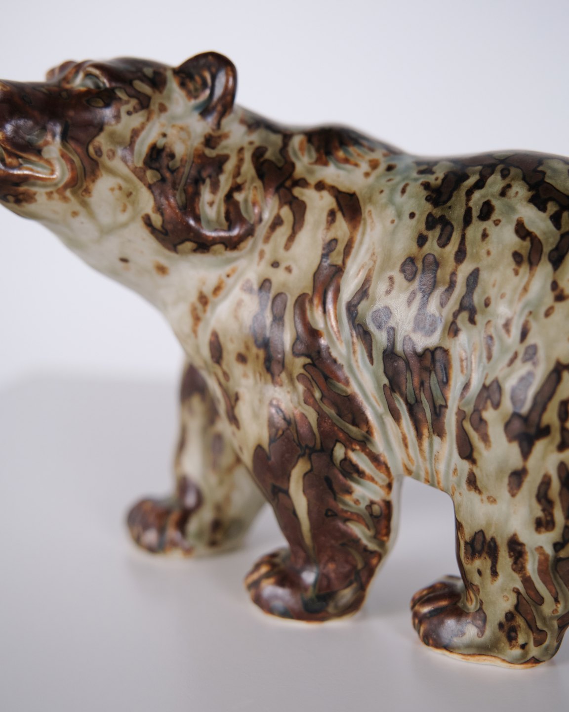 Beskrivelse: Keramikfigur med motiv af bjørn, model 20155, designet af Knud Kyhn for Royal Copenhagen. Figuren er udført i stentøj og produceret hos Royal Copenhagen omkring 1960. Modellen er en del af Kyhns omfattende arbejde med dyrefigurer, kendetegnet ved tydelig form og fokus på dyrets kropsvolumen. Et klassisk eksempel på dansk keramisk design fra midten af det 20. århundrede.