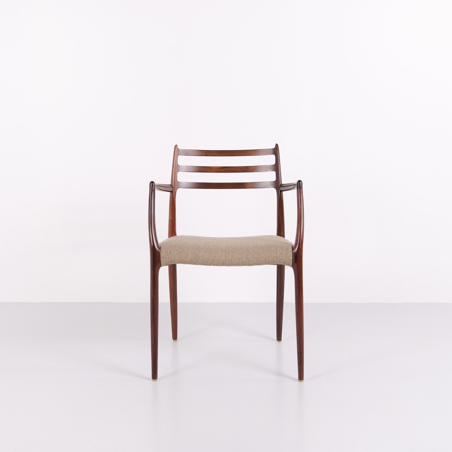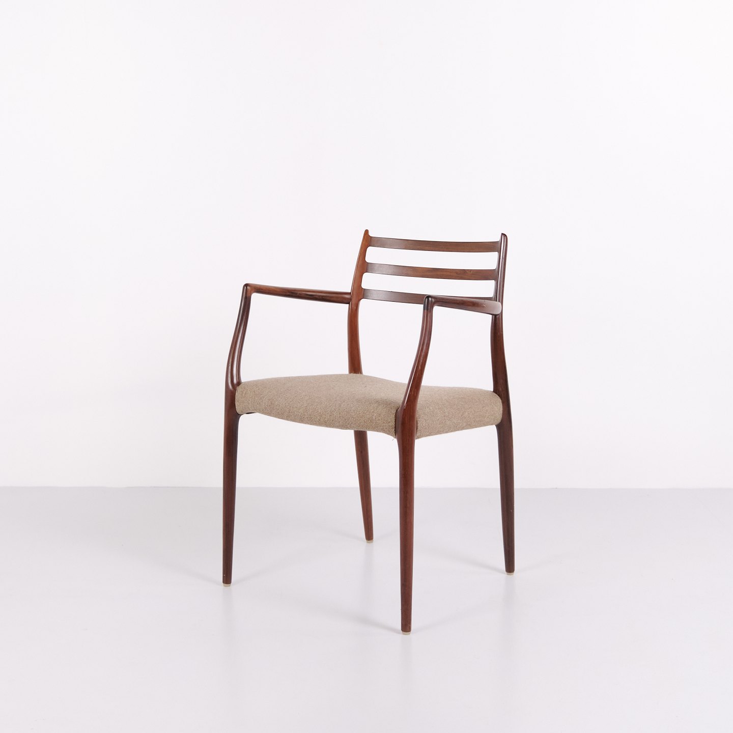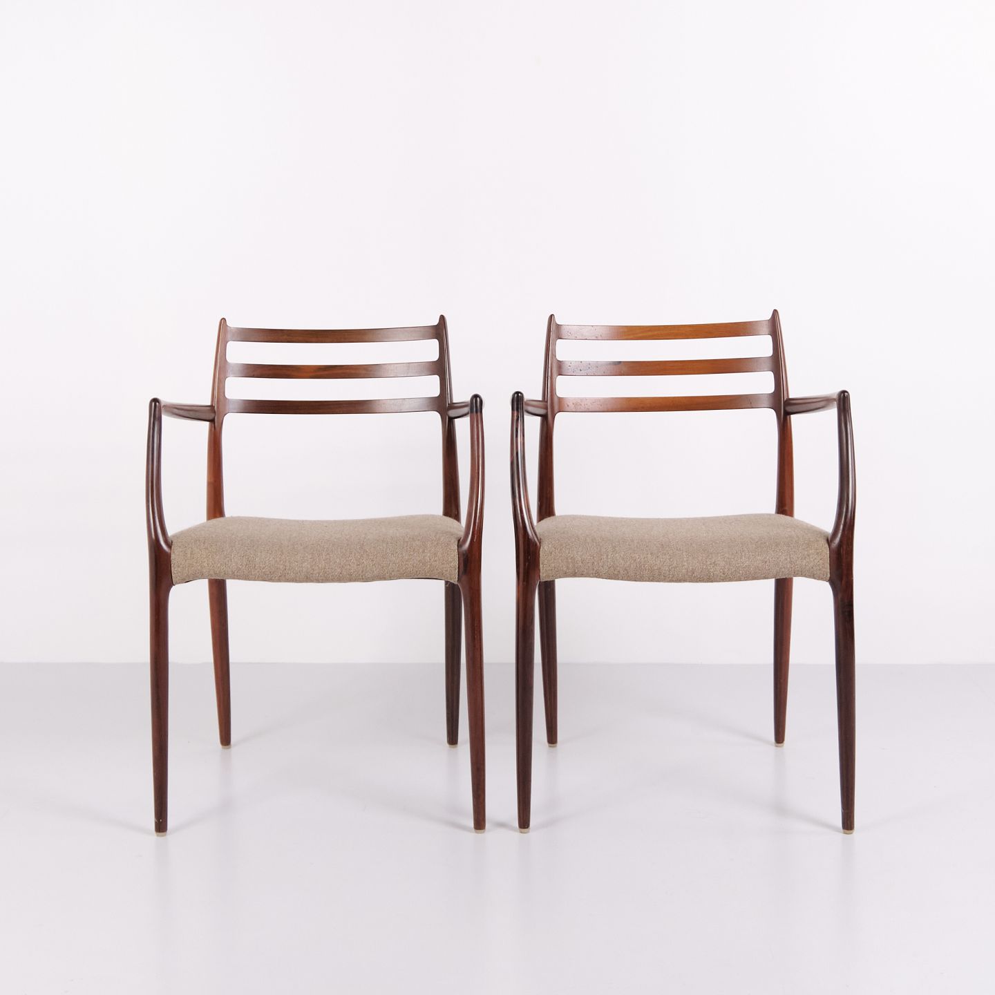 Beskrivelse: Sæt armstole, model 62, designet af Niels Otto Møller i 1962. Stolene er udført i palisander og er kendt for deres slanke konstruktion, præcise snedkerdetaljer og ergonomiske opbygning. Model 62 regnes blandt Niels Otto Møllers mest anerkendte stole og er et markant eksempel på dansk møbeldesign fra begyndelsen af 1960’erne.