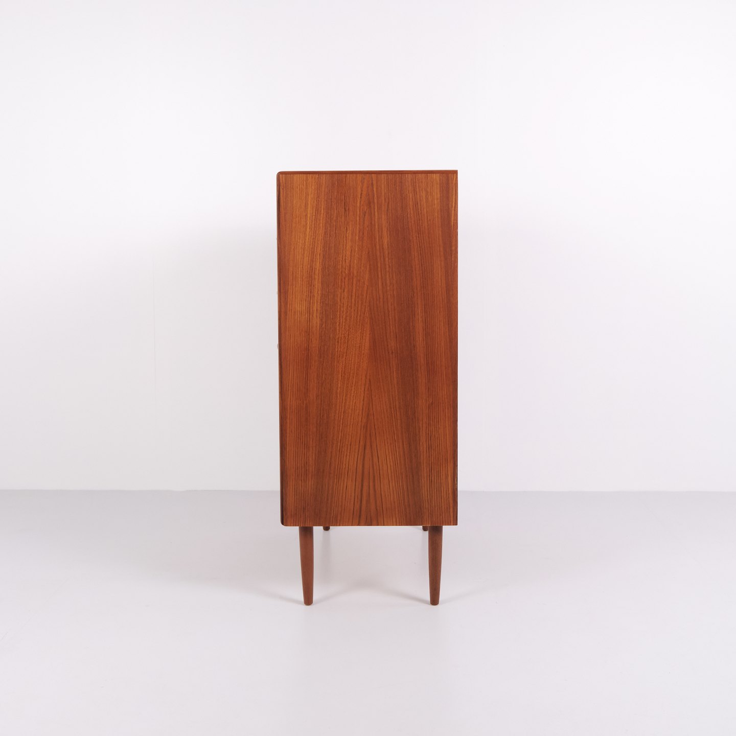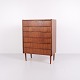 Beskrivelse: Kommode udført i teaktræ med seks skuffer og originale greb. Møblet er et eksempel på dansk møbeldesign fra 1950’erne, hvor fokus var på funktionalitet, opbevaringsløsninger og materialekvalitet. Den høje form med flere skuffer gør kommoden velegnet til både soveværelse, entré eller opholdsrum.