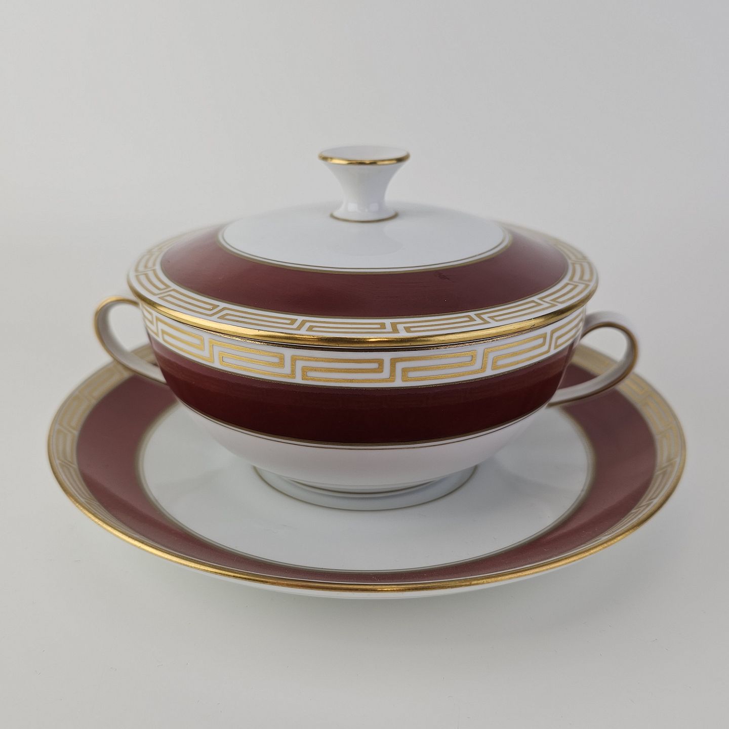 Service i porcelæn med rød bort, græsk inspireret guld bort og guldkant