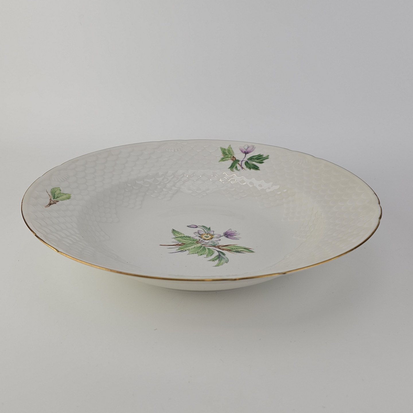Frigga Anemone er cremefarvet porcelæn dekoreret med motiv af anemoner og bøgeløv med guldkant